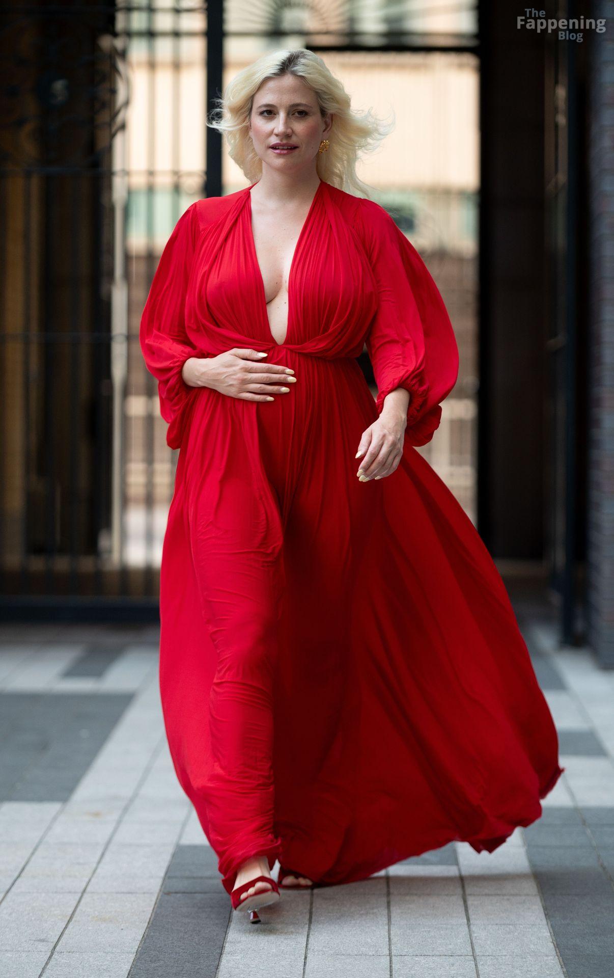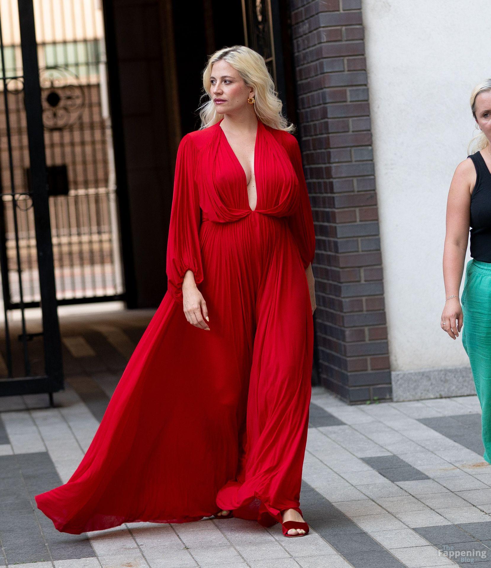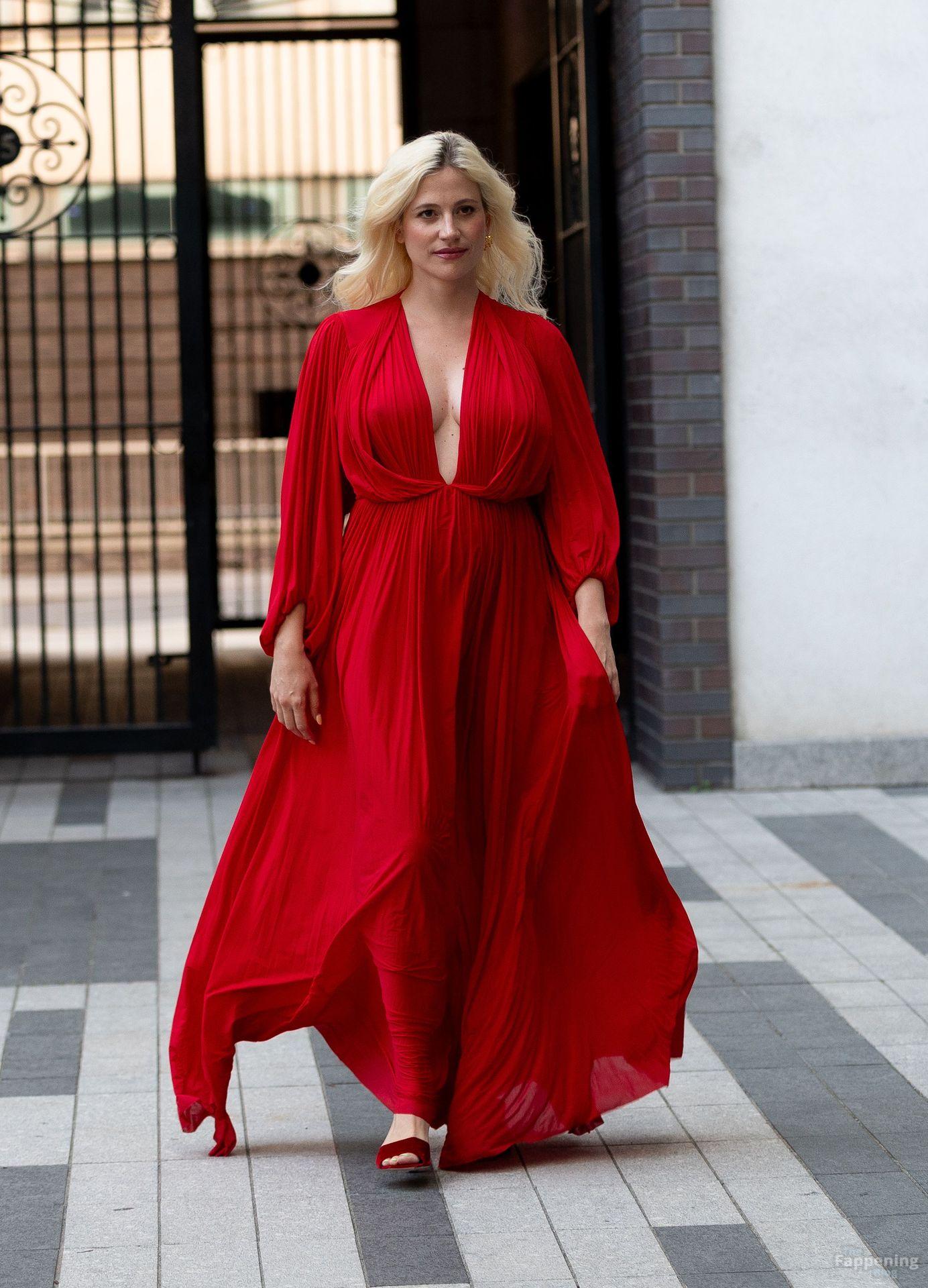 Pixie Lott est ici, sans soutien-gorge dans une robe rouge à décolleté plongeant, montrant son décolleté et ses tétons.