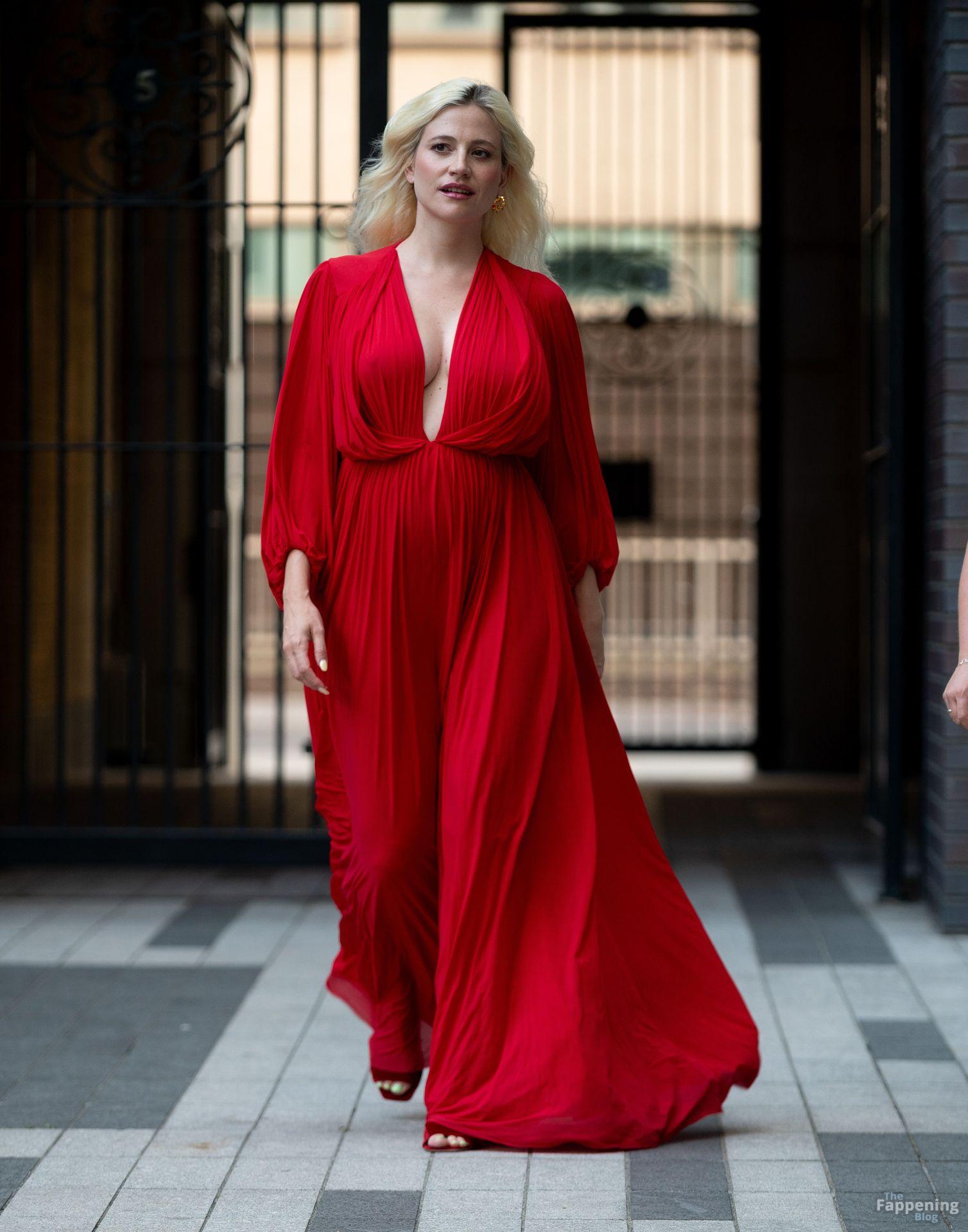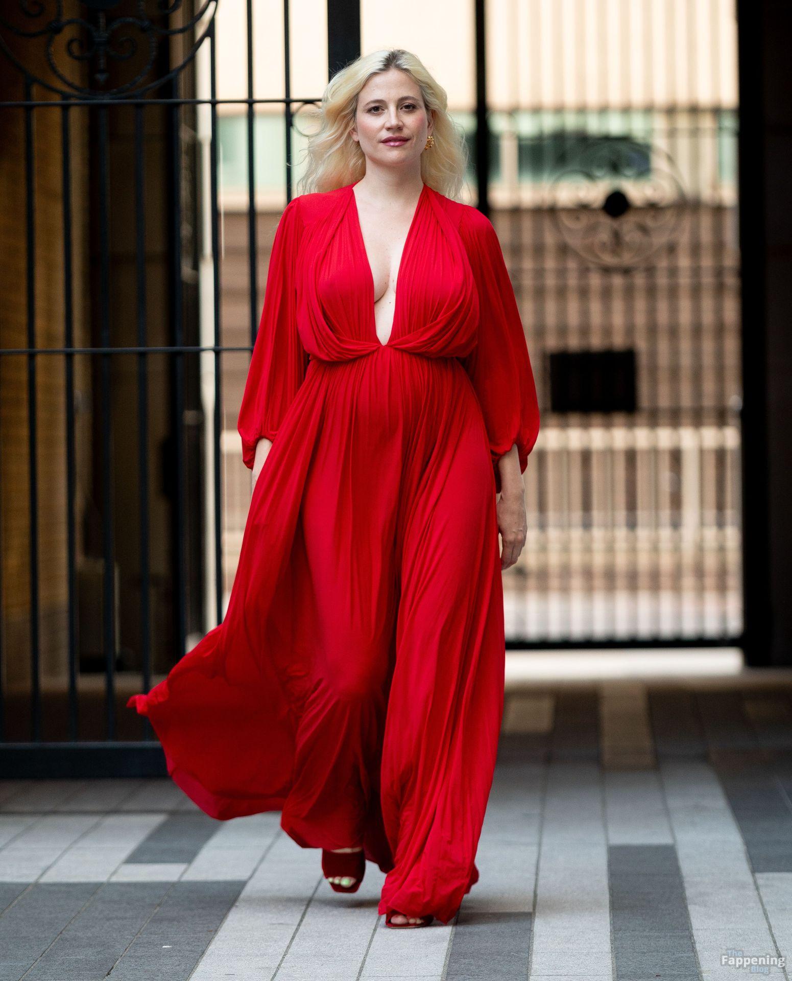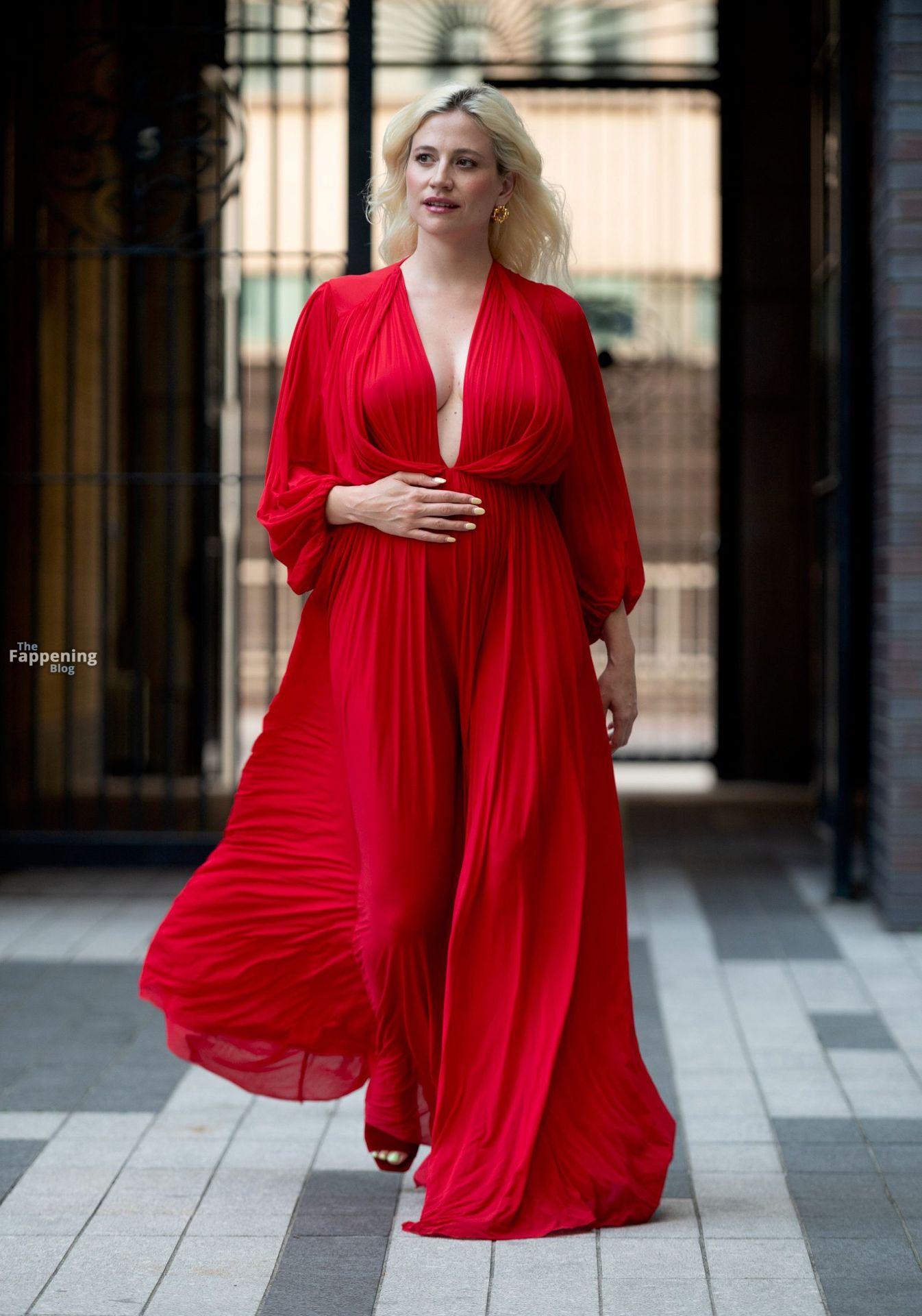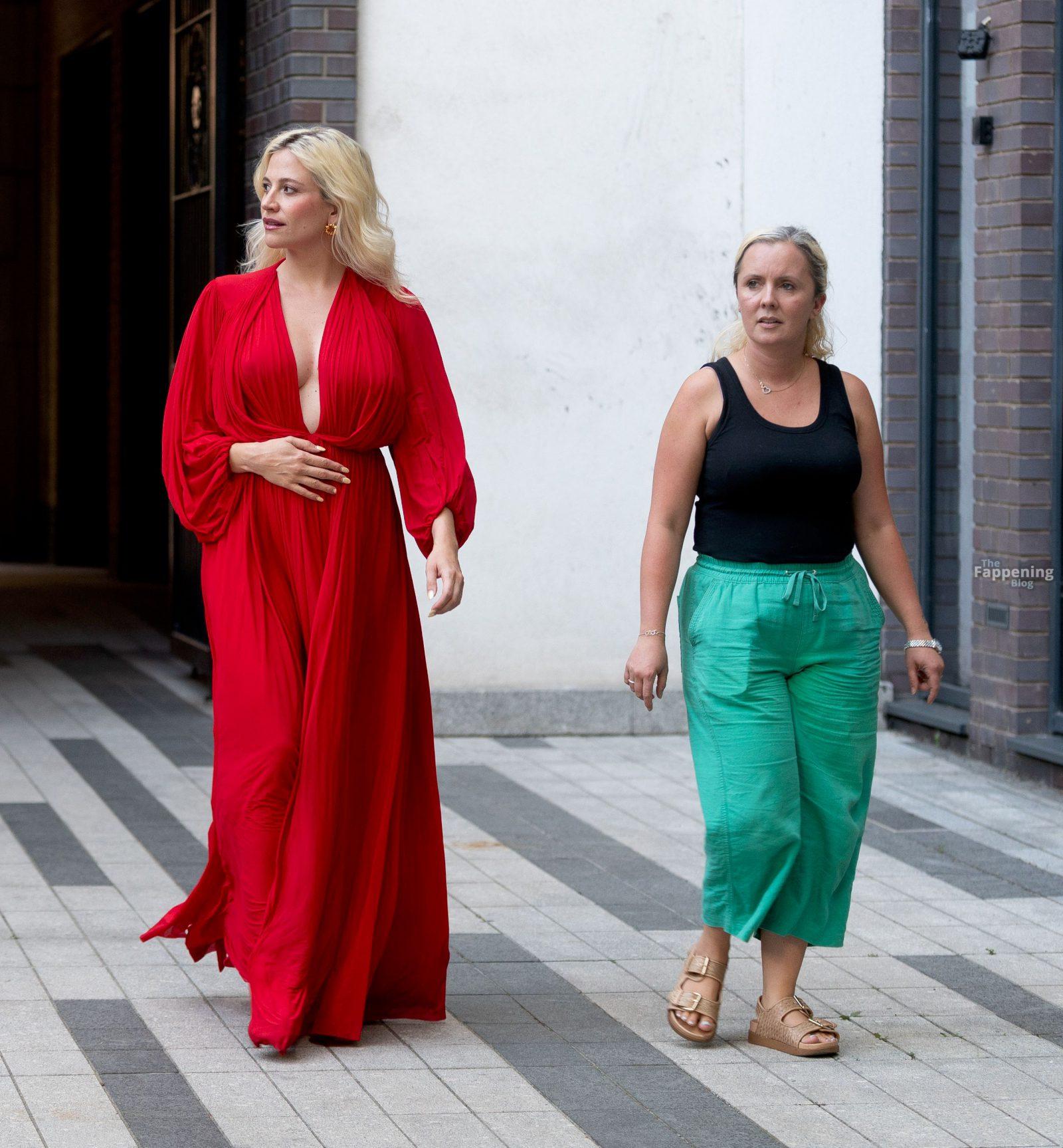 Pixie Lott est ici, sans soutien-gorge dans une robe rouge à décolleté plongeant, montrant son décolleté et ses tétons.