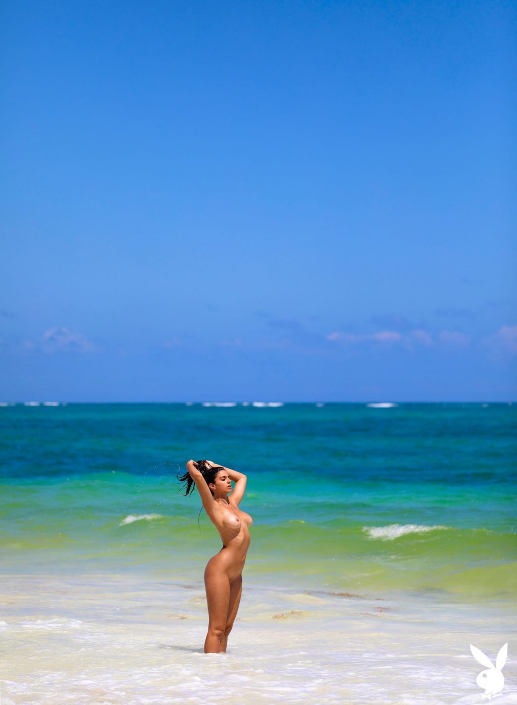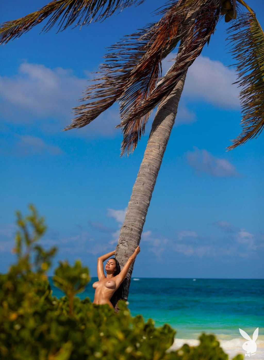 Priscilla Huggins Ortiz montre son corps nu et sexy sur la plage de Tulum, au Mexique, lors d’une séance photo réalisée par Ana Dias pour Playboy (2020).