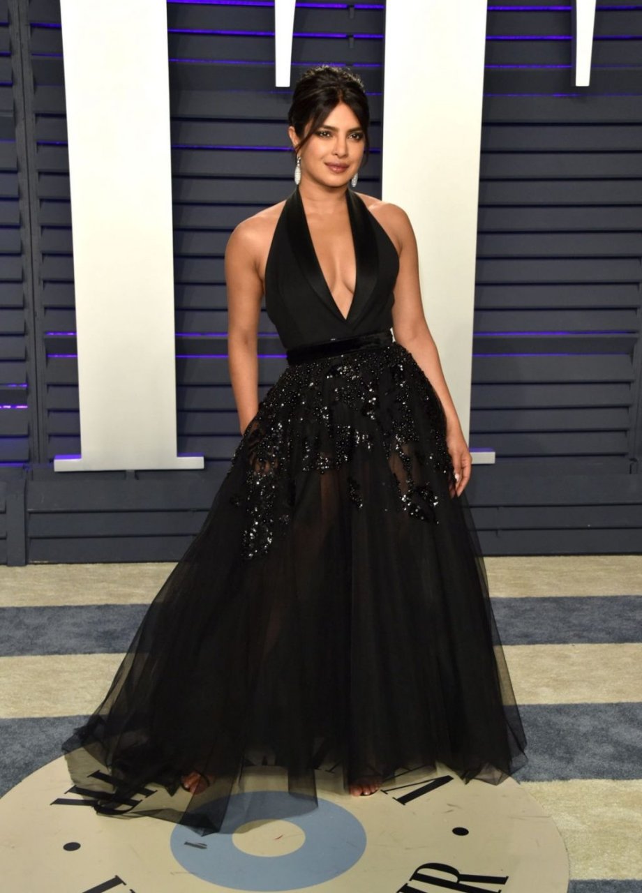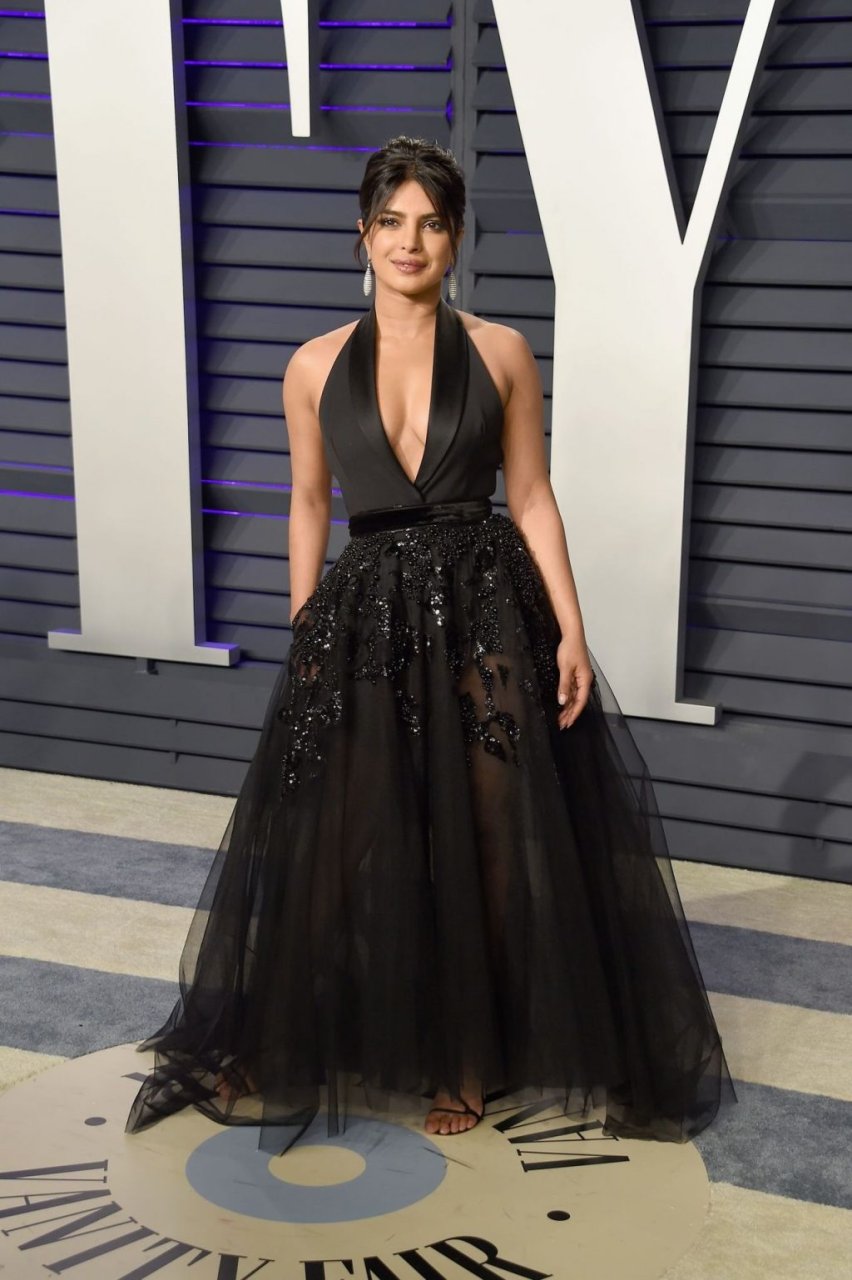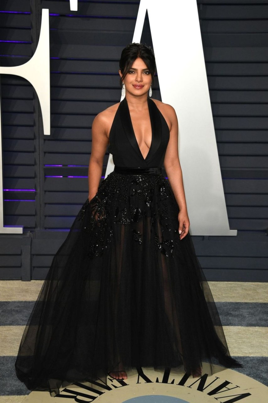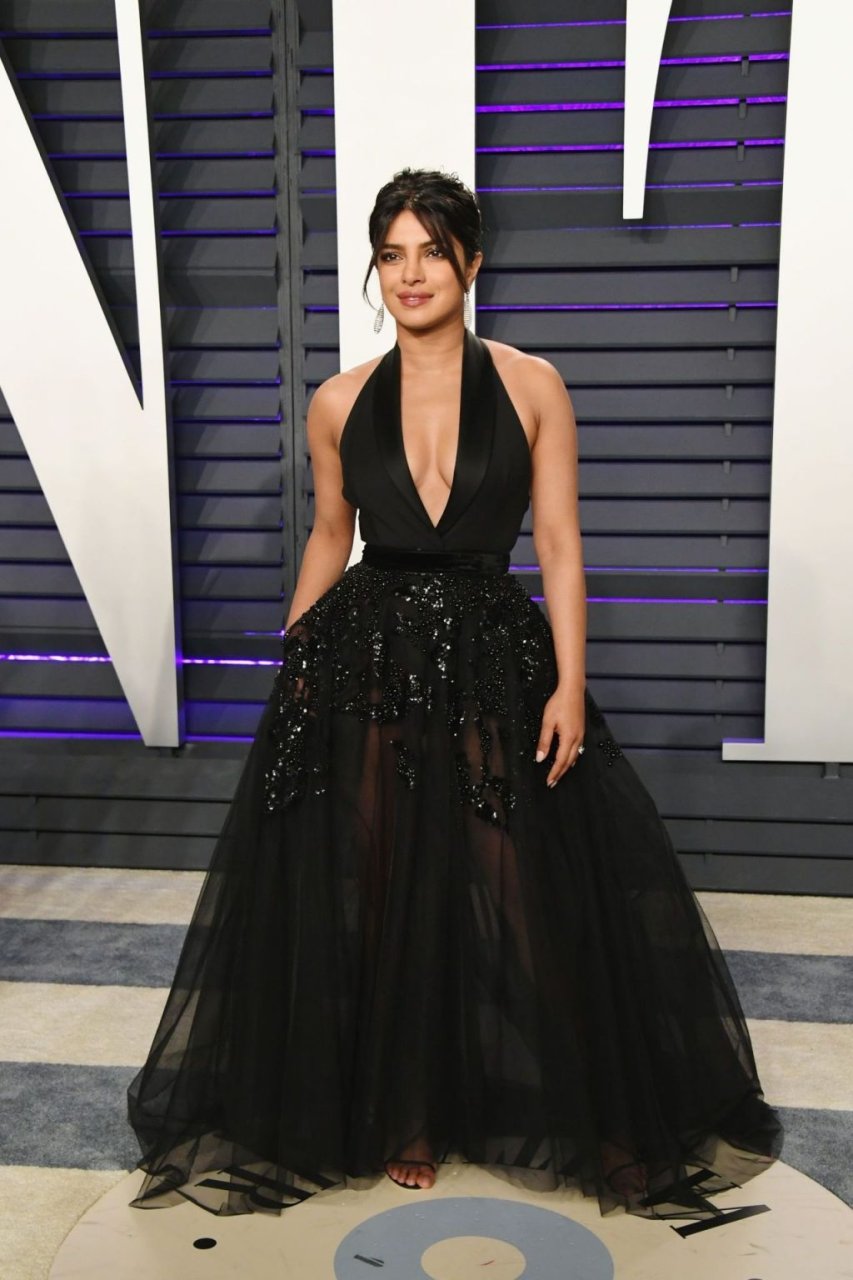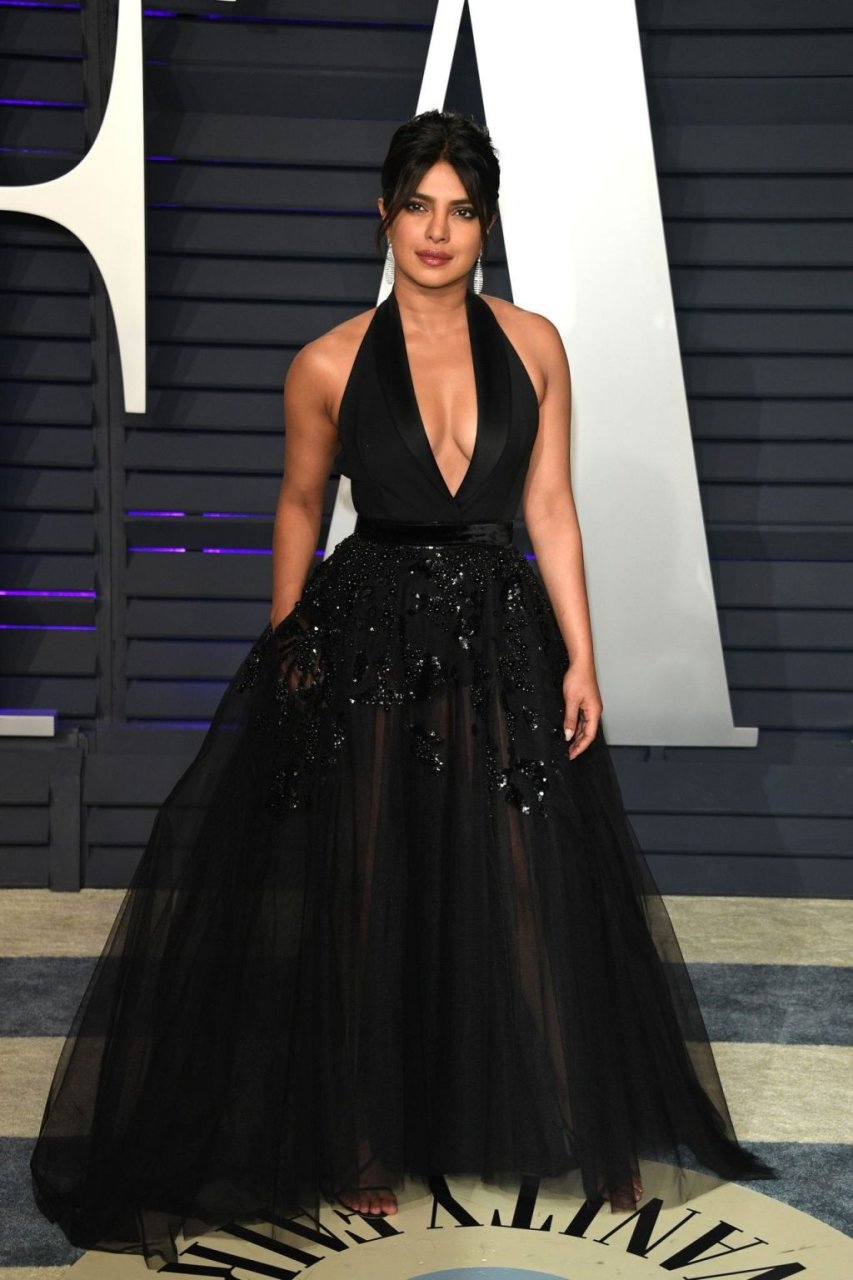 L’actrice Priyanka Chopra montre son décolleté en portant une robe noire à la Vanity Fair Oscar Party 2019 à Beverly Hills, le 24/02/2019.