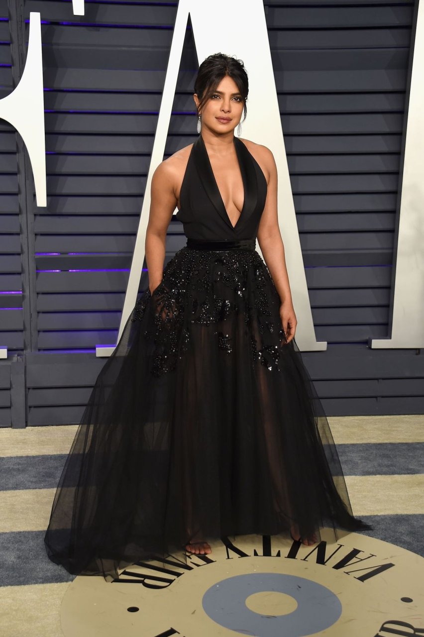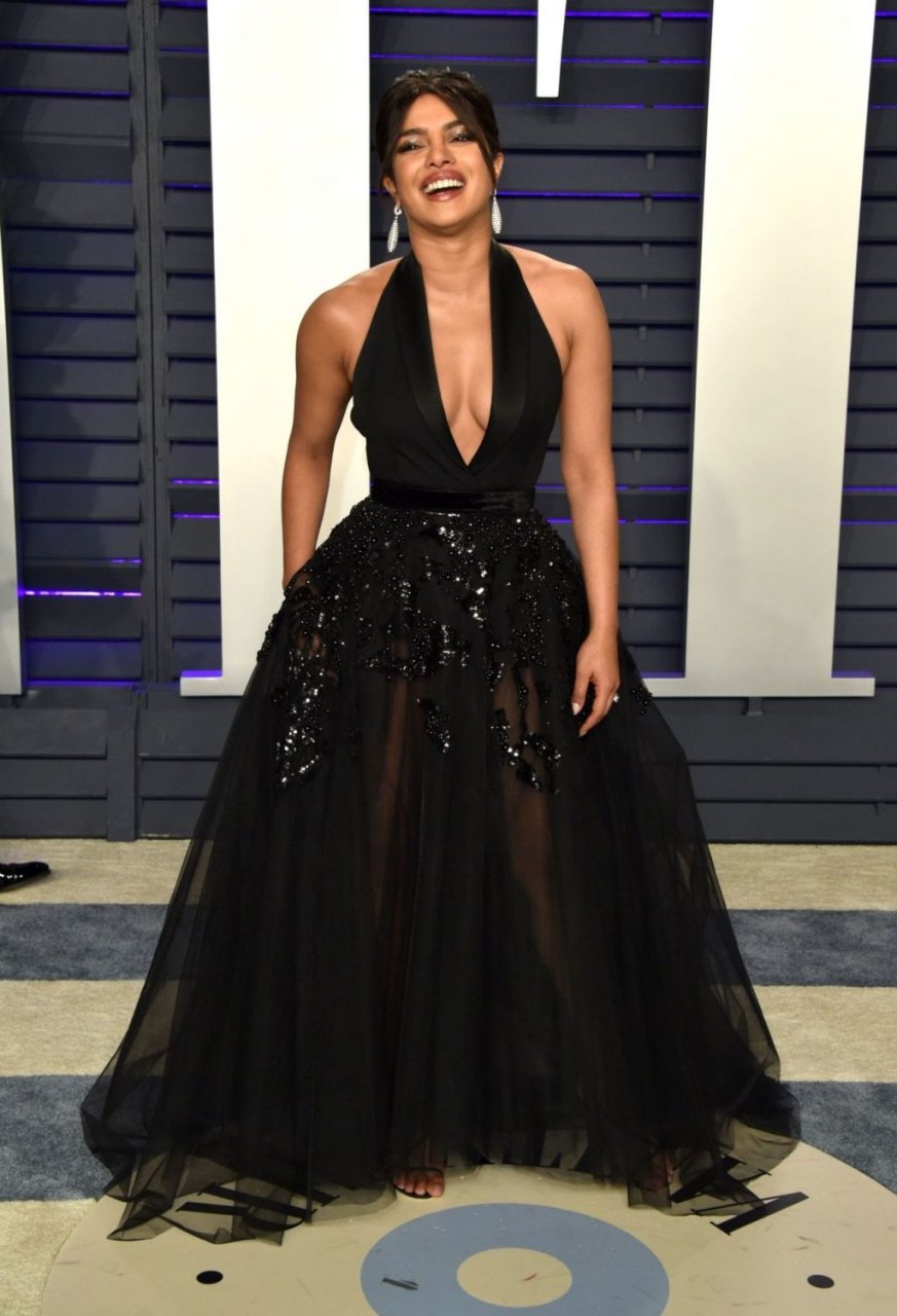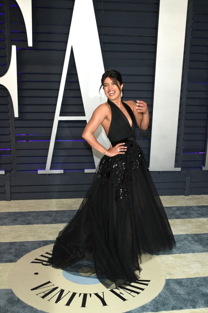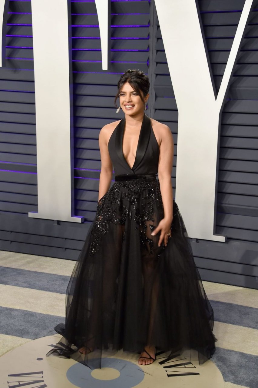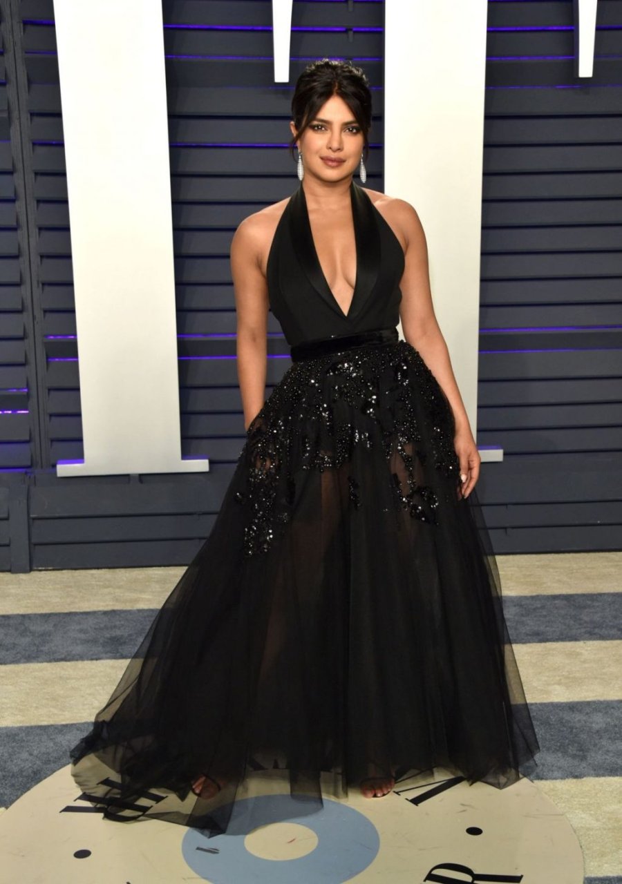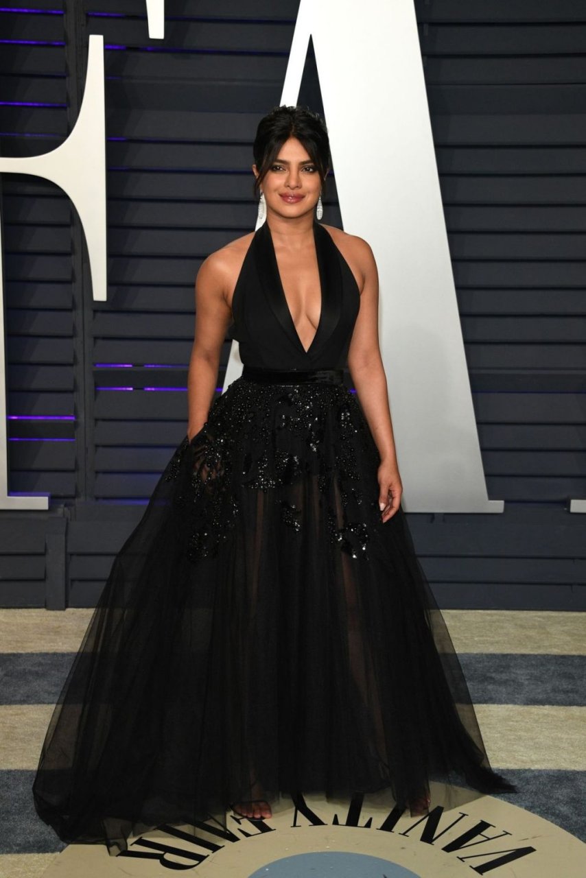 L’actrice Priyanka Chopra montre son décolleté en portant une robe noire à la Vanity Fair Oscar Party 2019 à Beverly Hills, le 24/02/2019.