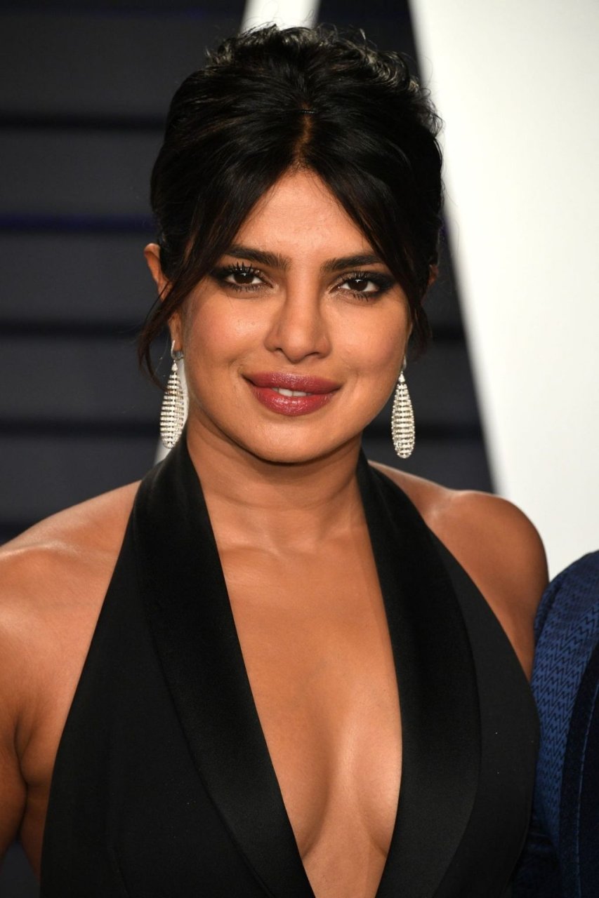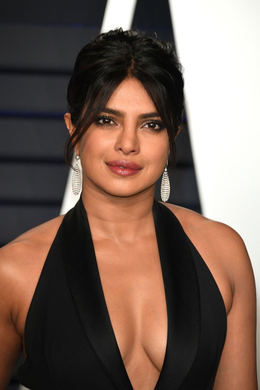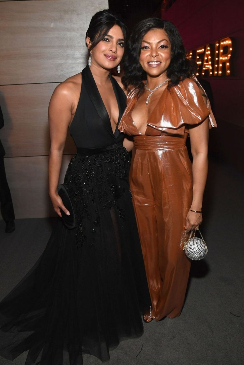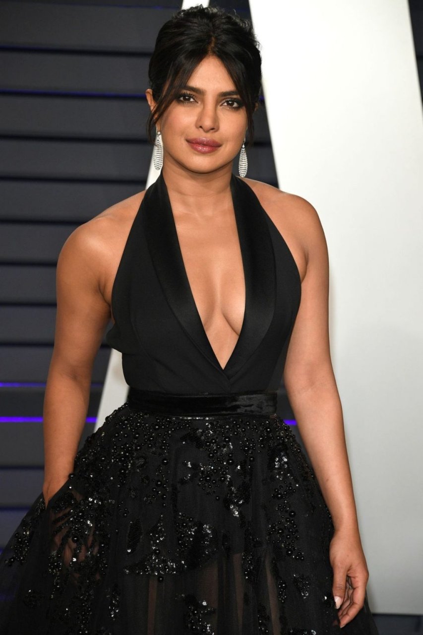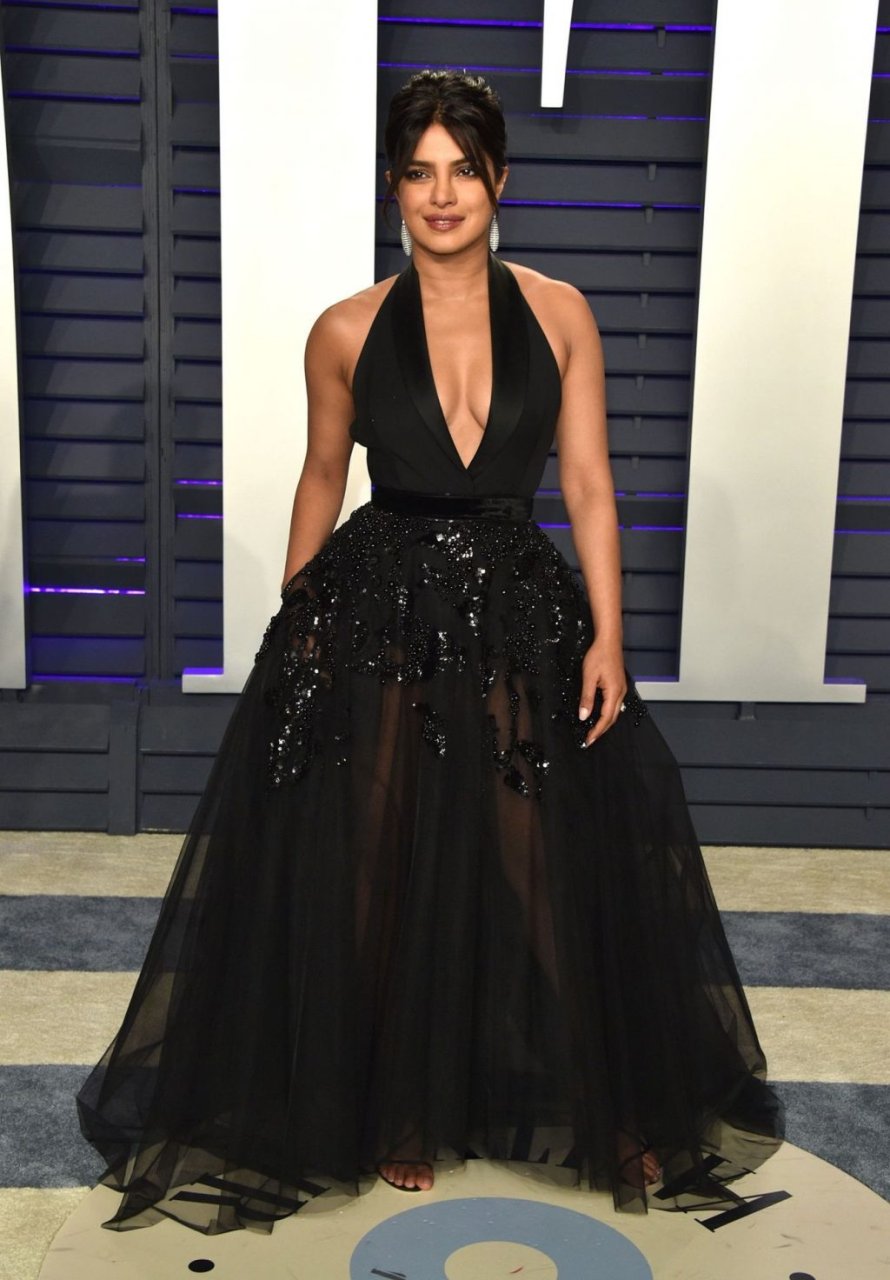 L’actrice Priyanka Chopra montre son décolleté en portant une robe noire à la Vanity Fair Oscar Party 2019 à Beverly Hills, le 24/02/2019.