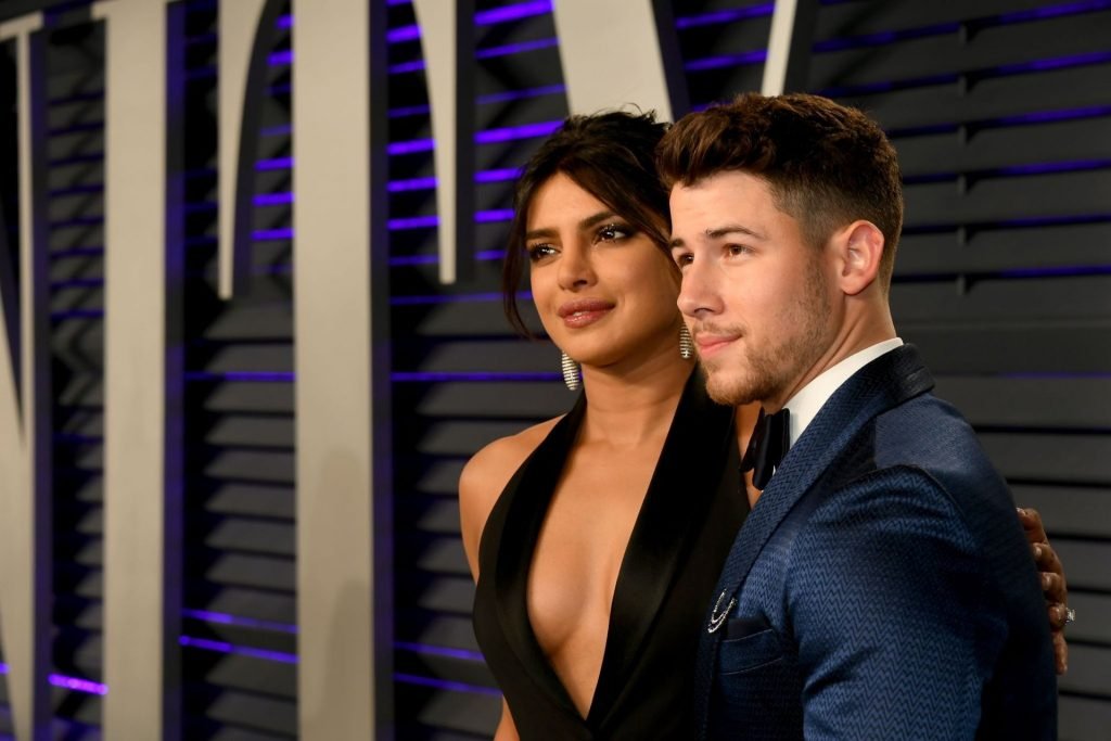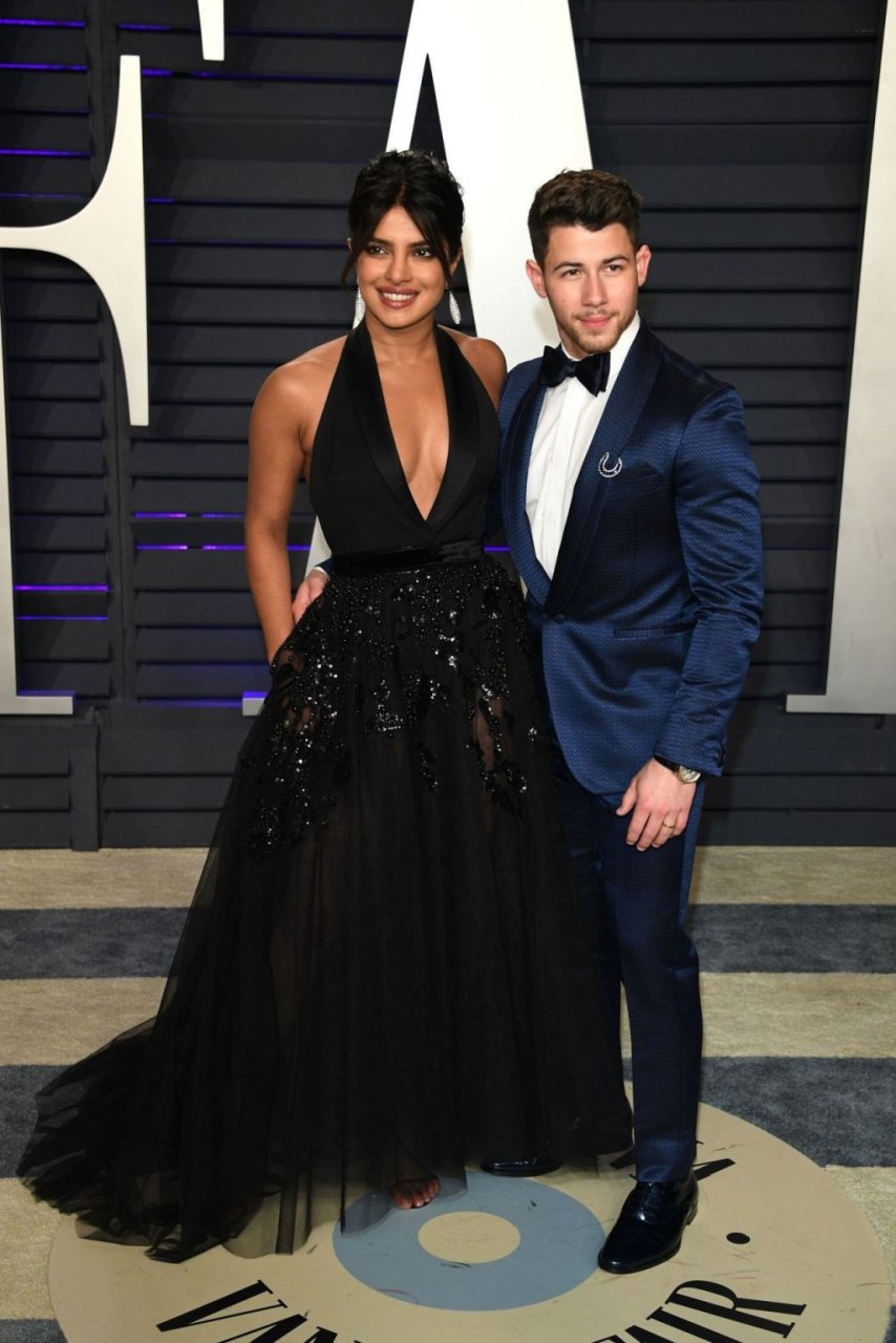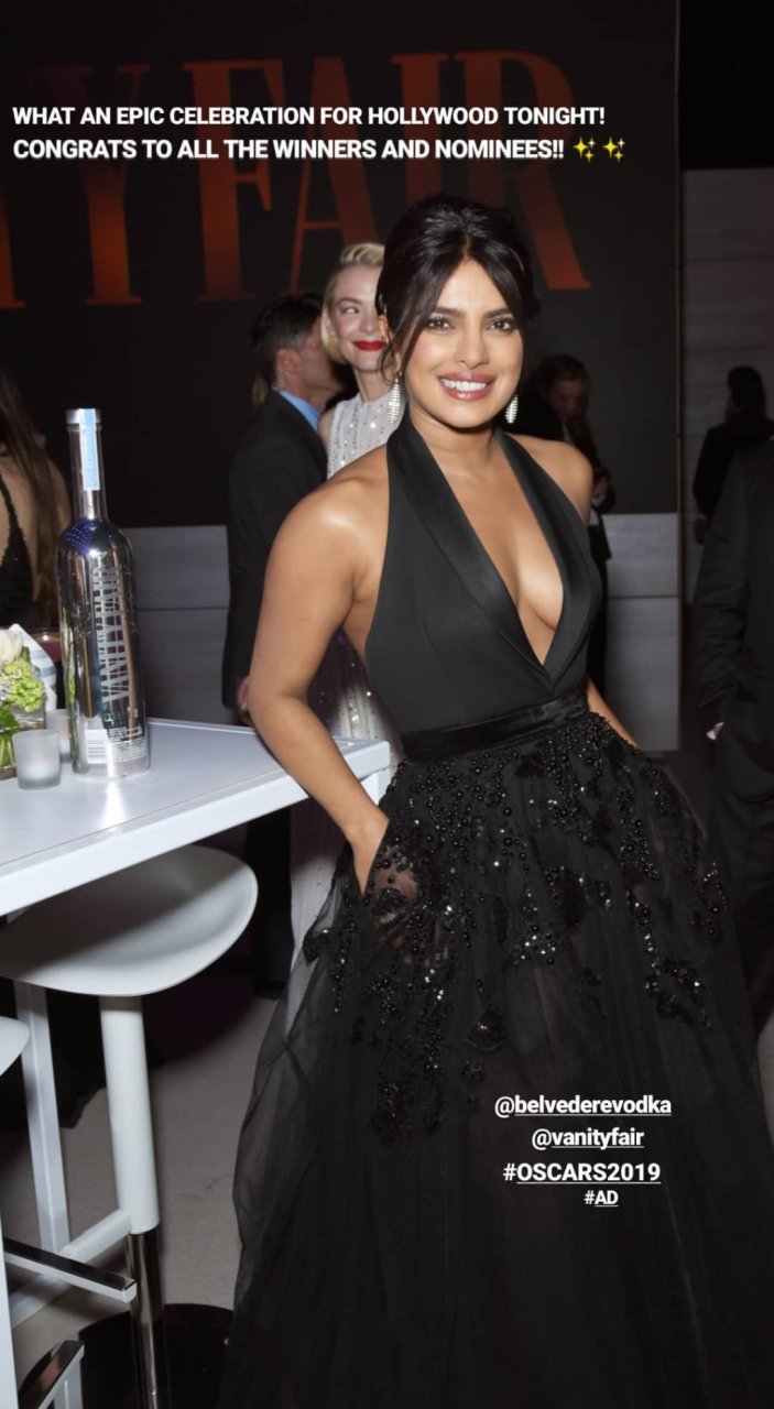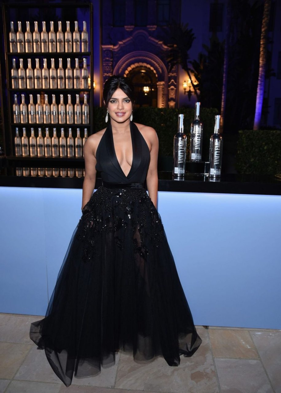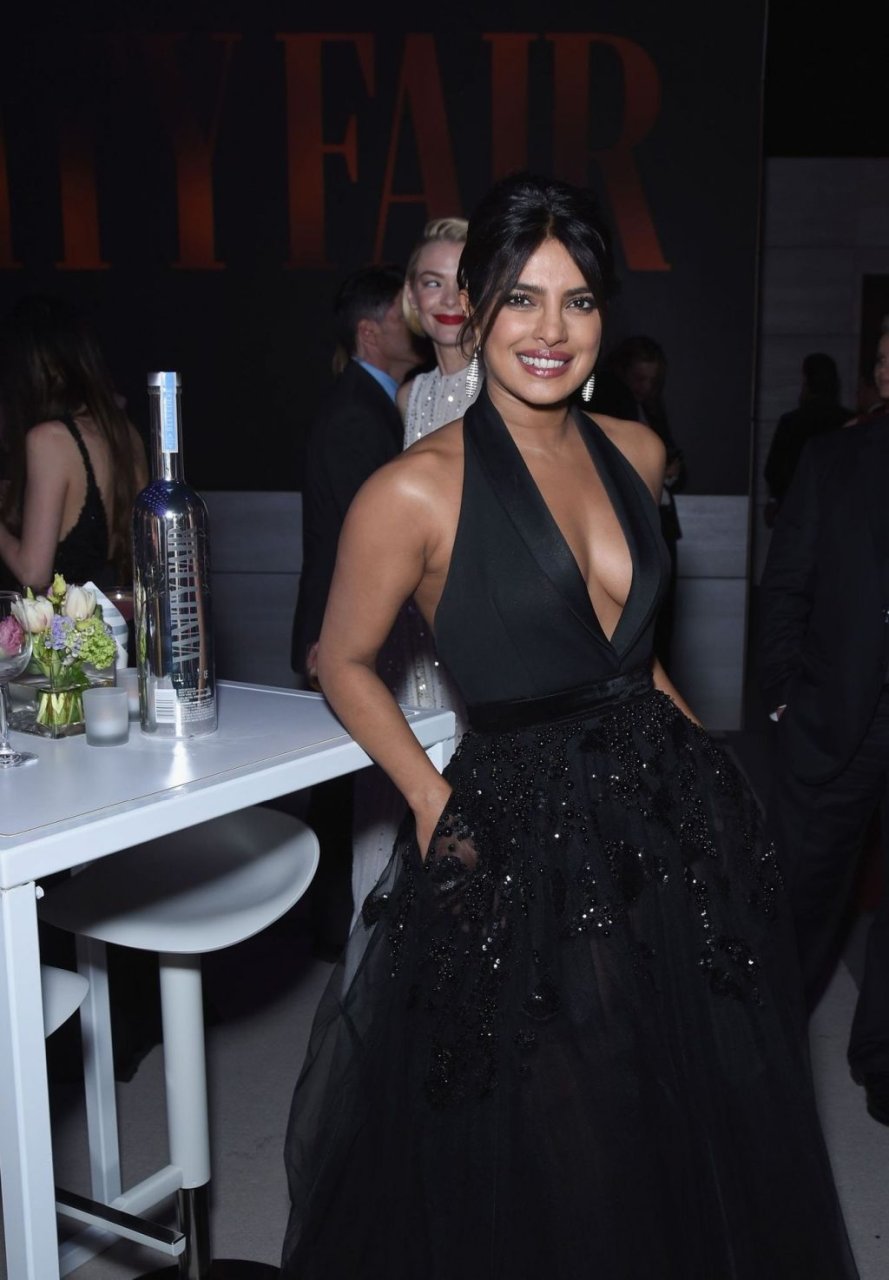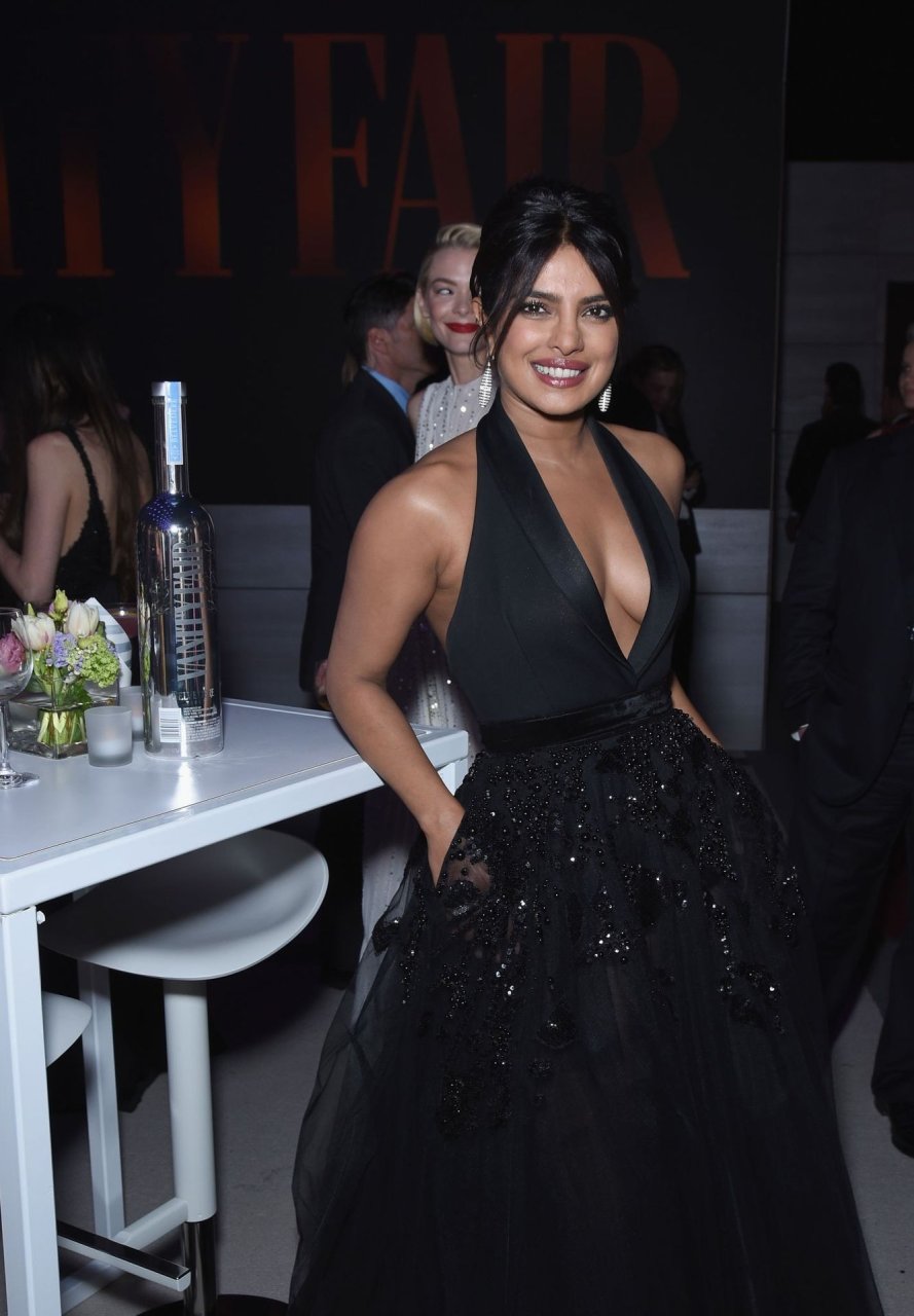 L’actrice Priyanka Chopra montre son décolleté en portant une robe noire à la Vanity Fair Oscar Party 2019 à Beverly Hills, le 24/02/2019.