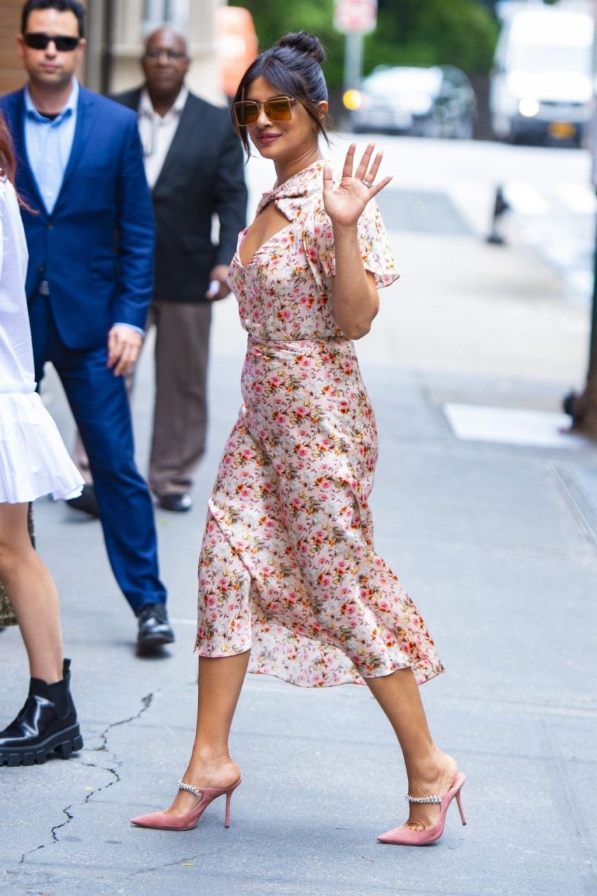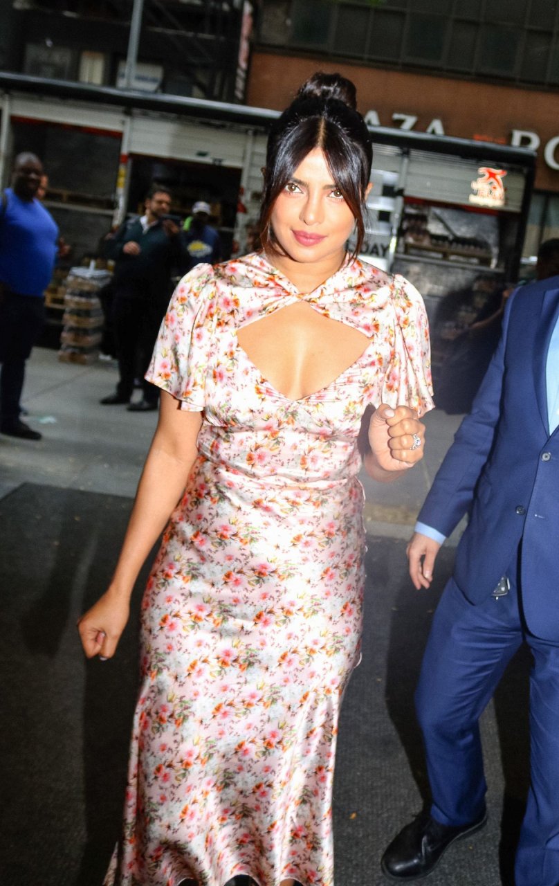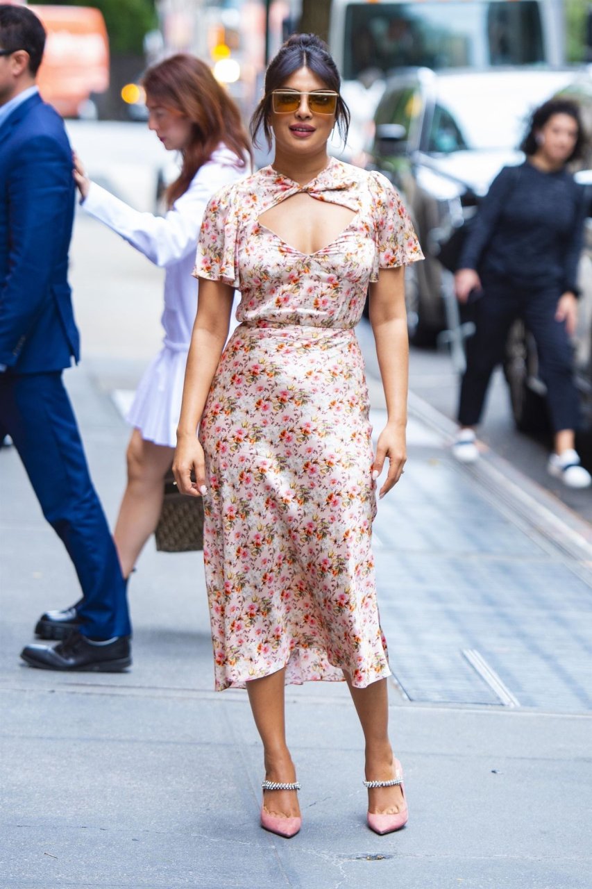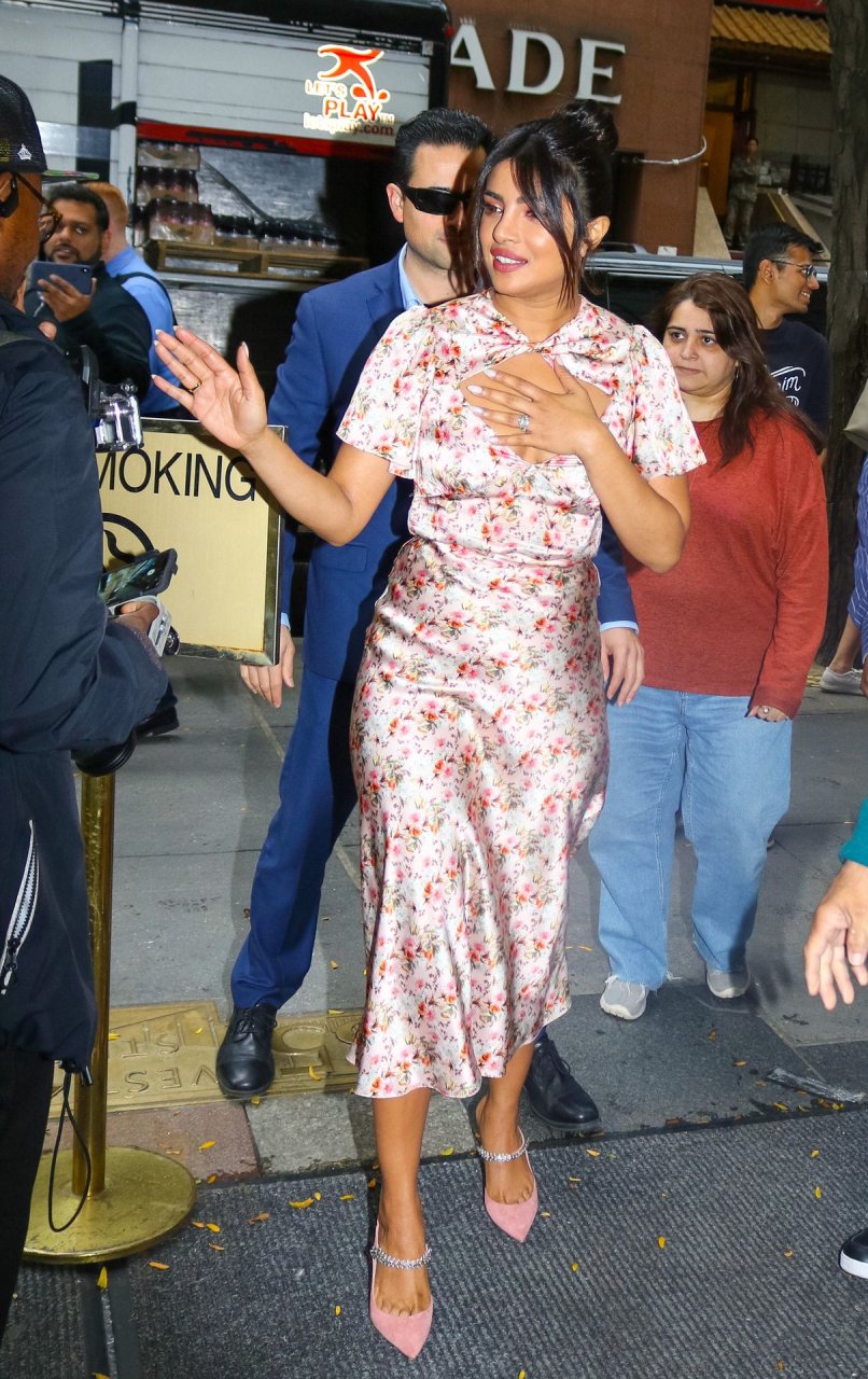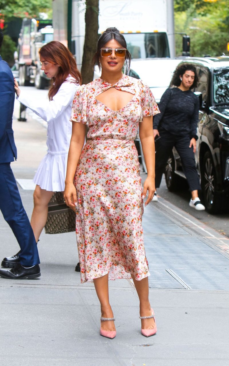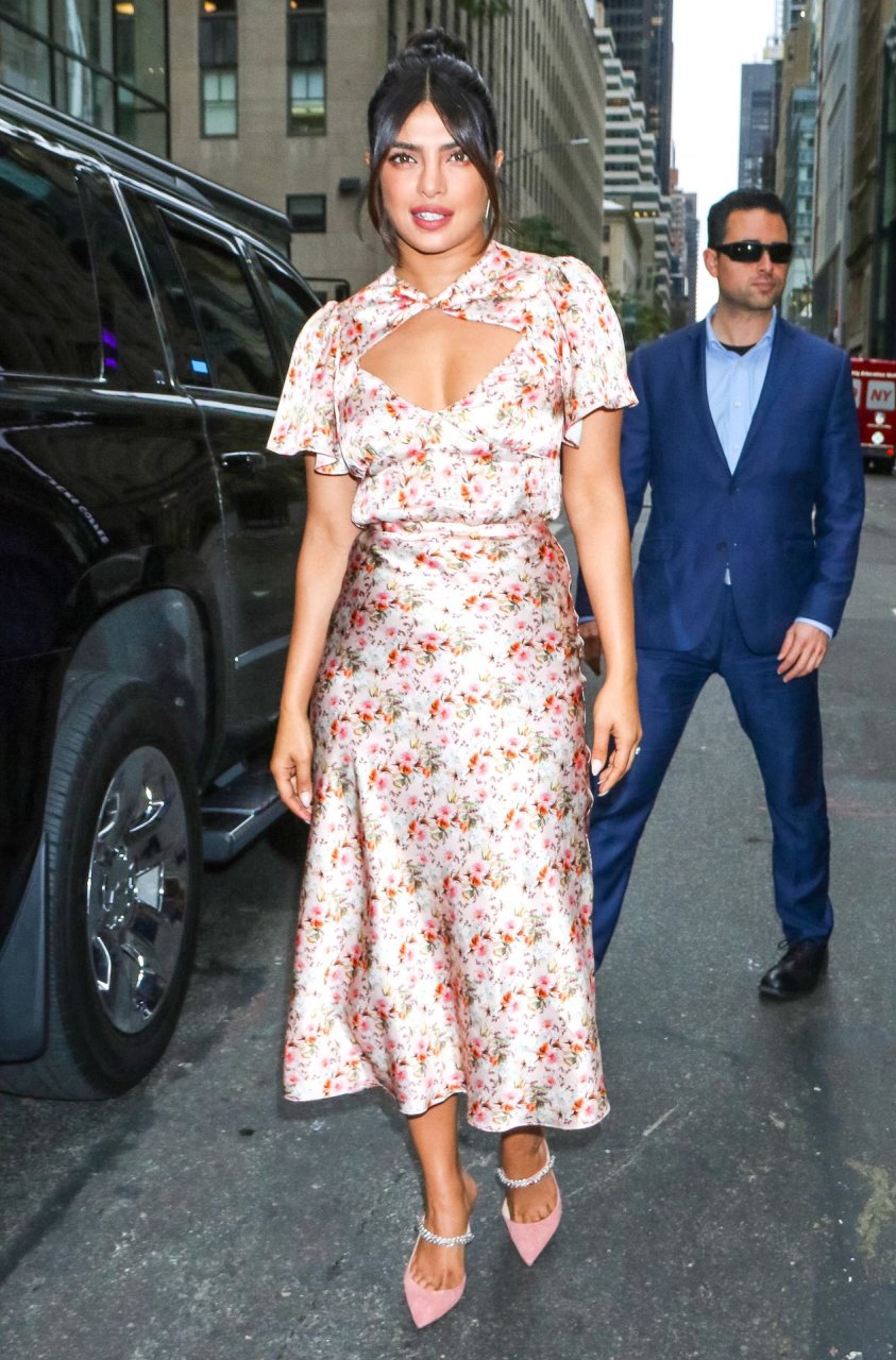 L’actrice Priyanka Chopra est magnifique dans une robe fleurie rose alors qu’elle est vue après avoir visité The View à New York, le 08/10/2019.