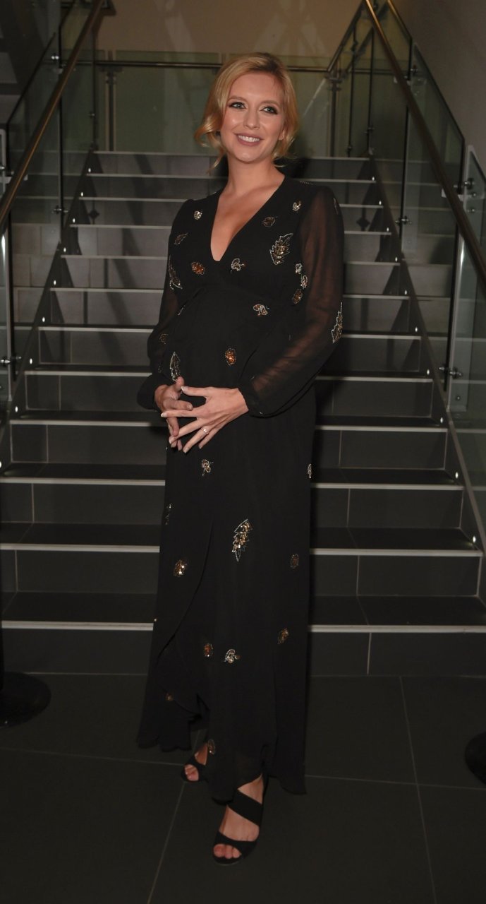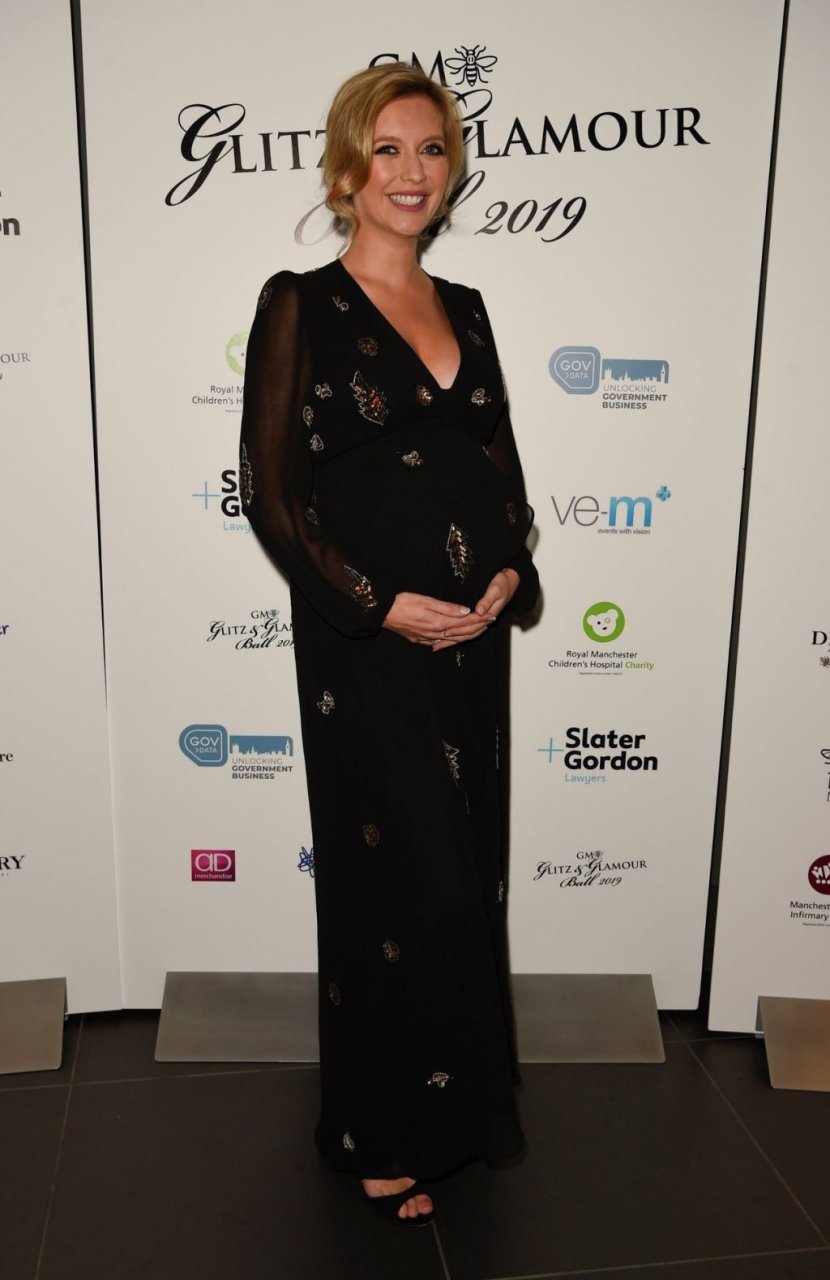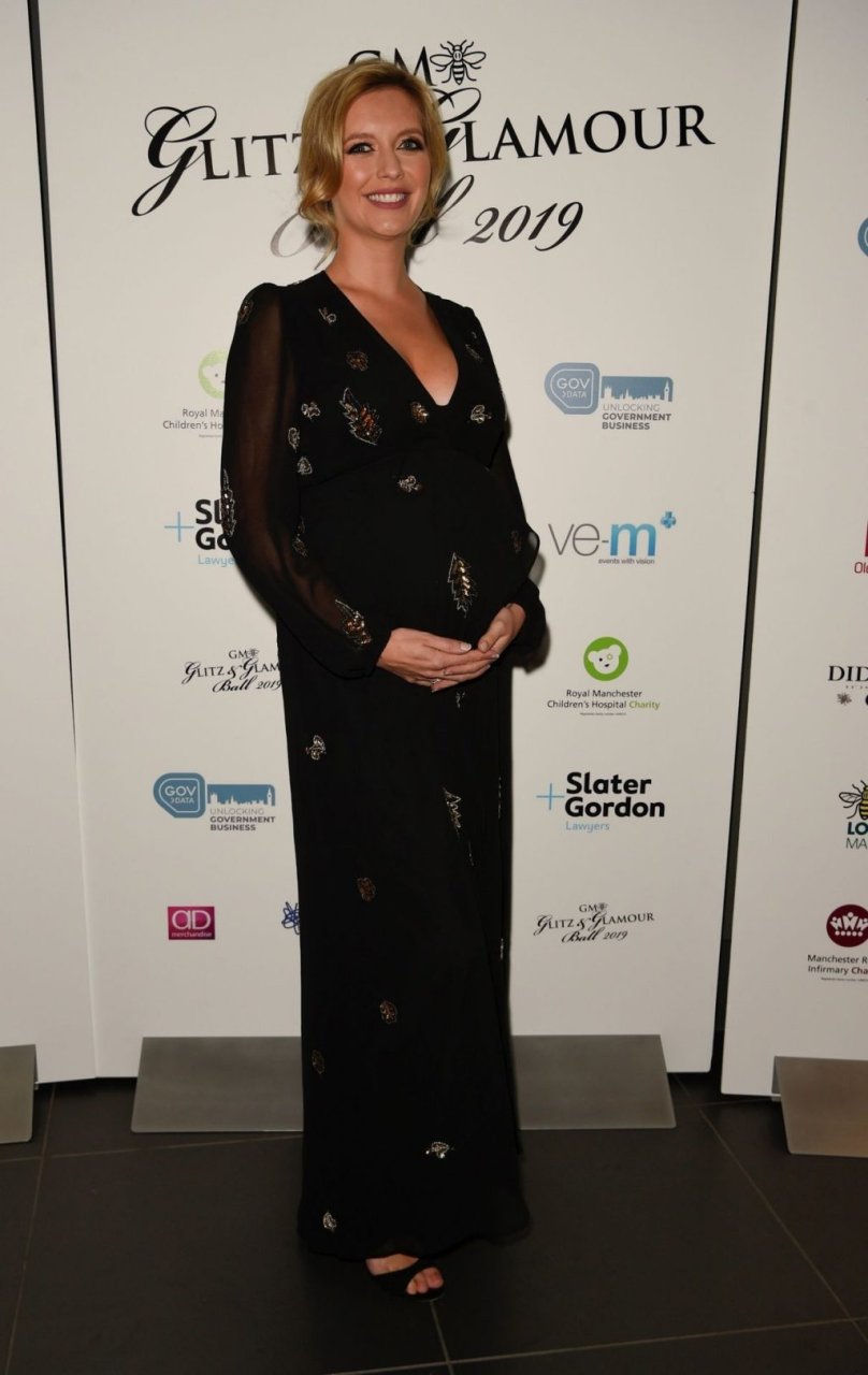 La présentatrice de télévision anglaise Rachel Riley a été photographiée montrant son ventre de plus en plus arrondi lors du Bal de charité de la police du Grand Manchester au Emirates Stadium Cricket Ground à Manchester, le 10/04/2019.