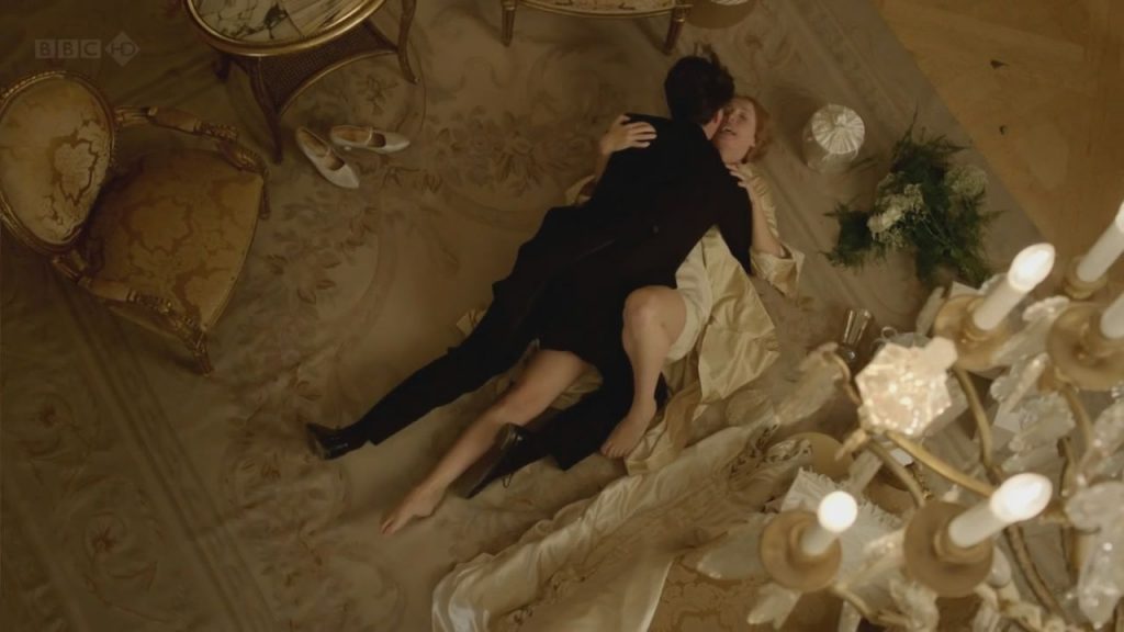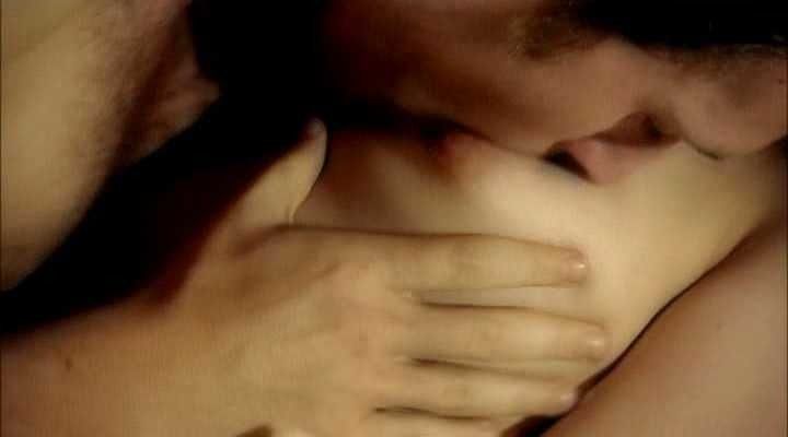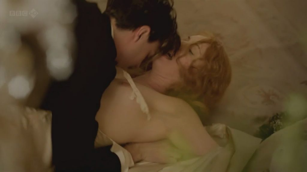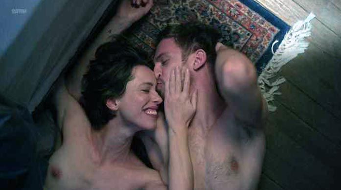 Bella Heathcote is nude underneath a see-through white dress. Showing her nipples through before she and Rebecca Hall roll around on the floor together and lesbian kiss. Bella then opens Rebecca’s coat and bares her breasts, kissing Rebecca on the chest. A guy then gets involved for a threesome, Bella having sex on top of him as Rebecca leans over to kiss Bella at the same time.