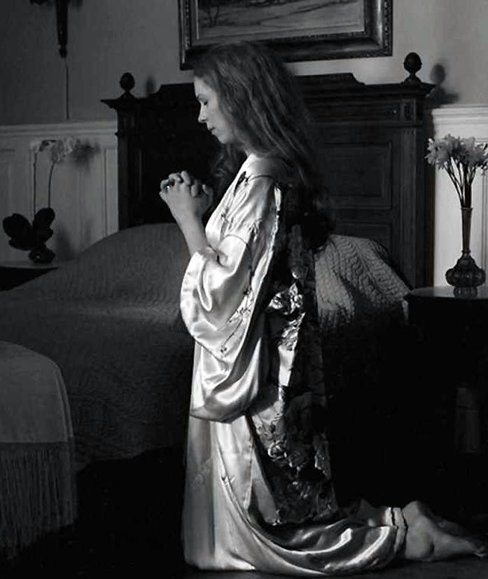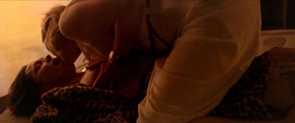 Rebecca Hall is rolling over on a bed and lesbian kissing Bella Heathcoate. We see her standing by the bed, undressing and showing a see-through bra with her nipples visible underneath. We then see her in a nightie leading Bella and a guy downstairs, Bella wearing a nurse’s outfit. The girls kiss some more as Bella ties Rebecca and the guy up with some rope.