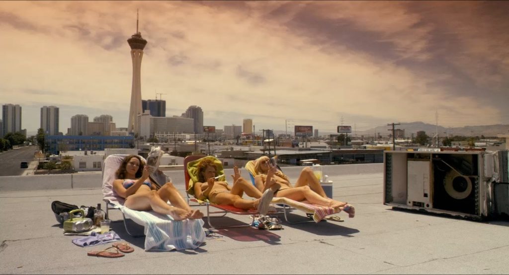 Laura Prepon is sunbathing topless on a rooftop beside Jo Newman, who also shows her breasts, and Rebecca Hall, who is wearing a bikini. Laura is on the right in a pair of sunglasses, Jo is in the middle, and Rebecca is on the left.