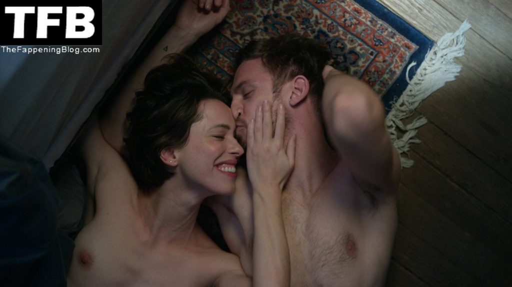 Rebecca Hall is lying topless on her back on the floor next to a bed, her right breast in view as a guy lies next to her and leans over to kiss her. From Permission.