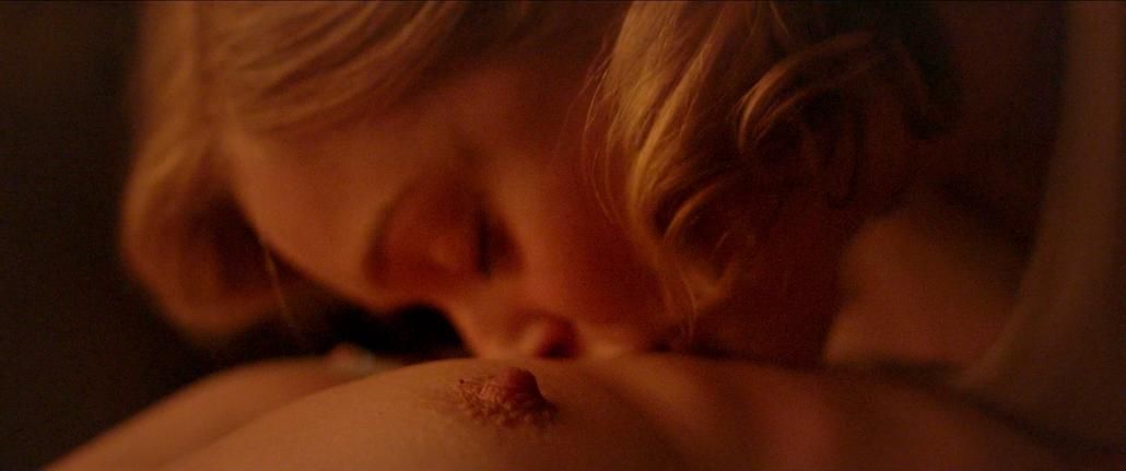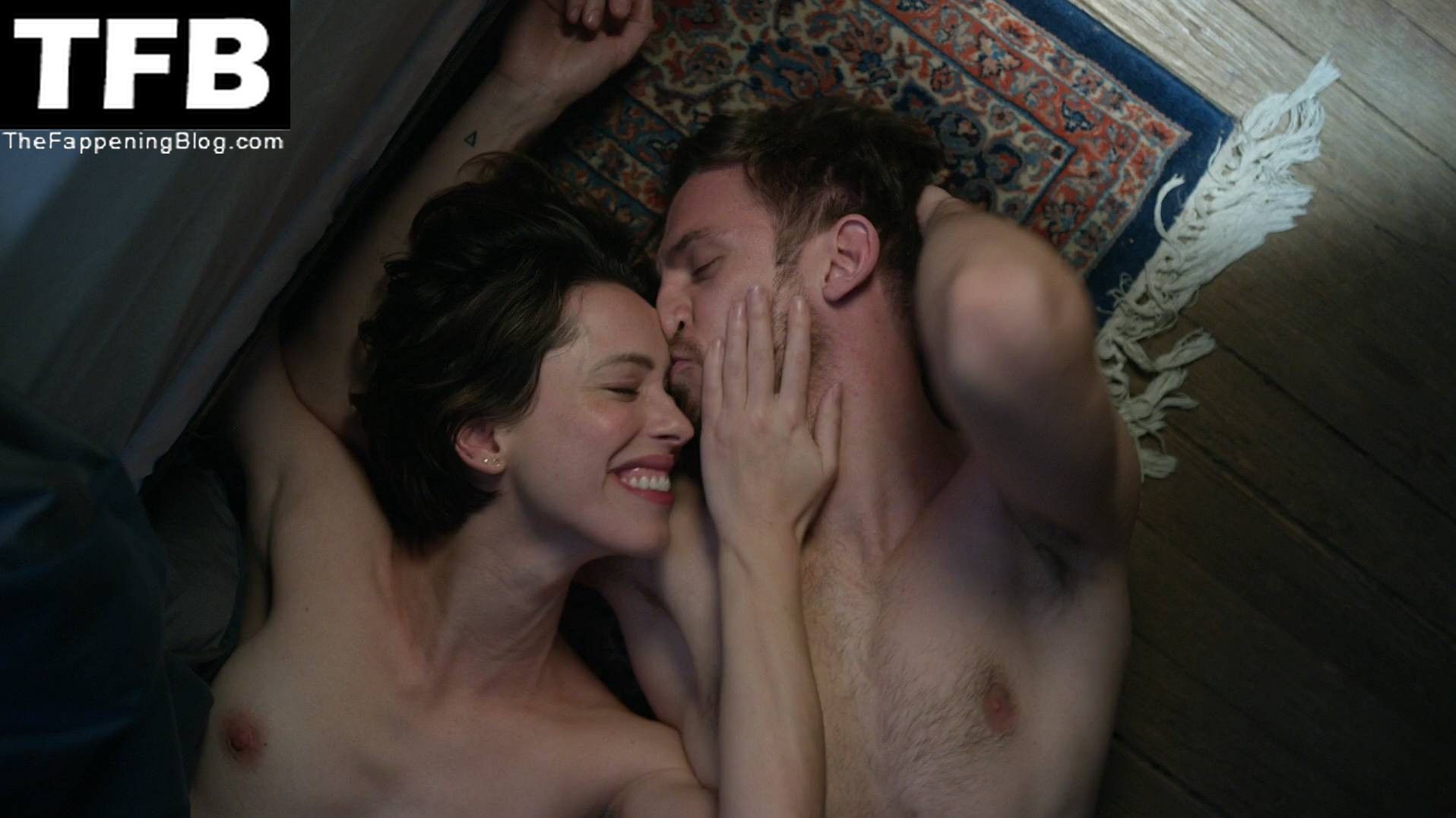 Bella Heathcote is nude underneath a see-through white dress. Showing her nipples through before she and Rebecca Hall roll around on the floor together and lesbian kiss. Bella then opens Rebecca’s coat and bares her breasts, kissing Rebecca on the chest. A guy then gets involved for a threesome, Bella having sex on top of him as Rebecca leans over to kiss Bella at the same time.