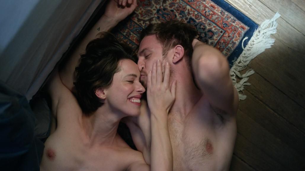 Rebecca Hall is lying topless on her back on the floor next to a bed, her right breast in view as a guy lies next to her and leans over to kiss her. From Permission.