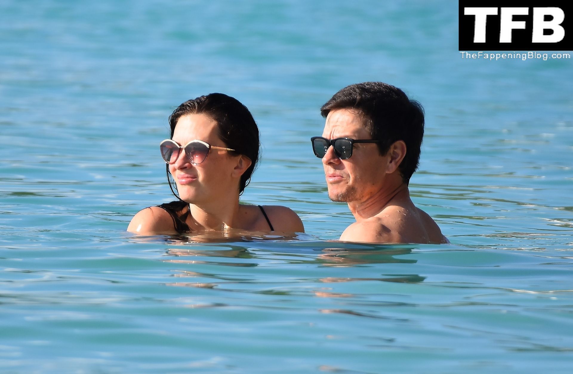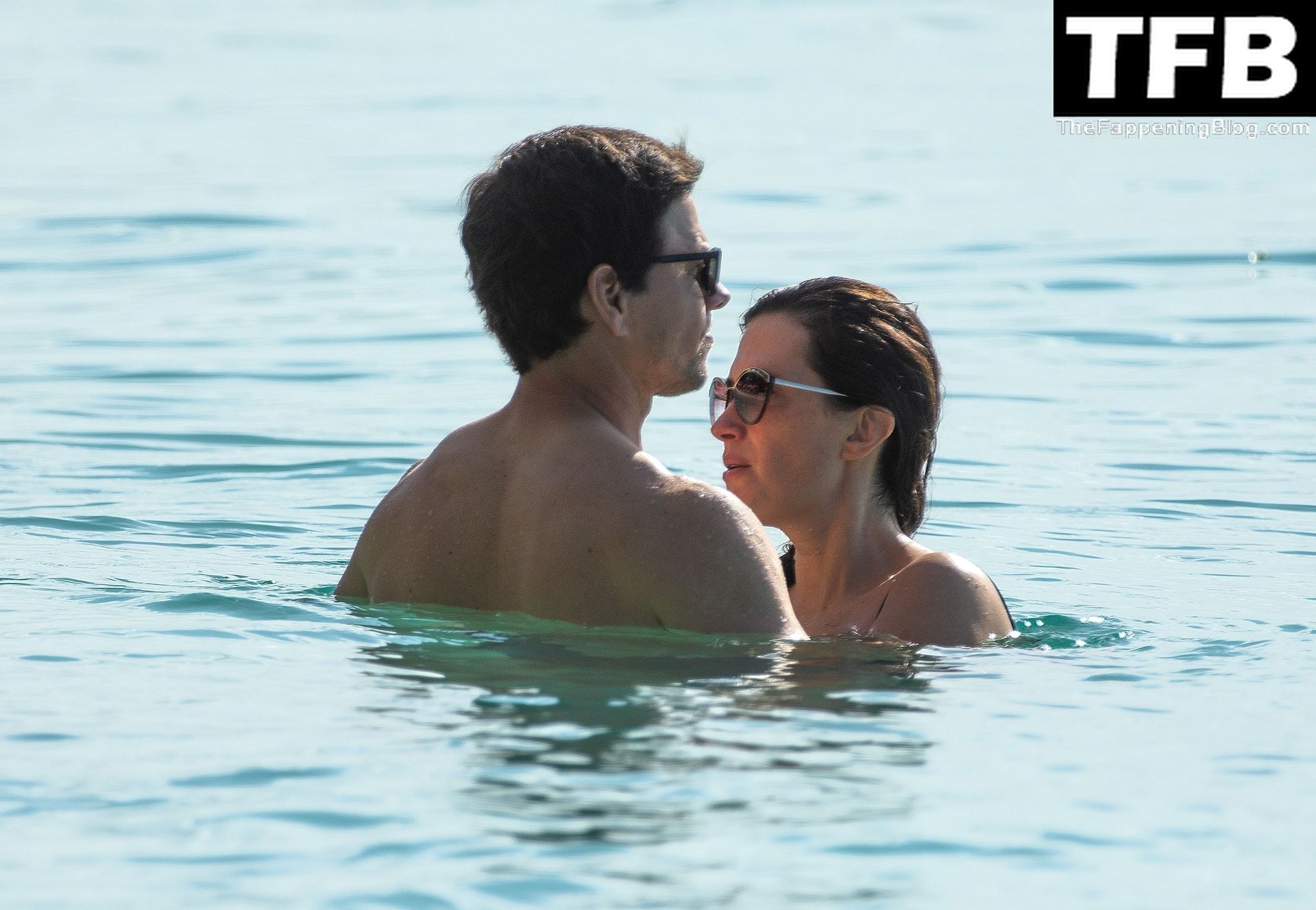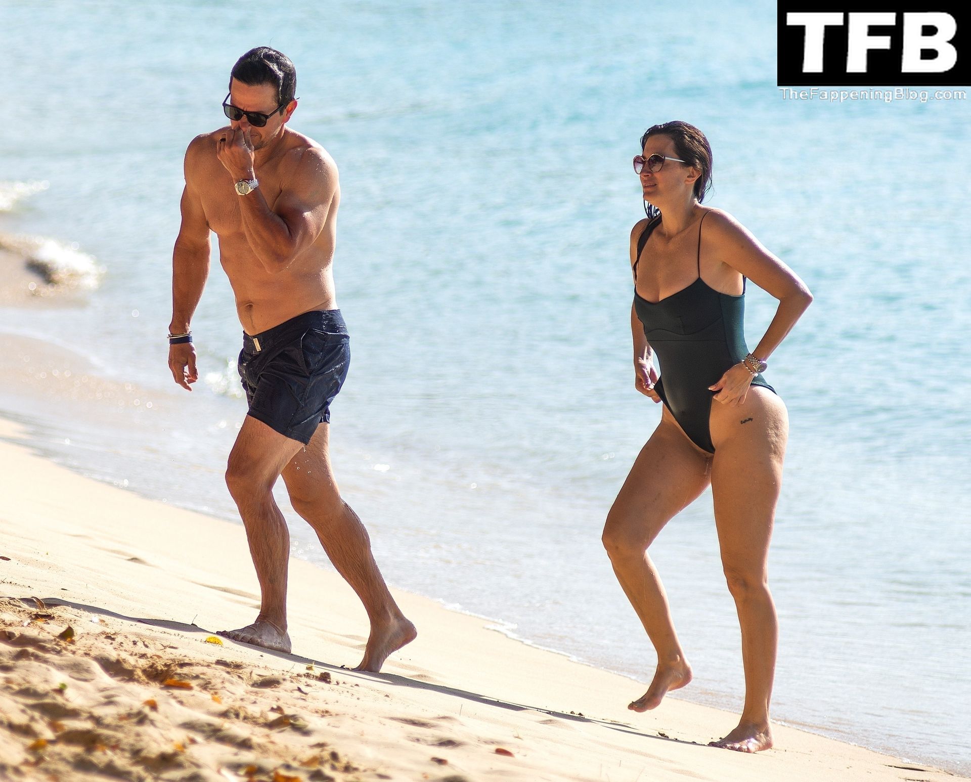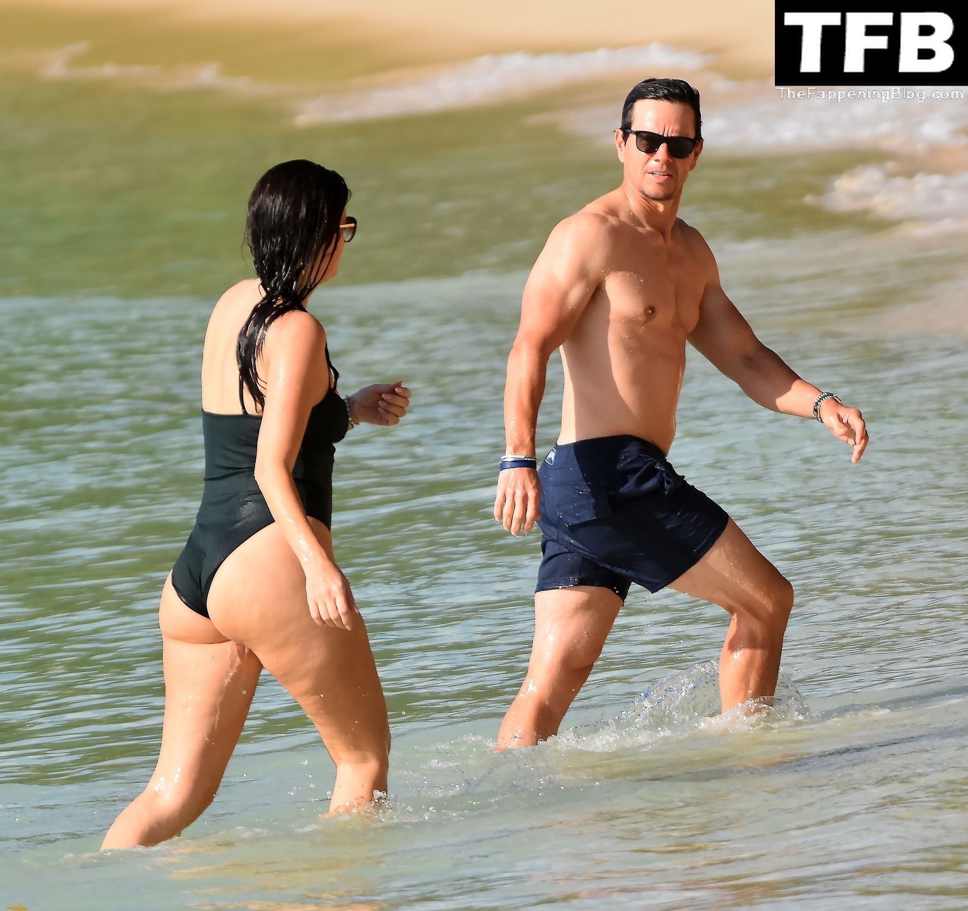 L’acteur américain Mark Wahlberg et sa femme Rhea Durham affichent leur amour et leur affection en se baignant dans la mer lors de vacances en famille sur la magnifique île des Caraïbes de la Barbade, sur la plage de l’hôtel Sandy Lane, le 22/12/2022.