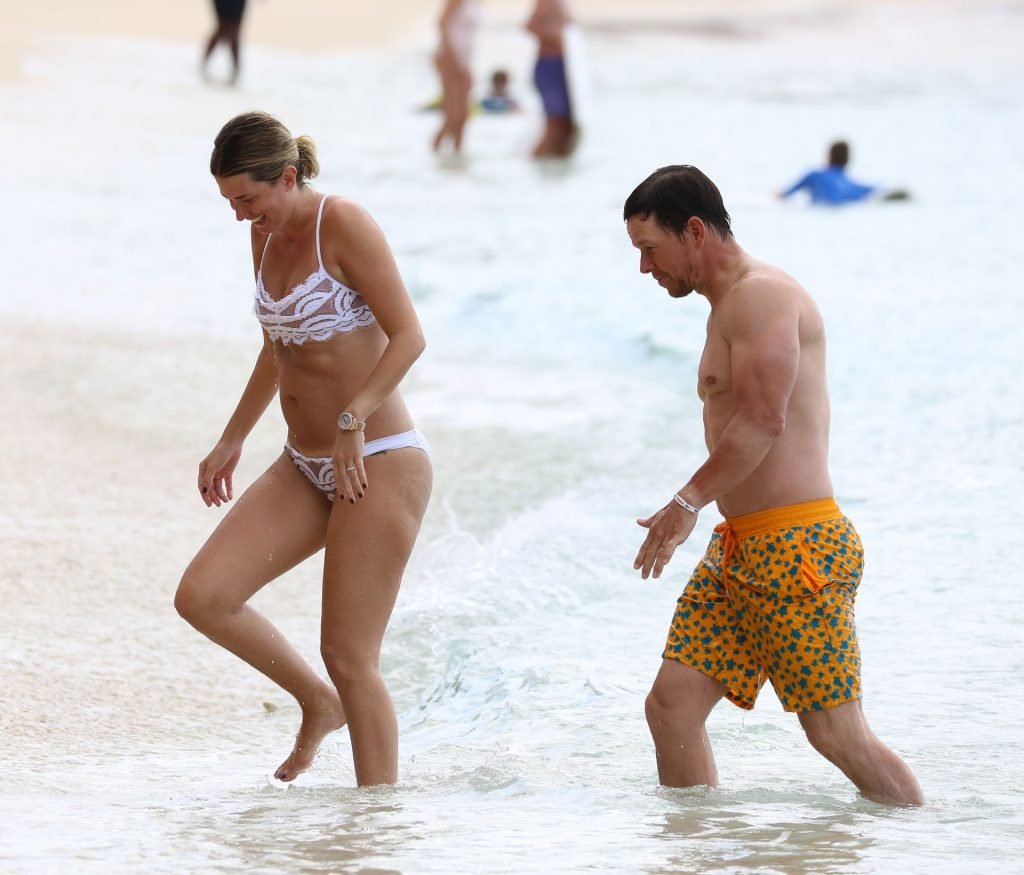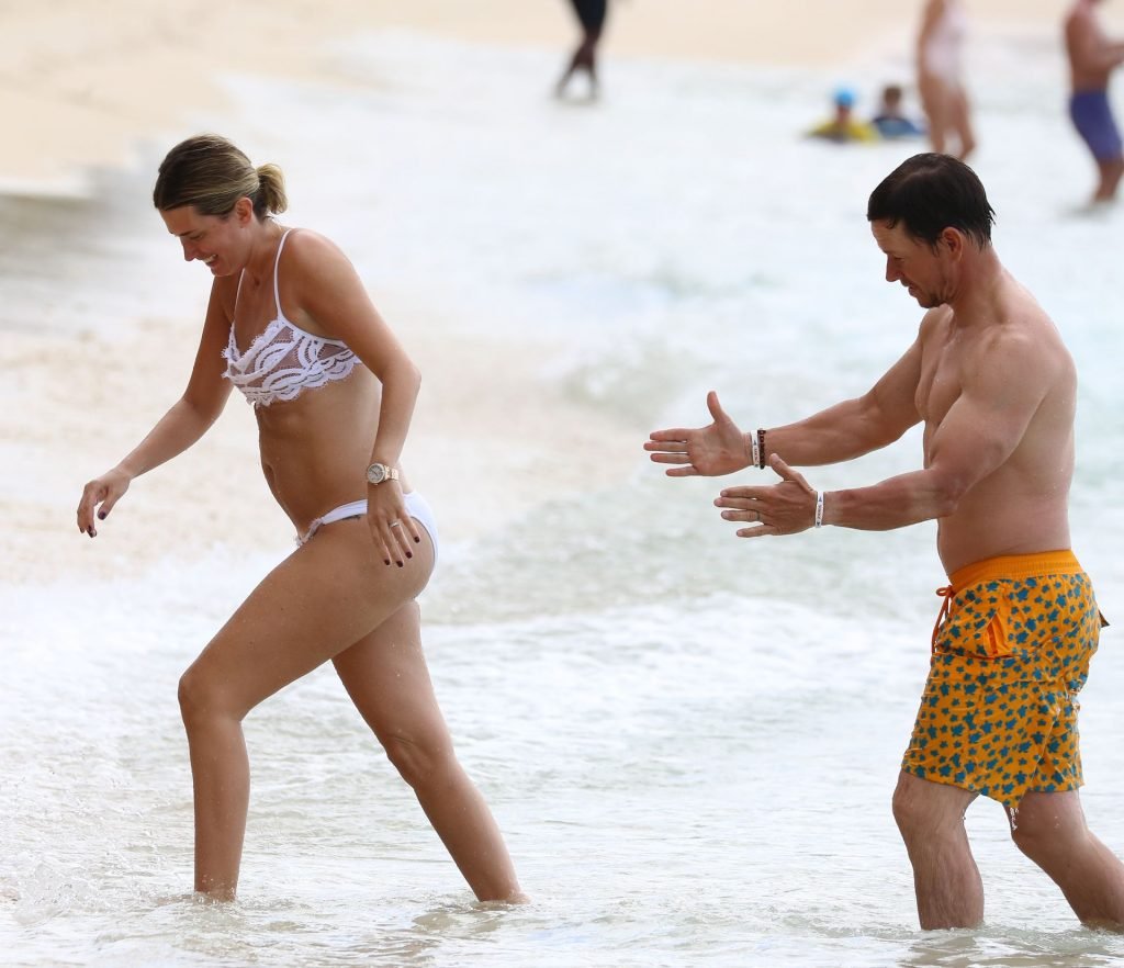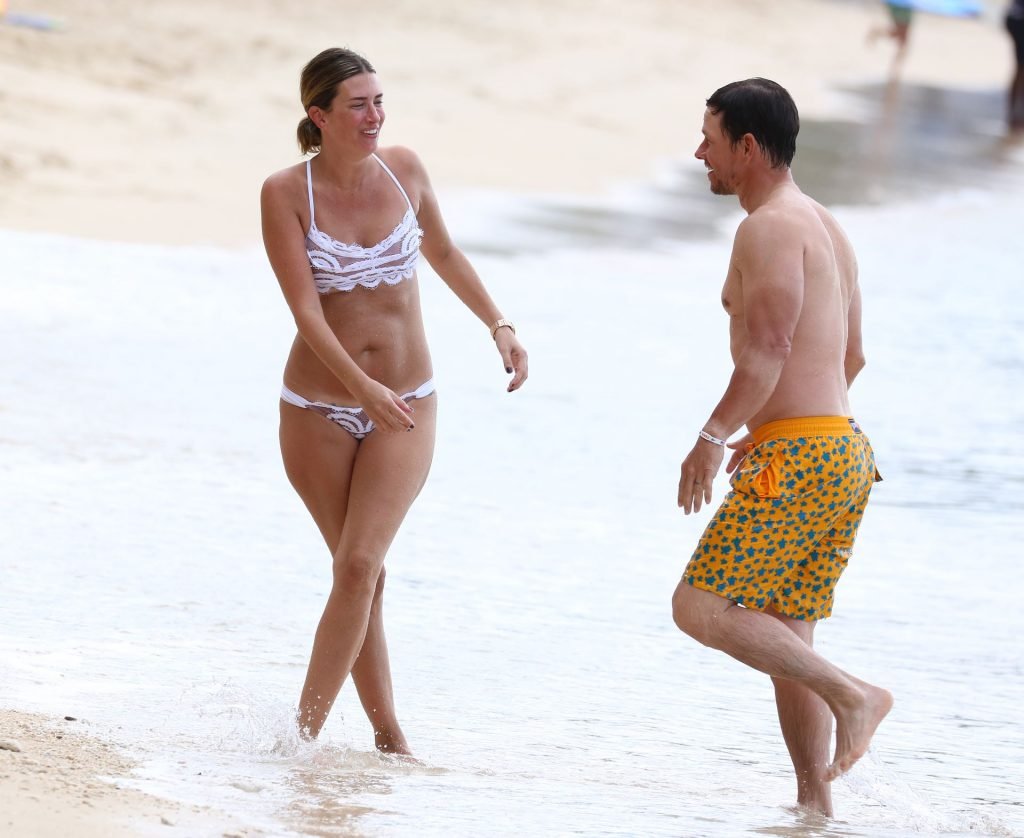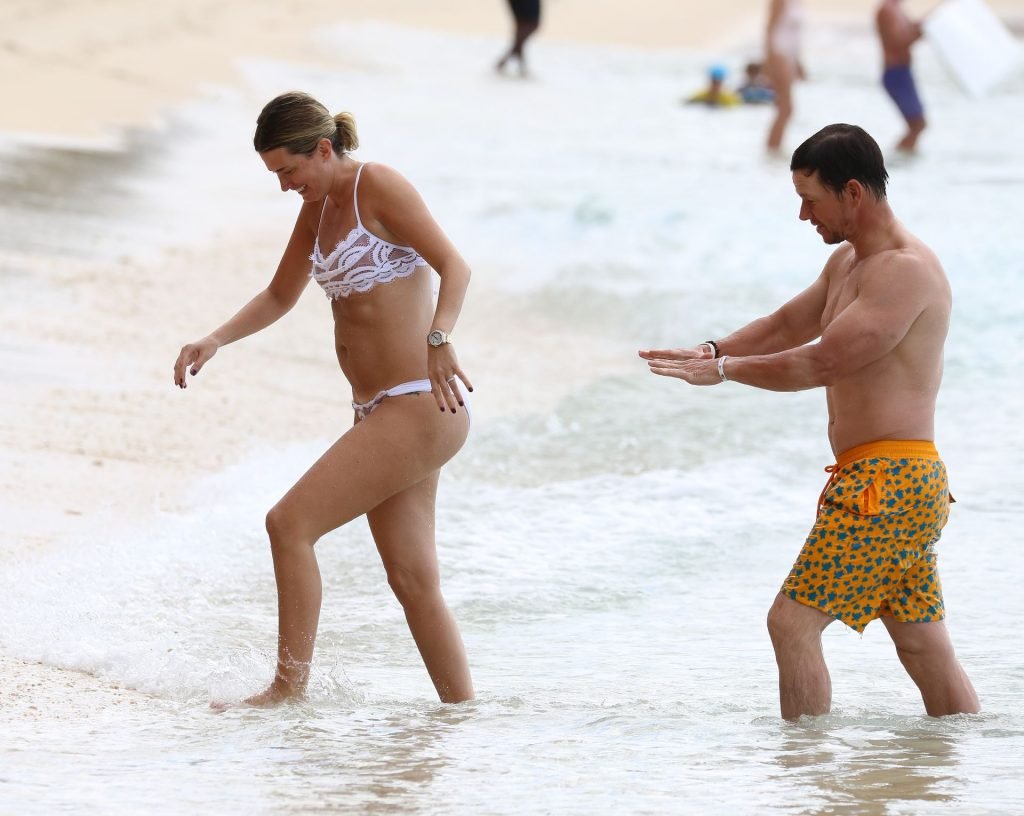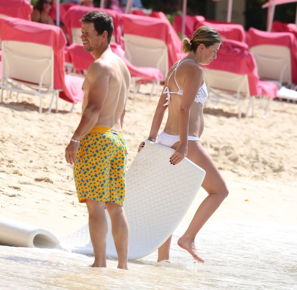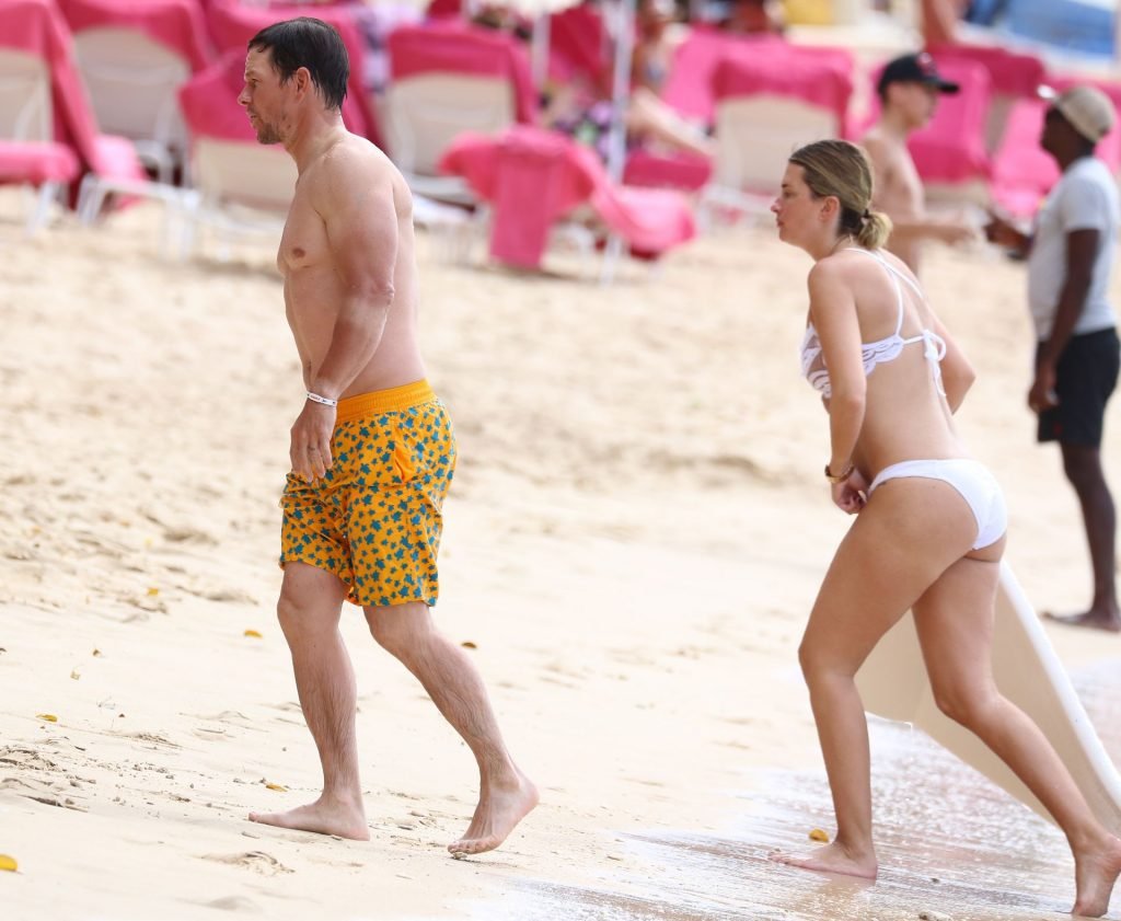 Mark Wahlberg et son épouse Rhea Durham partagent un moment romantique en nageant pendant leurs vacances à la Barbade, 01/03/2019. Rhea a été vue en bikini blanc sur la plage.