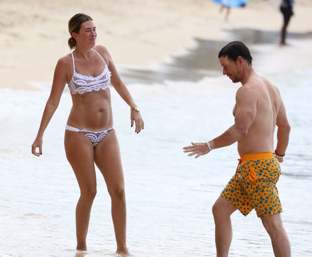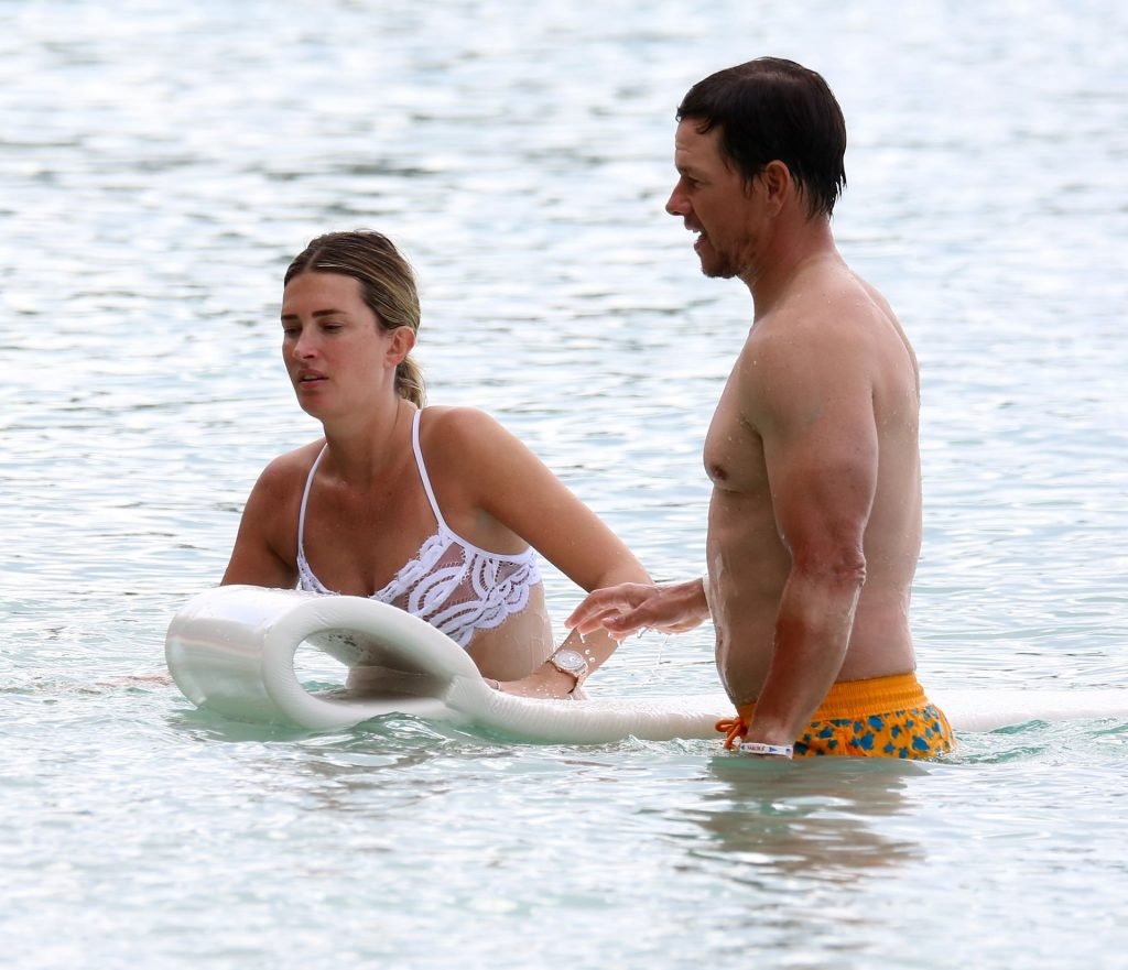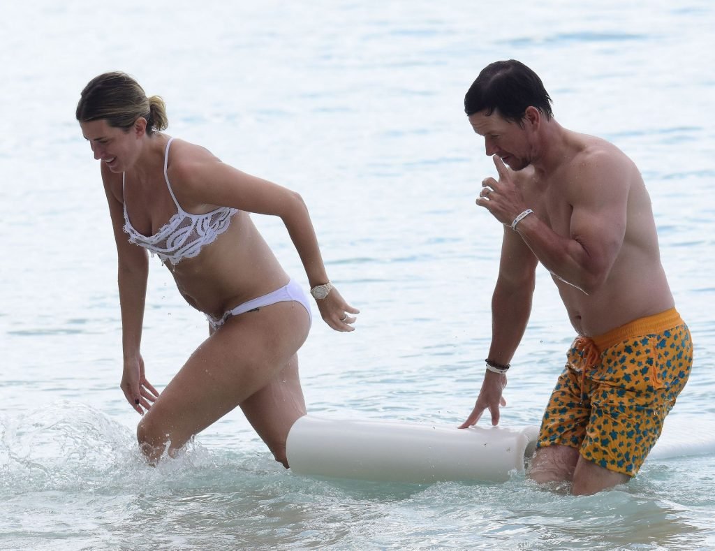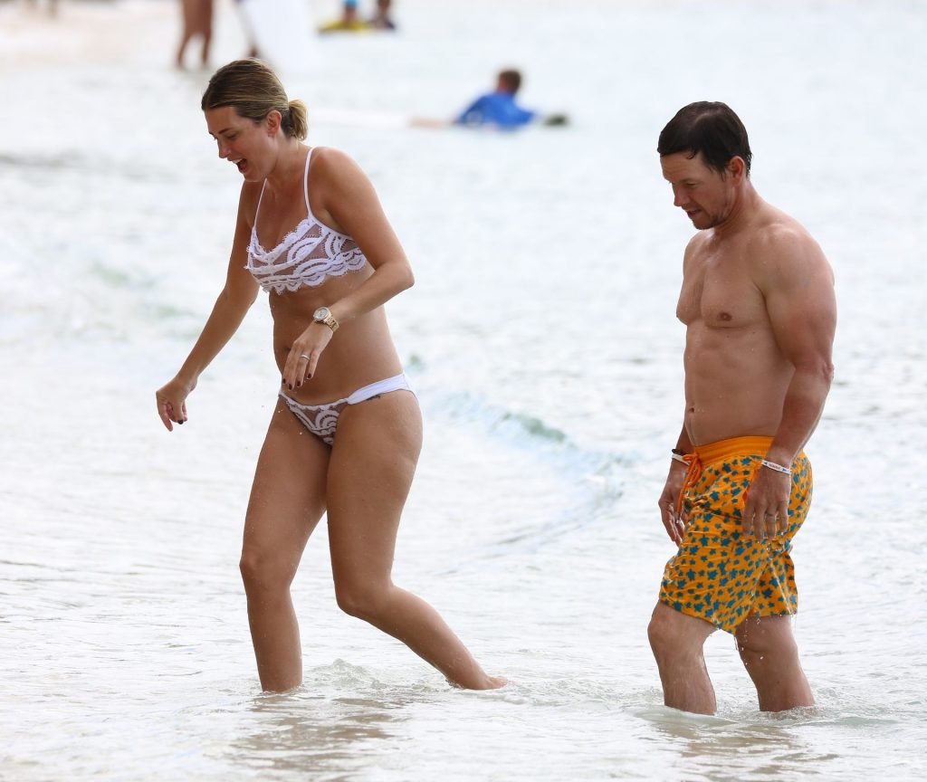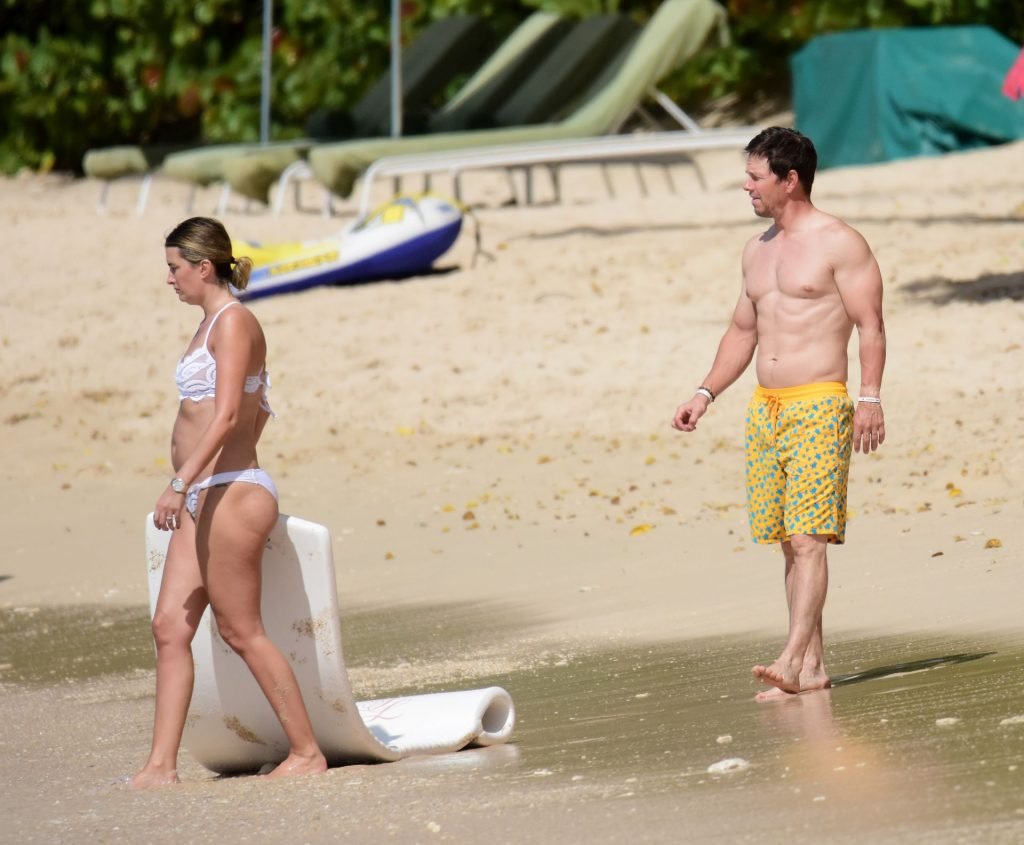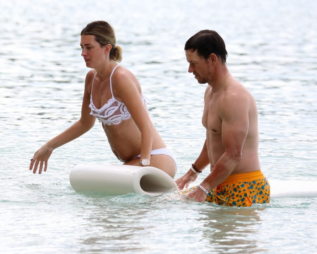 Mark Wahlberg et son épouse Rhea Durham partagent un moment romantique en nageant pendant leurs vacances à la Barbade, 01/03/2019. Rhea a été vue en bikini blanc sur la plage.