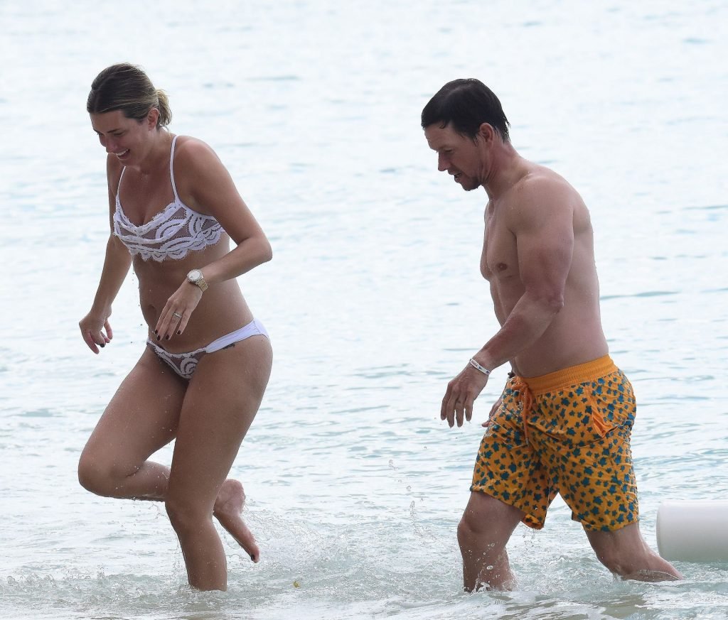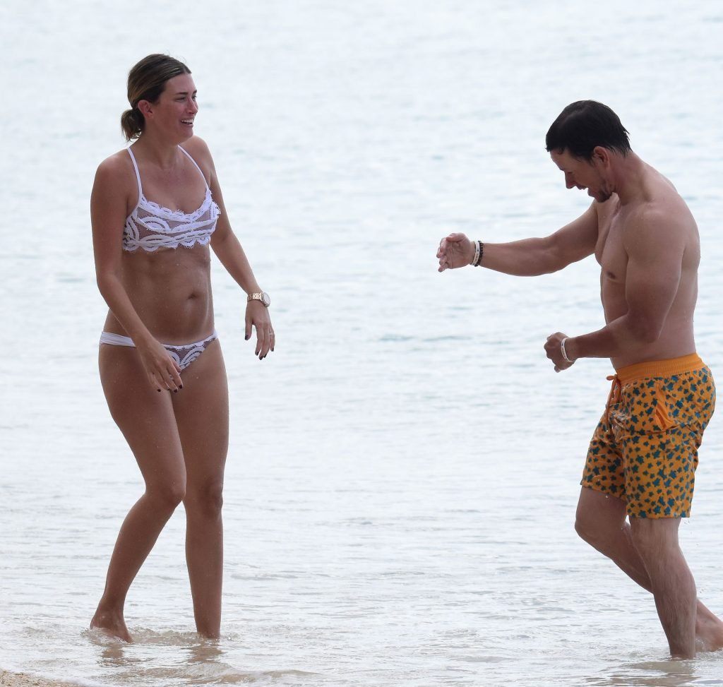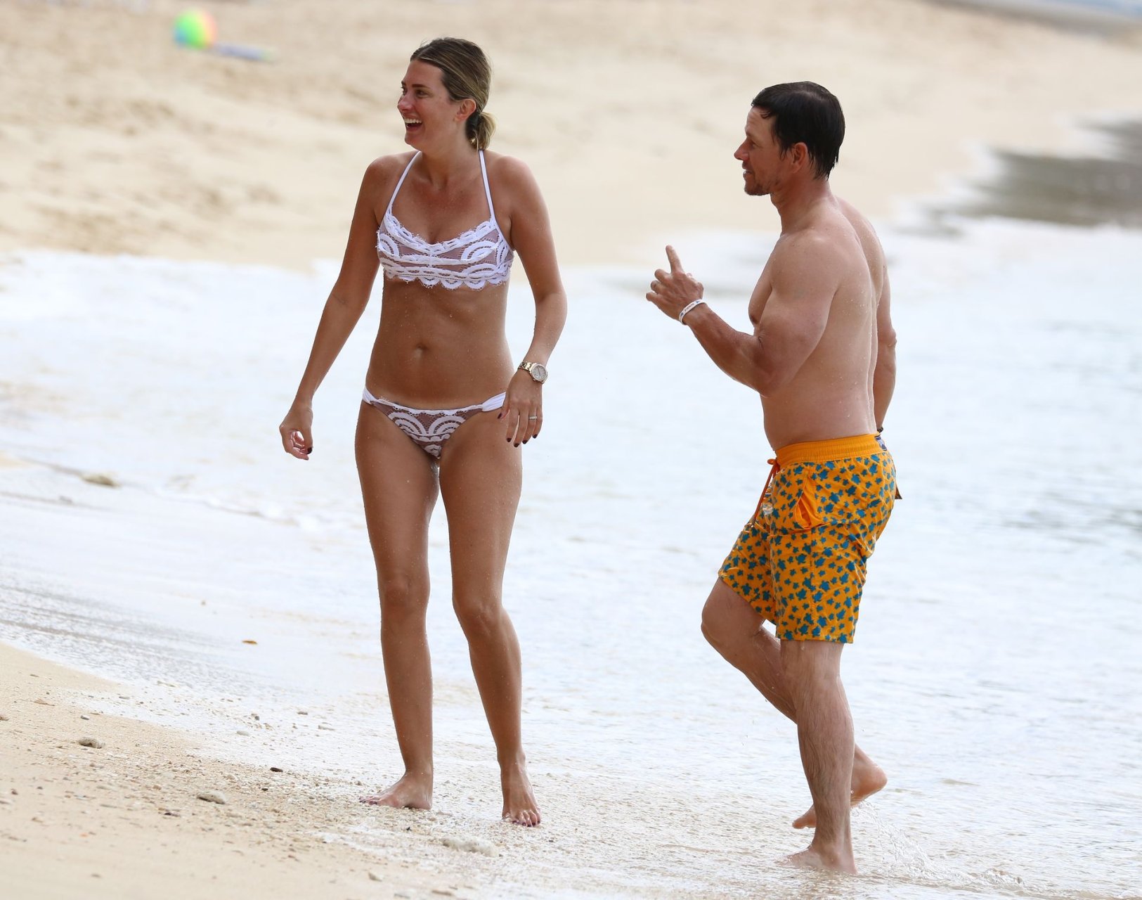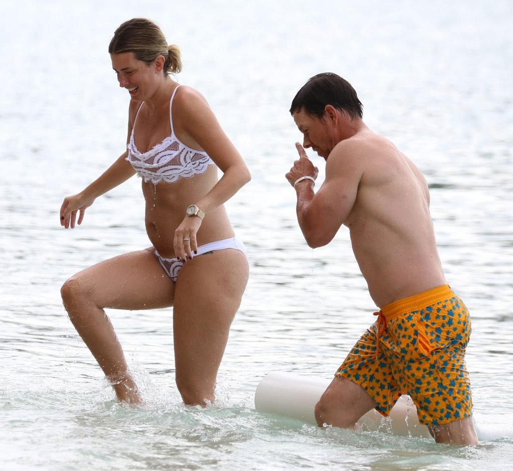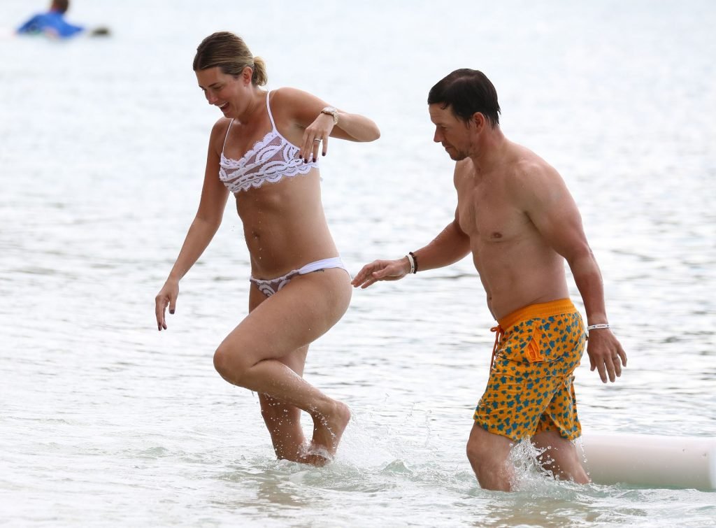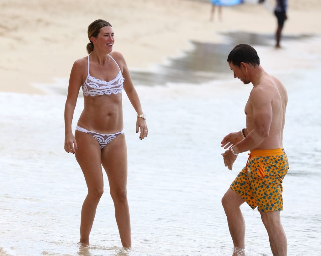 Mark Wahlberg et son épouse Rhea Durham partagent un moment romantique en nageant pendant leurs vacances à la Barbade, 01/03/2019. Rhea a été vue en bikini blanc sur la plage.