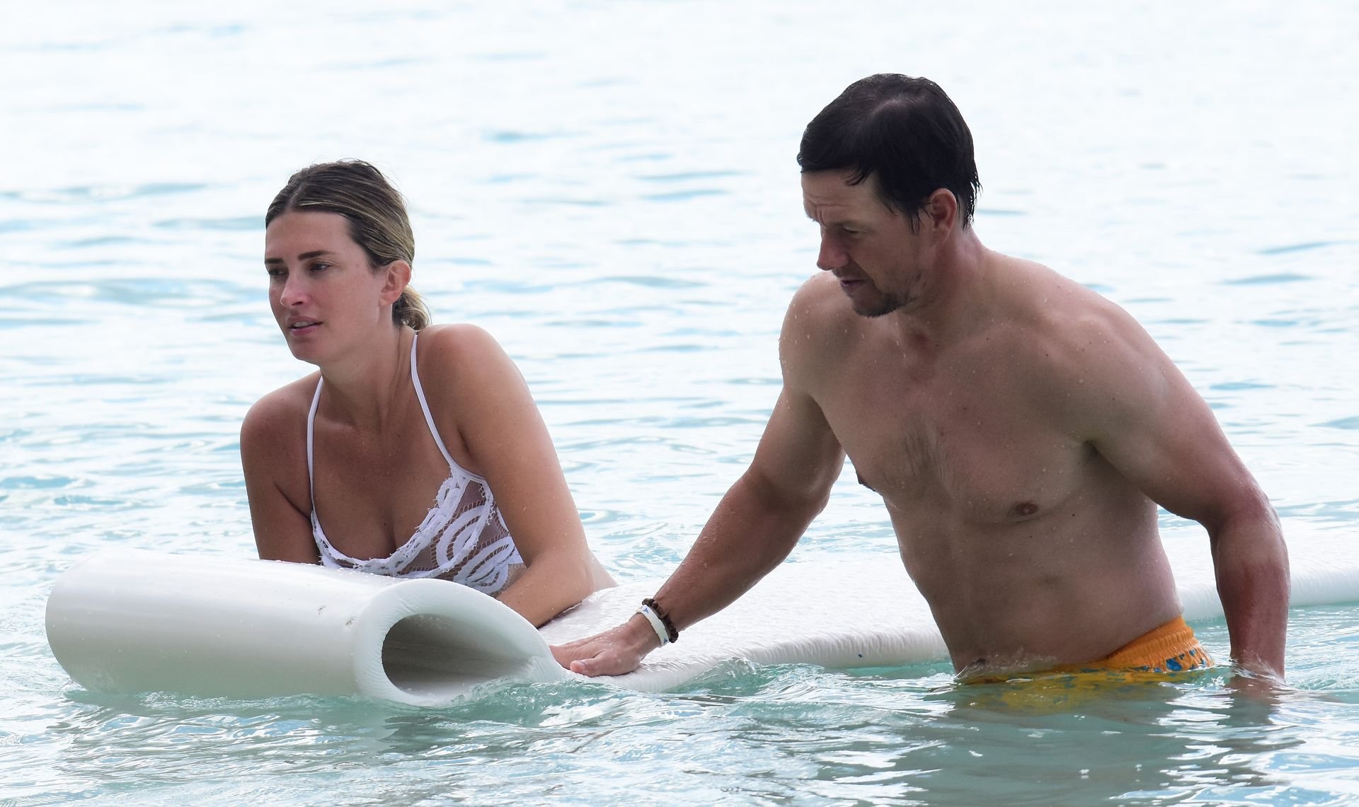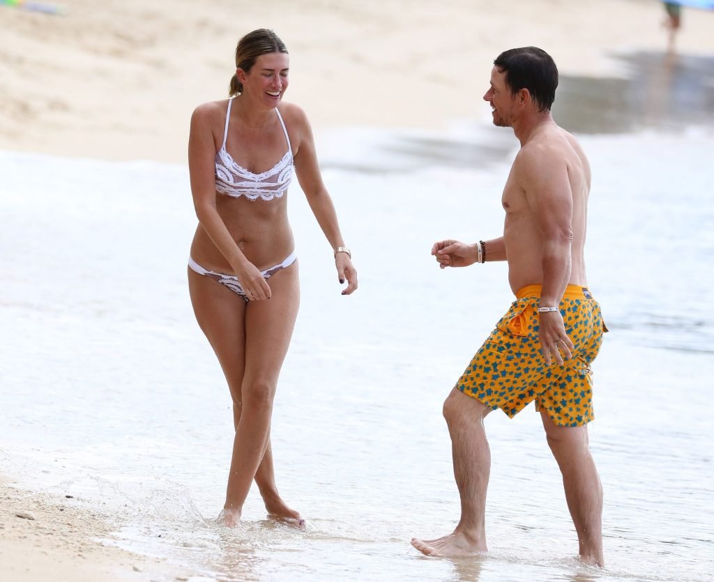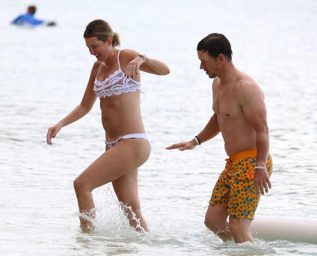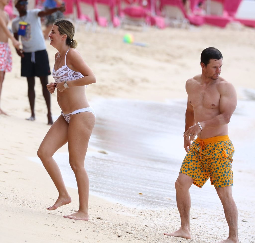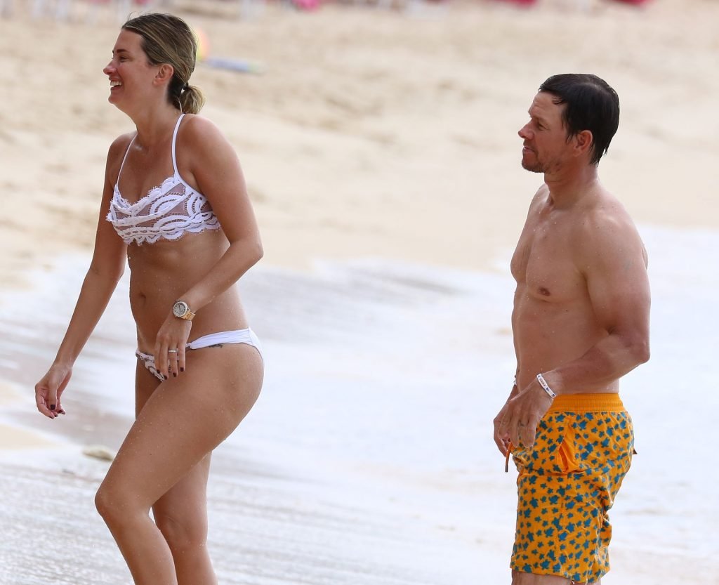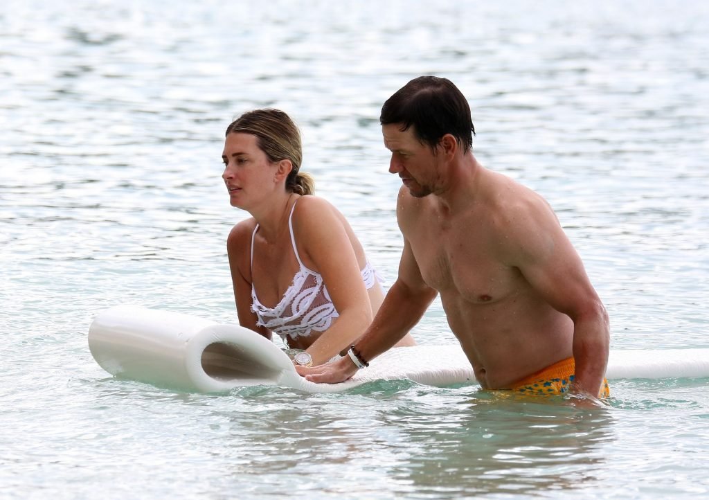 Mark Wahlberg et son épouse Rhea Durham partagent un moment romantique en nageant pendant leurs vacances à la Barbade, 01/03/2019. Rhea a été vue en bikini blanc sur la plage.