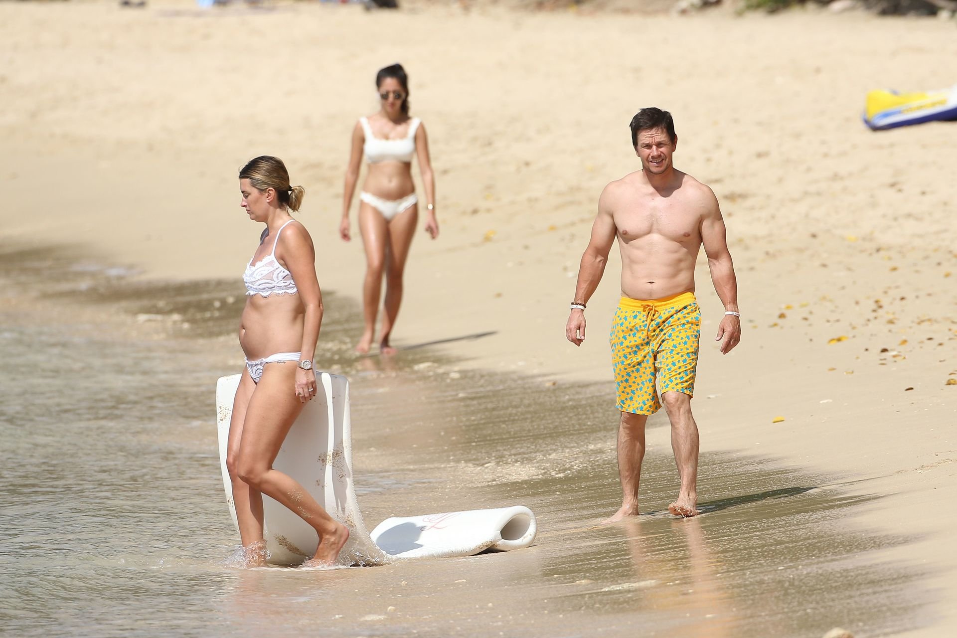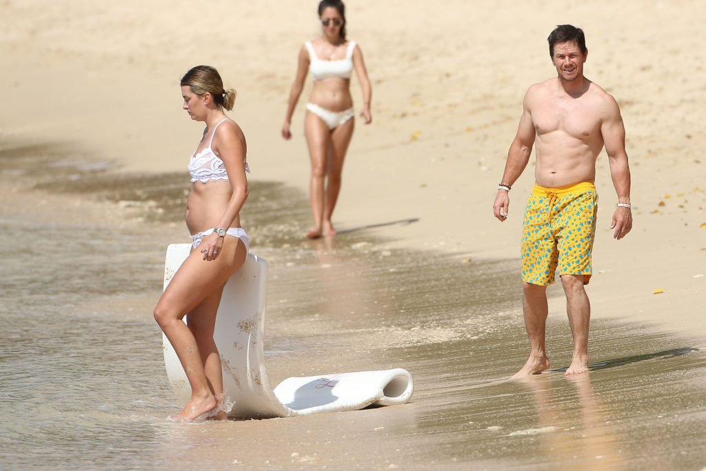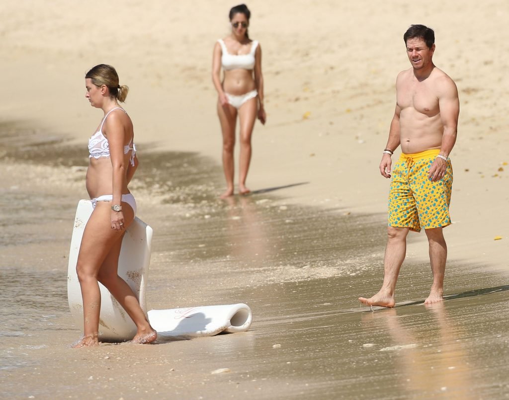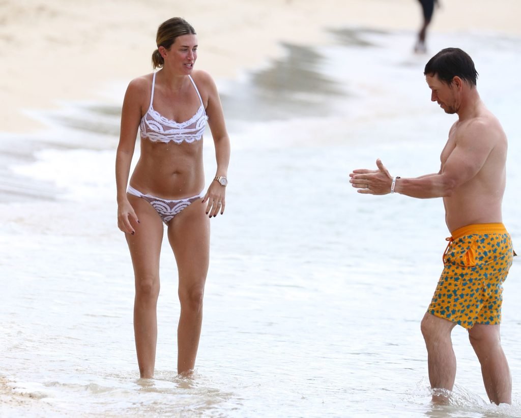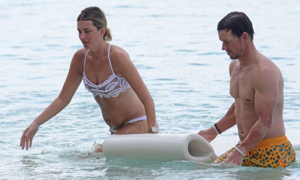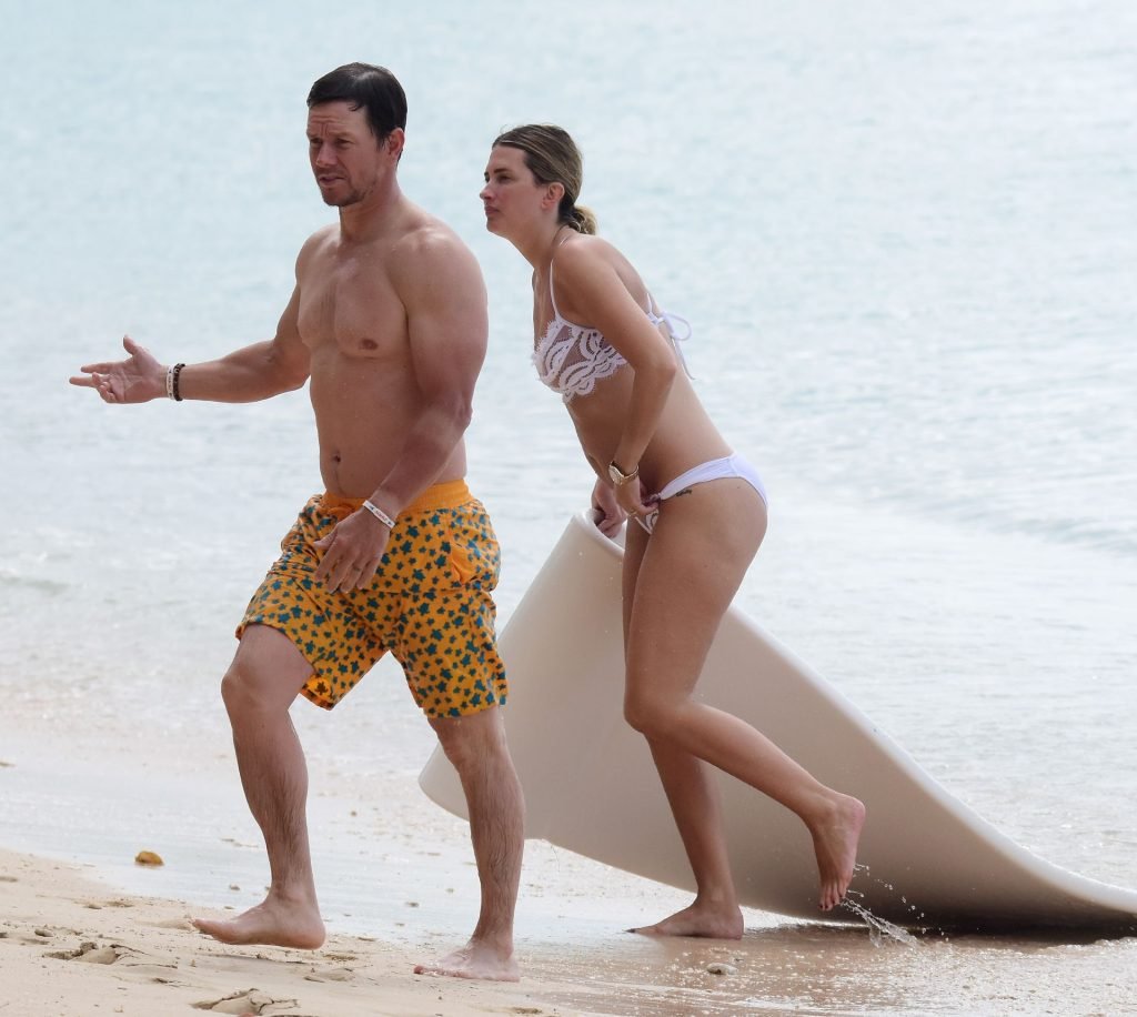 Mark Wahlberg et son épouse Rhea Durham partagent un moment romantique en nageant pendant leurs vacances à la Barbade, 01/03/2019. Rhea a été vue en bikini blanc sur la plage.