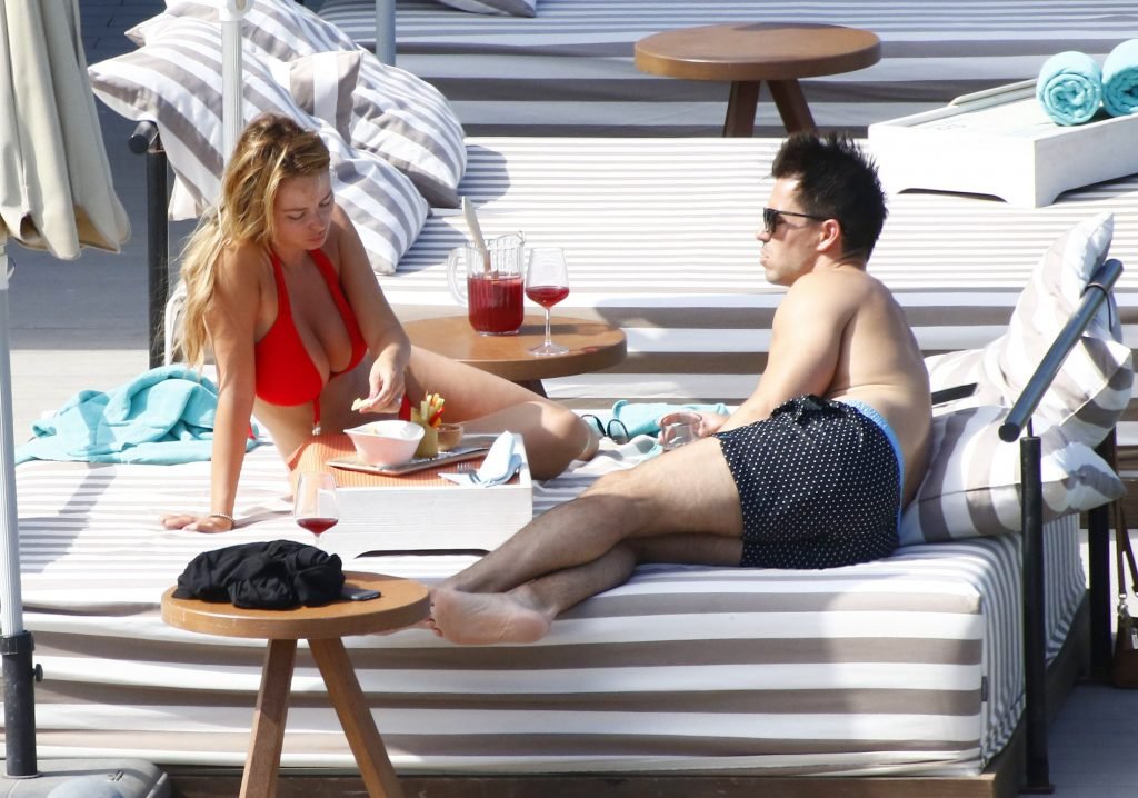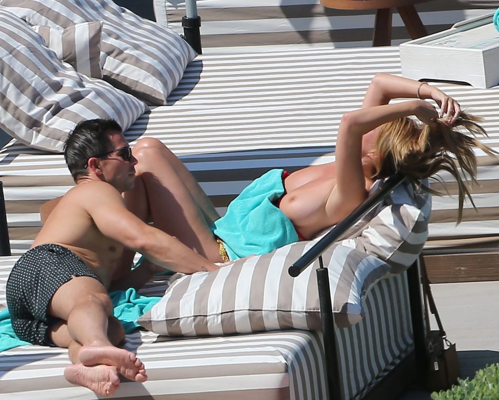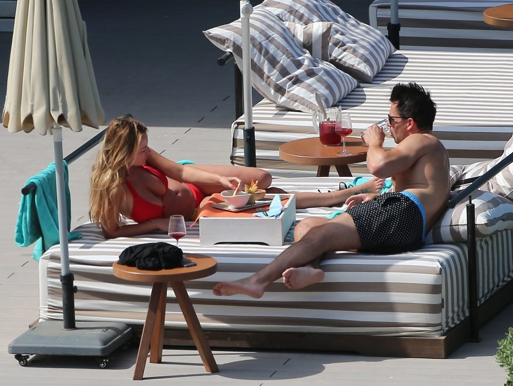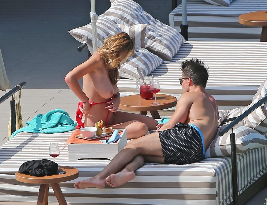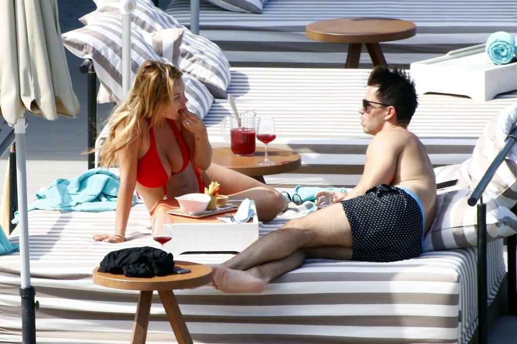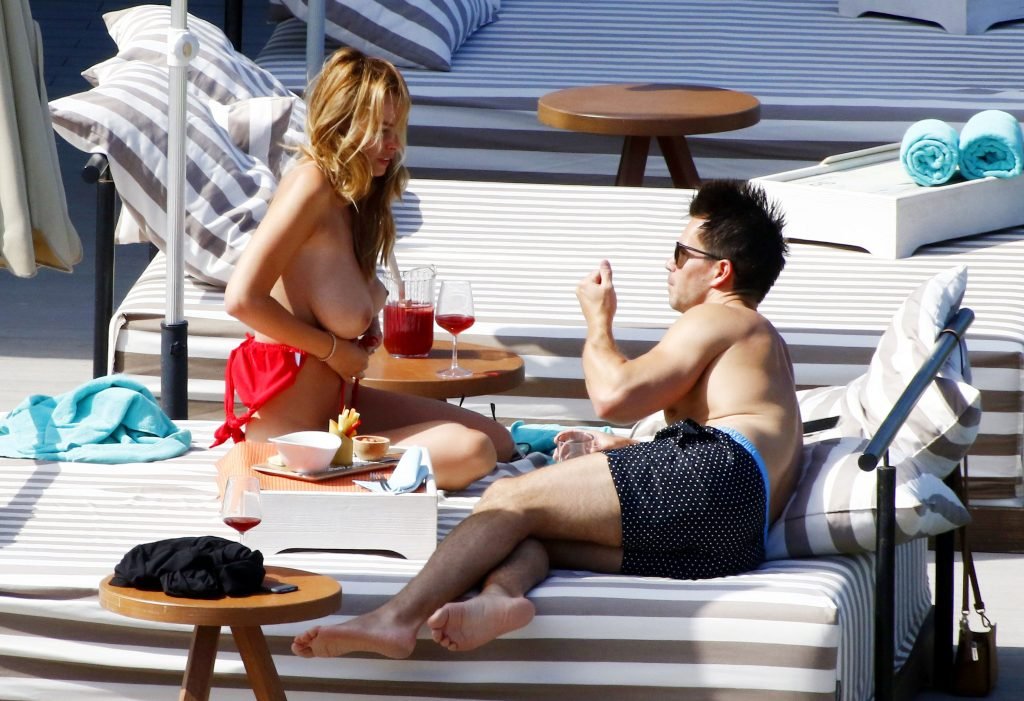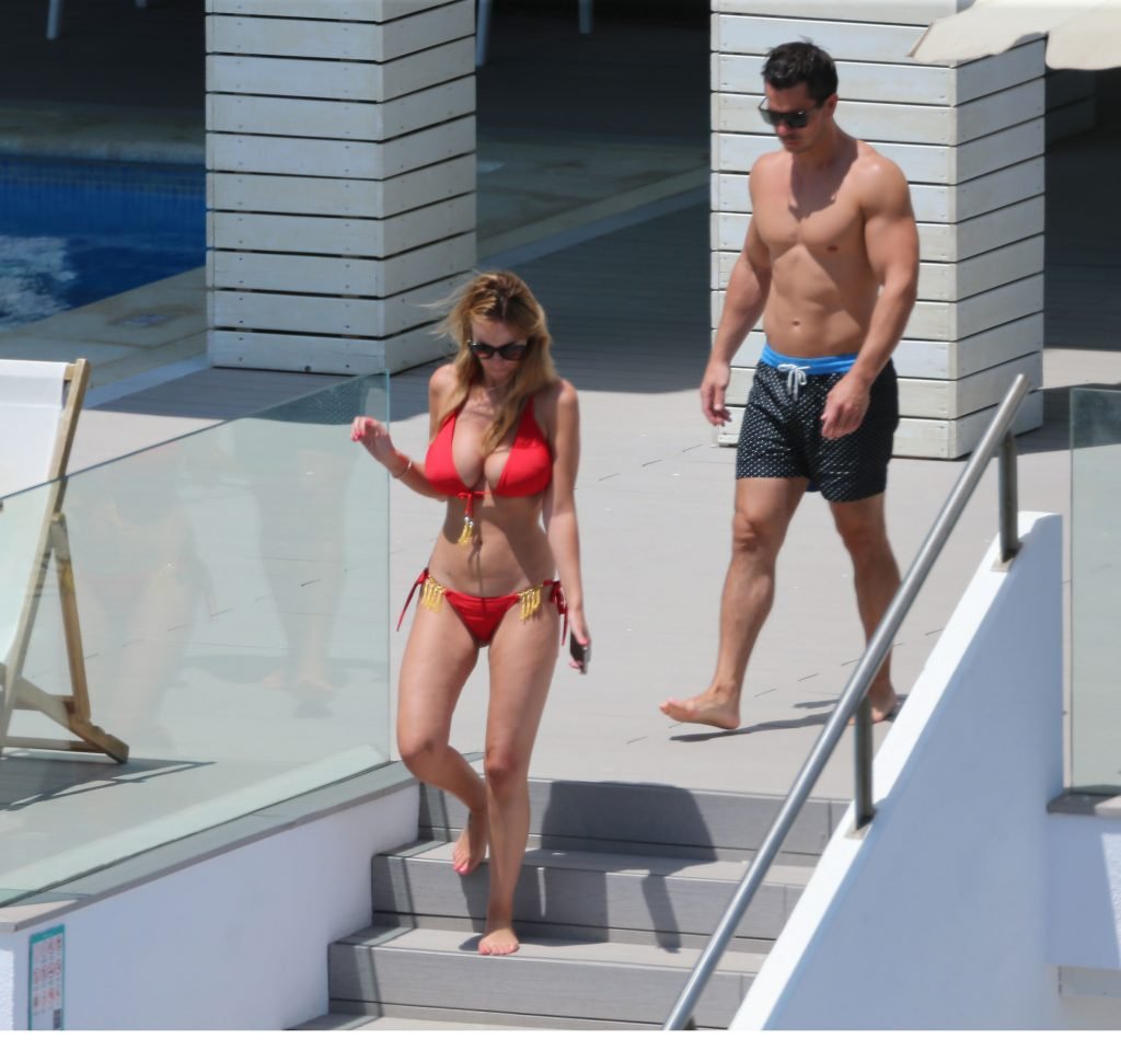 Le mannequin glamour anglais Rhian Sugden (31 ans) a été vue en train de prendre le soleil en bikini rouge et seins nus lors de ses vacances avec son fiancé Oliver Mellor à Ibiza, le 14/06/2018.