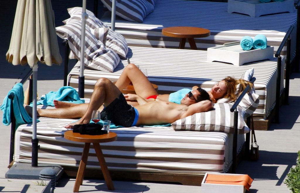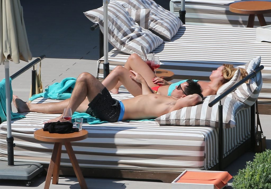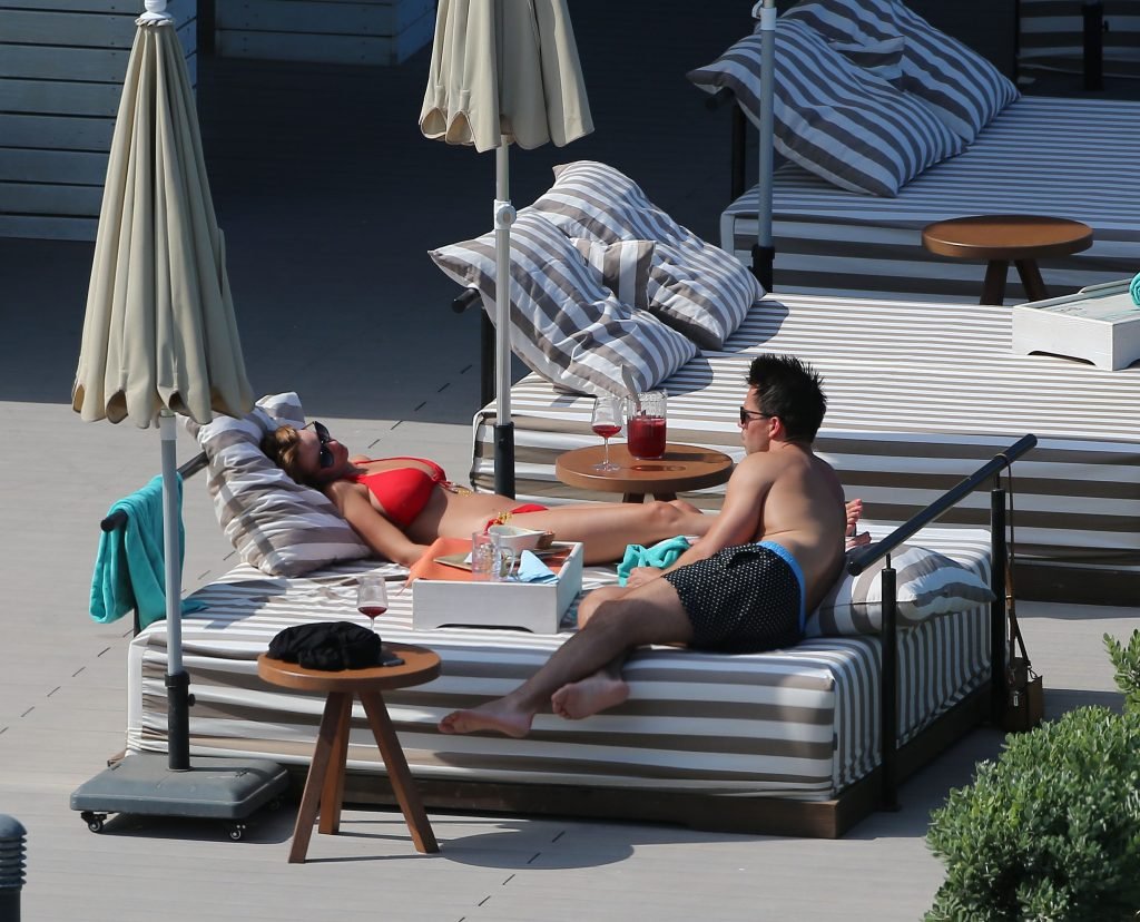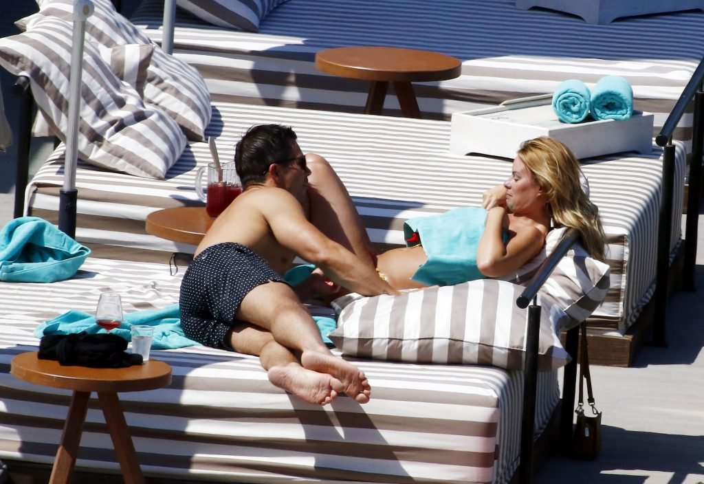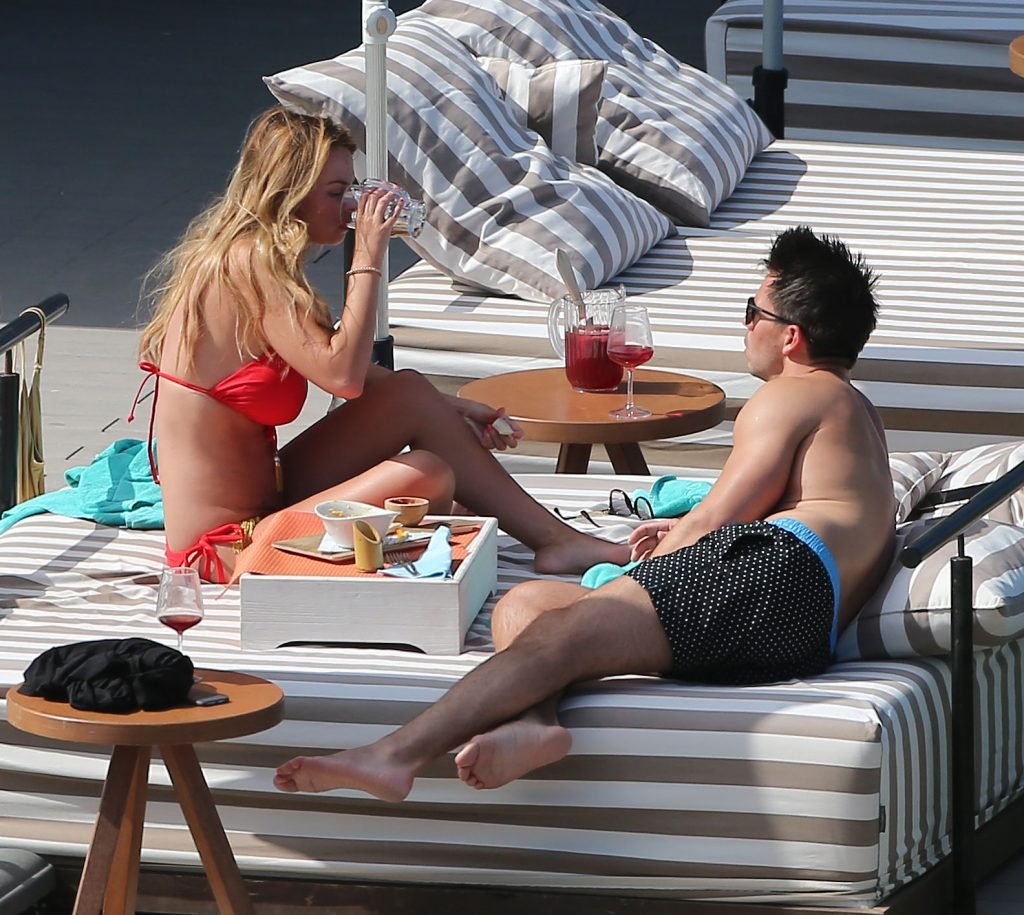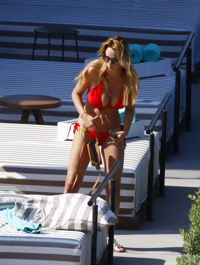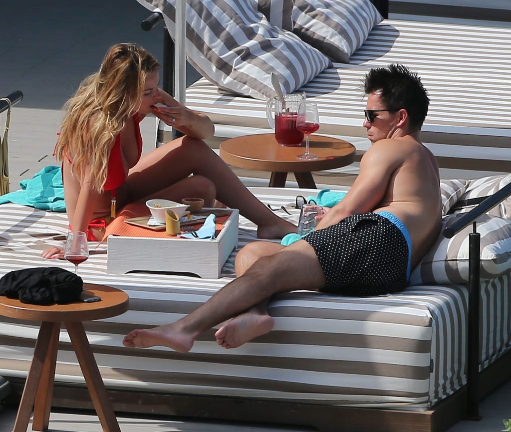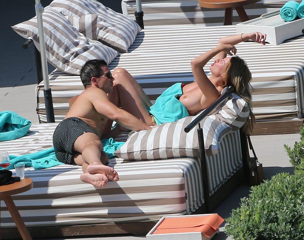Le mannequin glamour anglais Rhian Sugden (31 ans) a été vue en train de prendre le soleil en bikini rouge et seins nus lors de ses vacances avec son fiancé Oliver Mellor à Ibiza, le 14/06/2018.