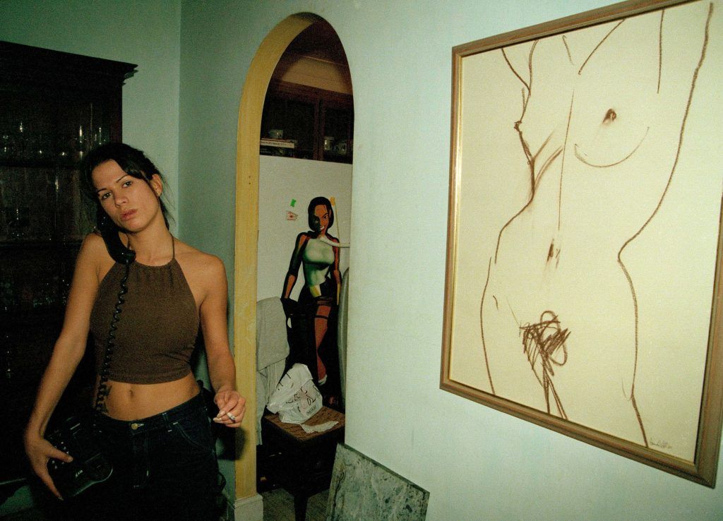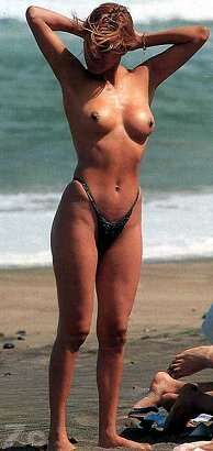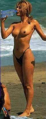 La fille torse nu qui boit de l'eau sur la plage est Ivone Reyes (photos 15-19)