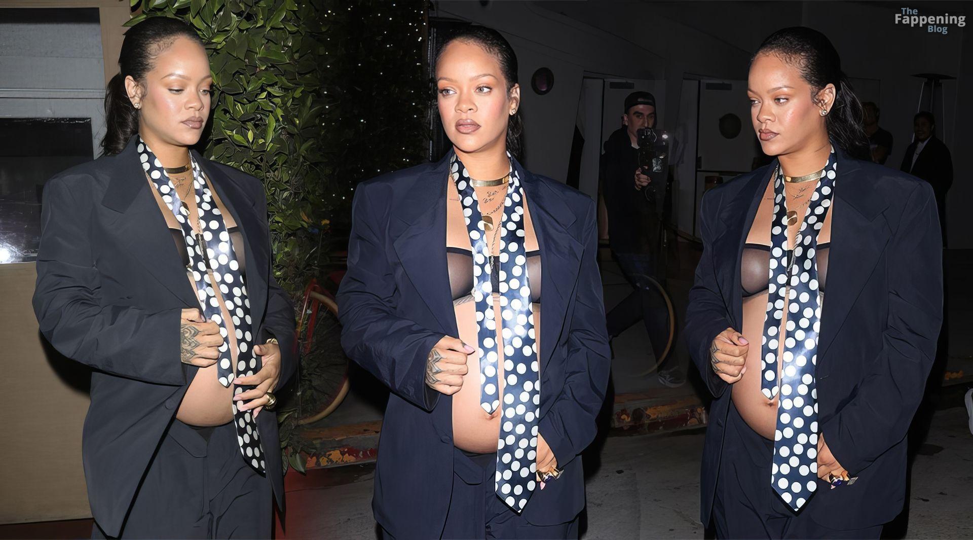 La star du Fappening Rihanna est apparue en portant un soutien-gorge transparent et un costume largement ouvert, flirtant avec un nip-slip tout en exhibant son ventre de bébé nu. Presque nue et totalement légendaire.