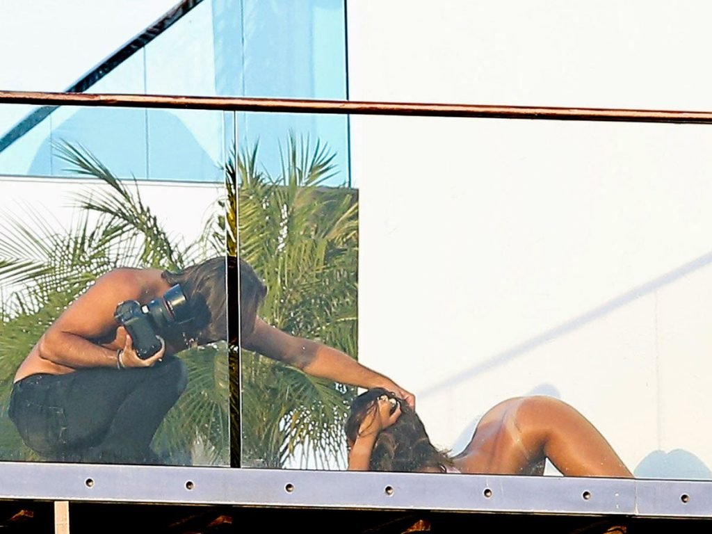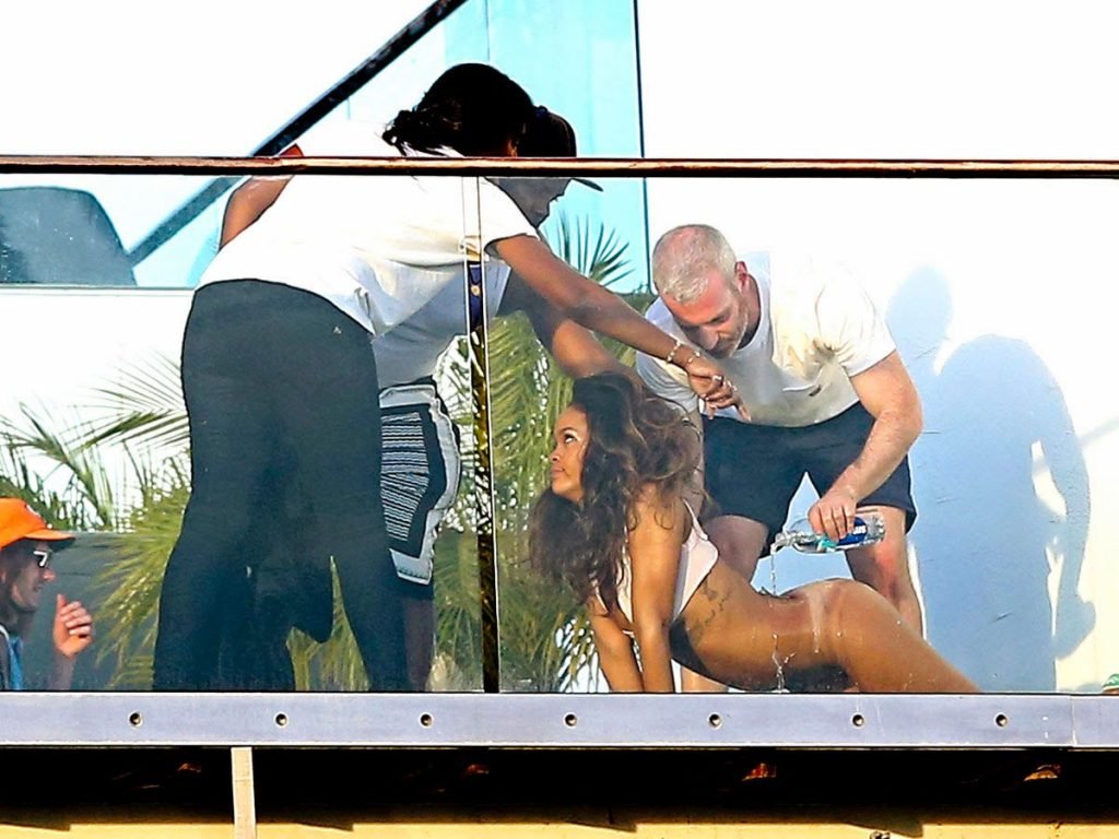 La chanteuse est apparue presque nue sur la terrasse d’un luxueux manoir hollywoodien. La poitrine de Rihanna était au moins légèrement couverte par un court haut, et la partie inférieure de la tenue était visible aux yeux du personnel.