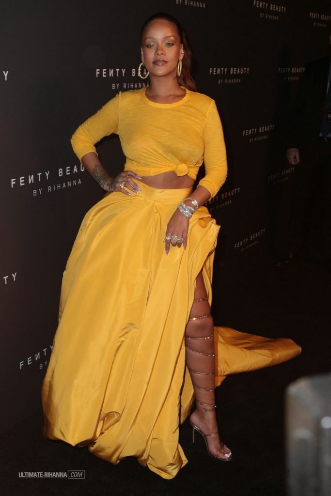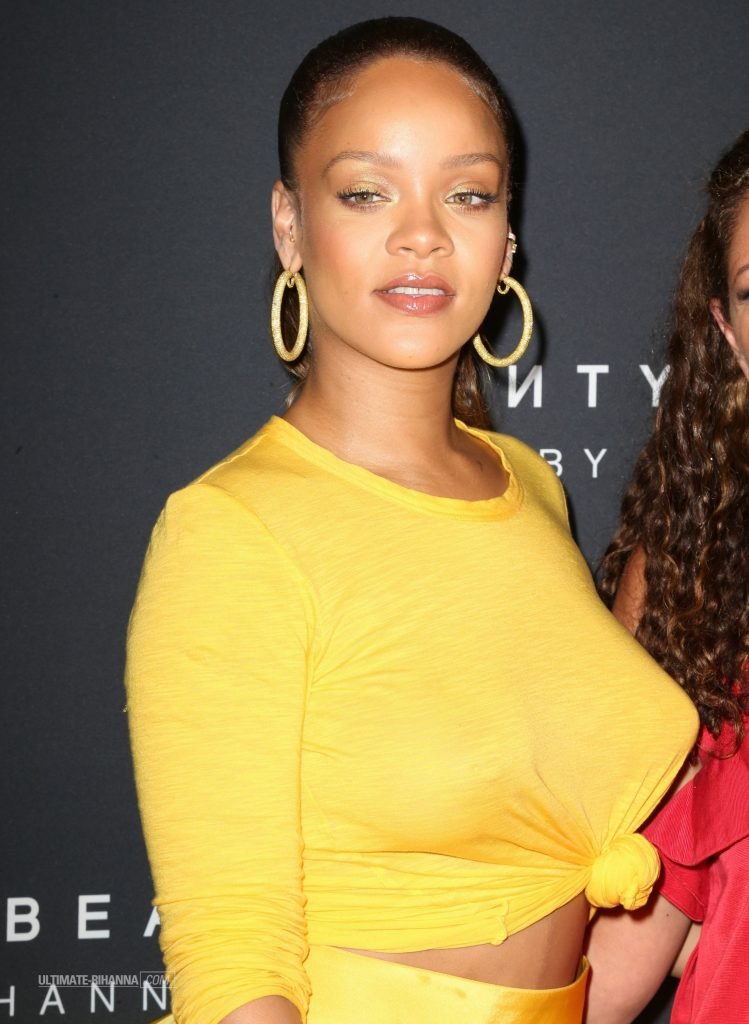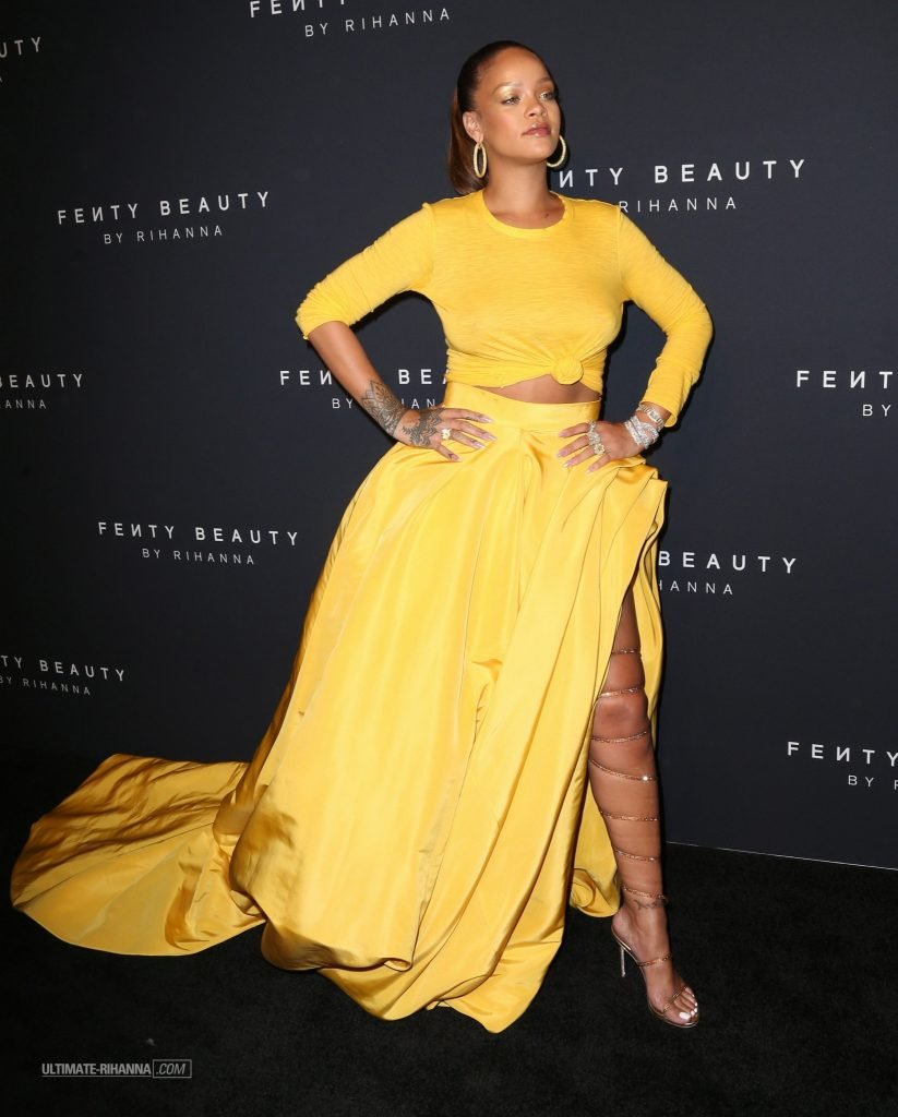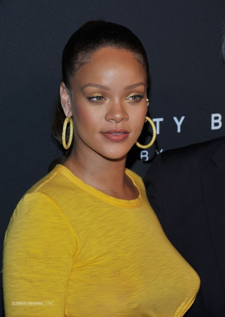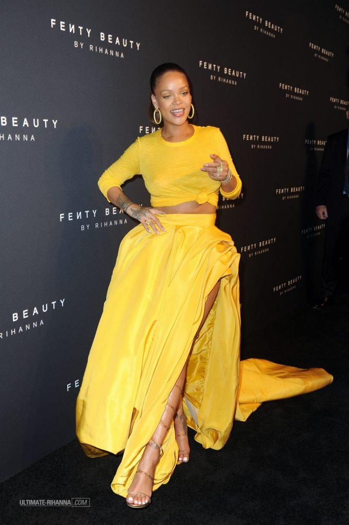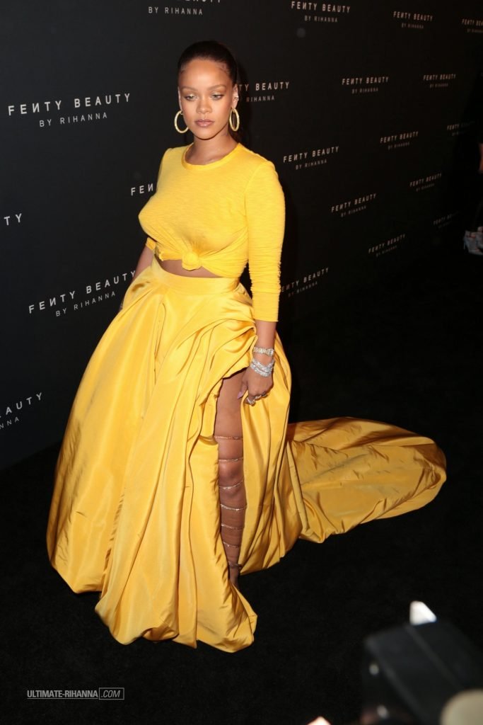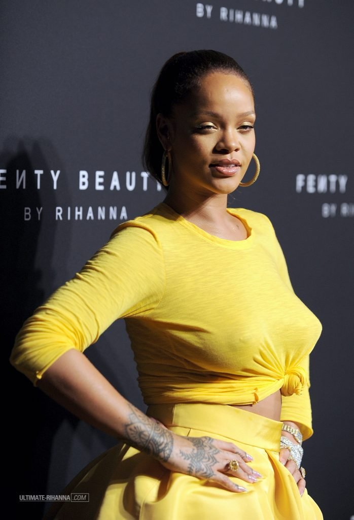 Rihanna sans soutien-gorge, 29 ans, rayonne dans une tenue jaune pour le lancement de Fenty Beauty NYFW, 08/09/2017. Nous avons également ajouté quelques photos transparentes retouchées.
