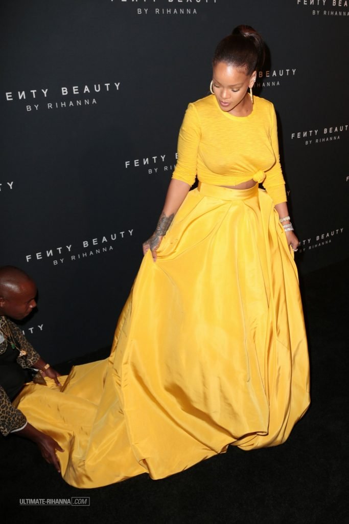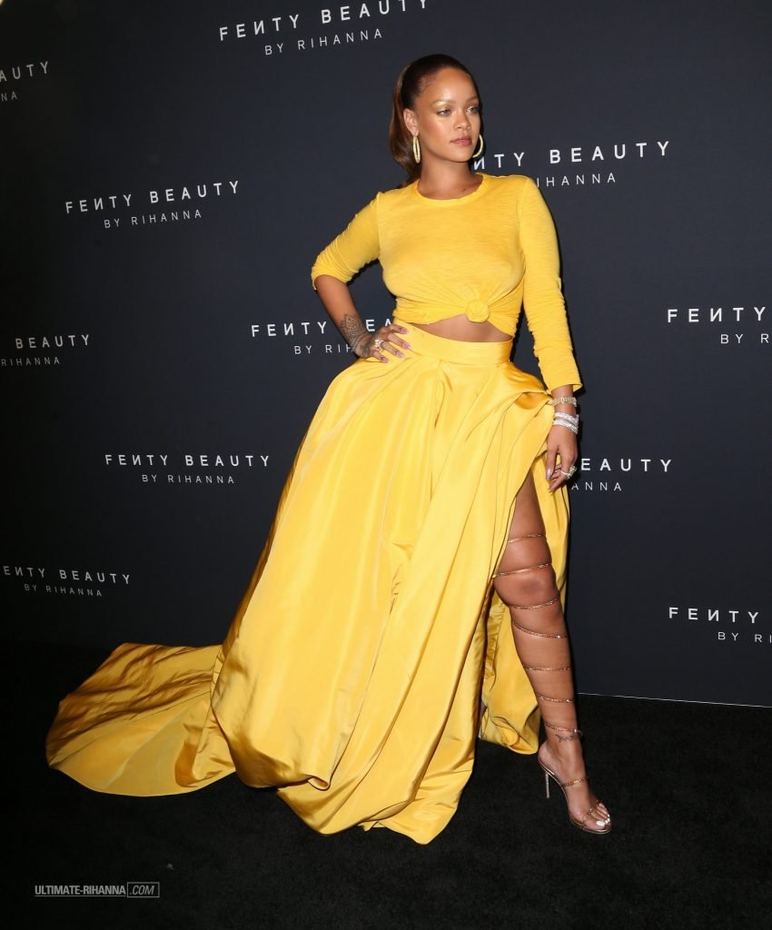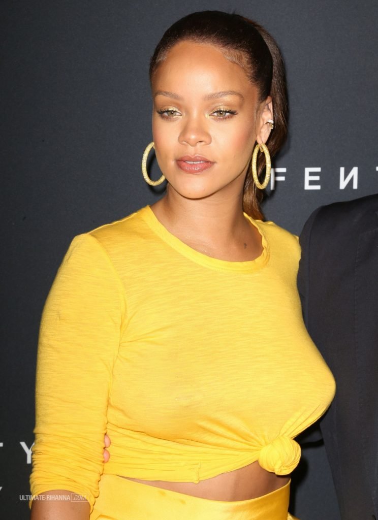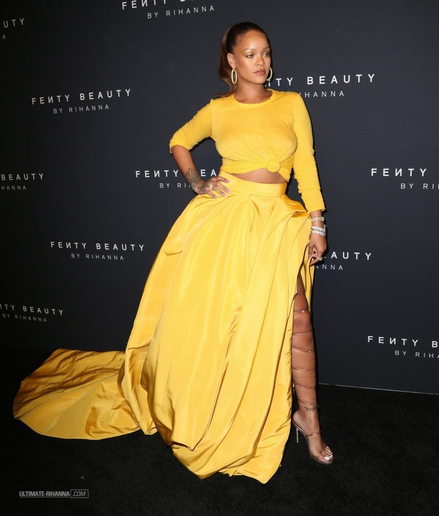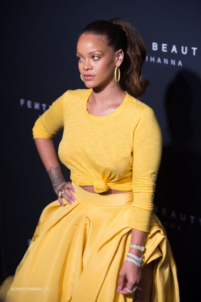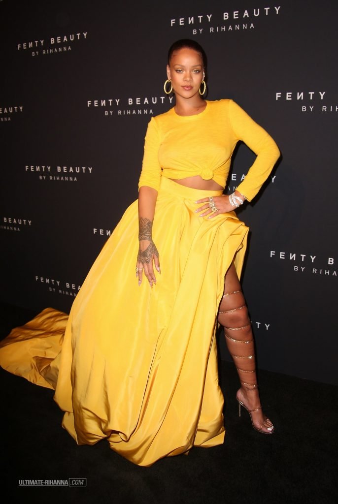 Rihanna sans soutien-gorge, 29 ans, rayonne dans une tenue jaune pour le lancement de Fenty Beauty NYFW, 08/09/2017. Nous avons également ajouté quelques photos transparentes retouchées.
