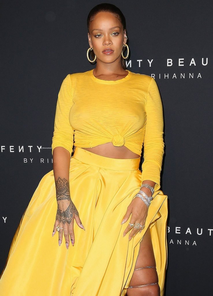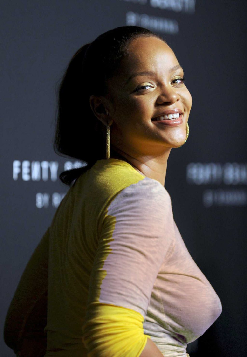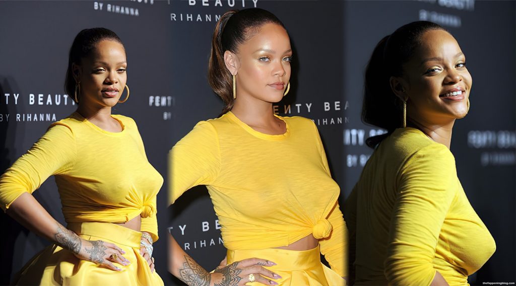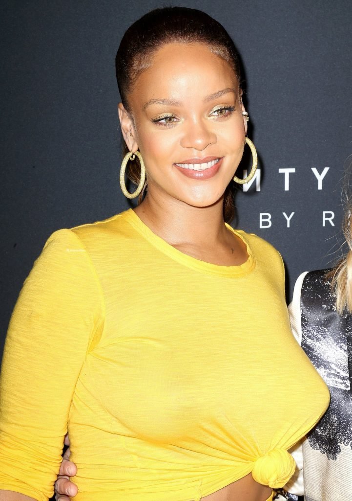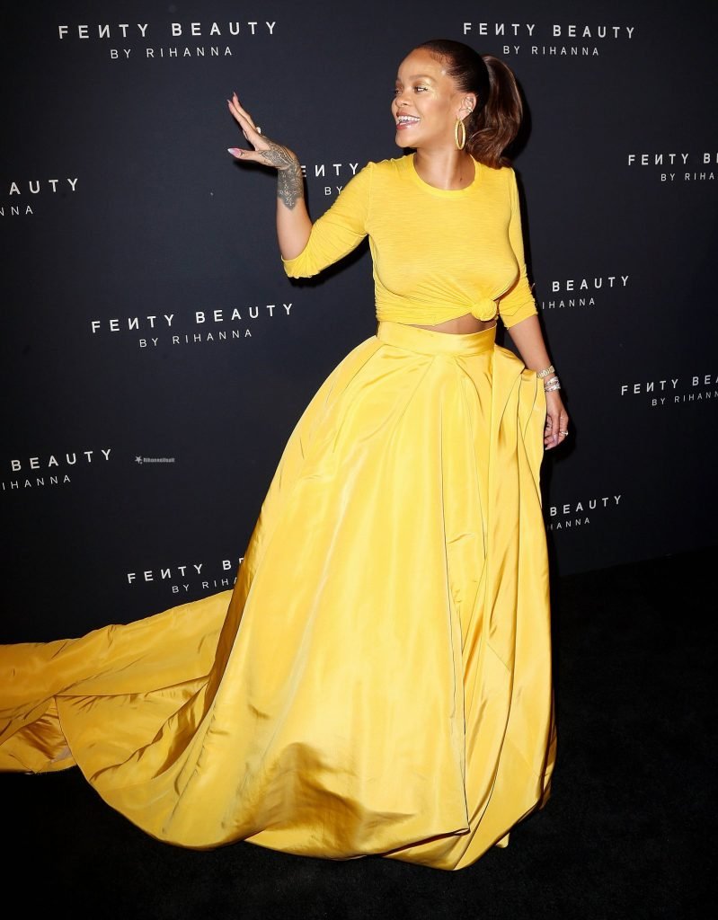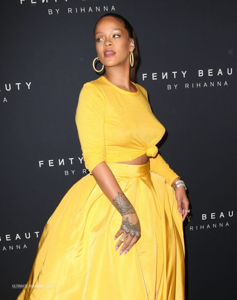 Rihanna sans soutien-gorge, 29 ans, rayonne dans une tenue jaune pour le lancement de Fenty Beauty NYFW, 08/09/2017. Nous avons également ajouté quelques photos transparentes retouchées.