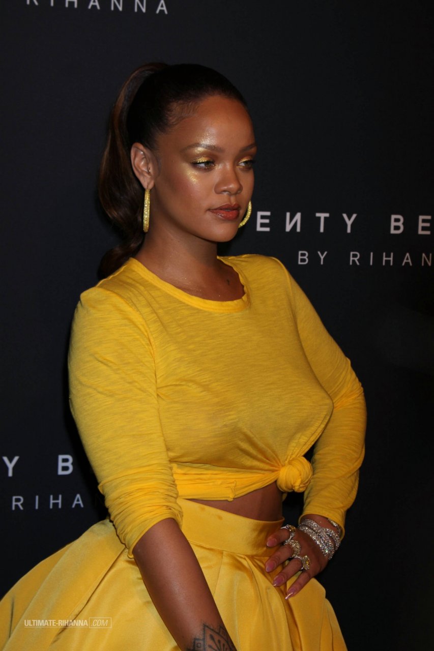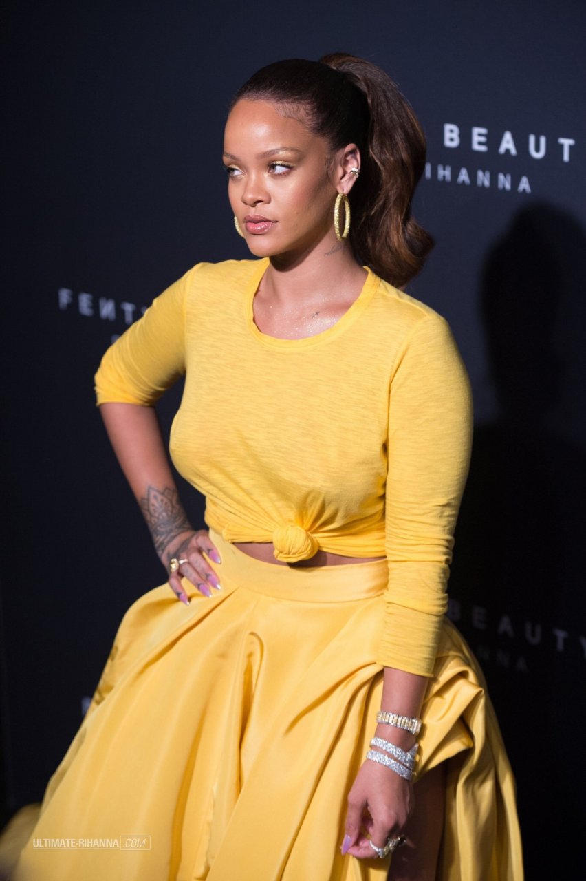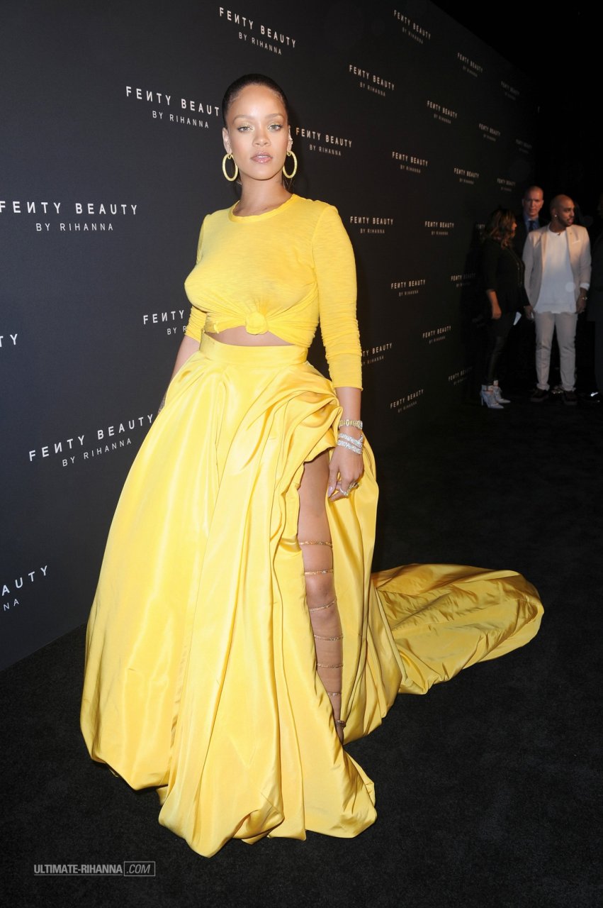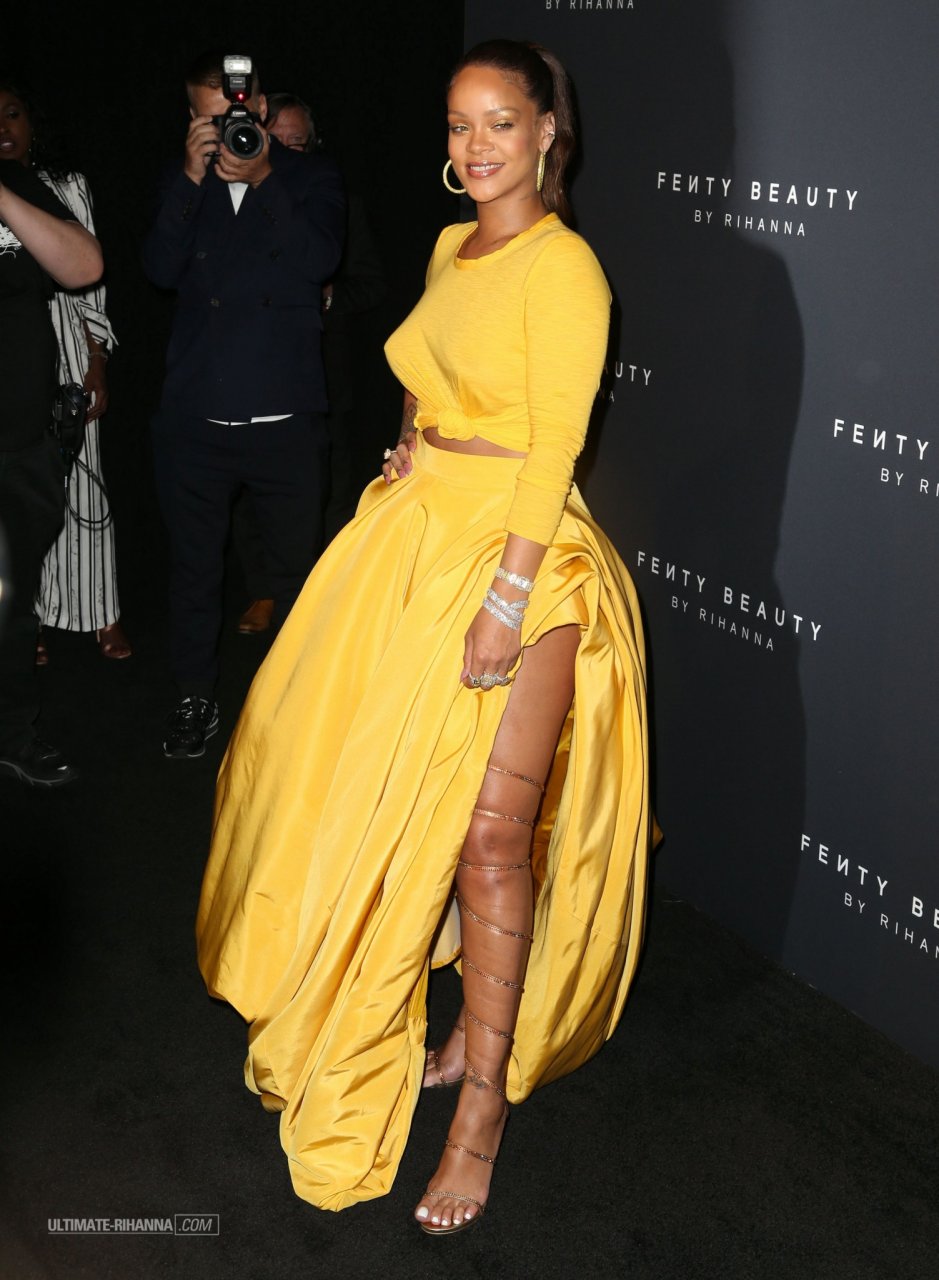 Rihanna sans soutien-gorge, 29 ans, rayonne dans une tenue jaune pour le lancement de Fenty Beauty NYFW, 08/09/2017. Nous avons également ajouté quelques photos transparentes retouchées.