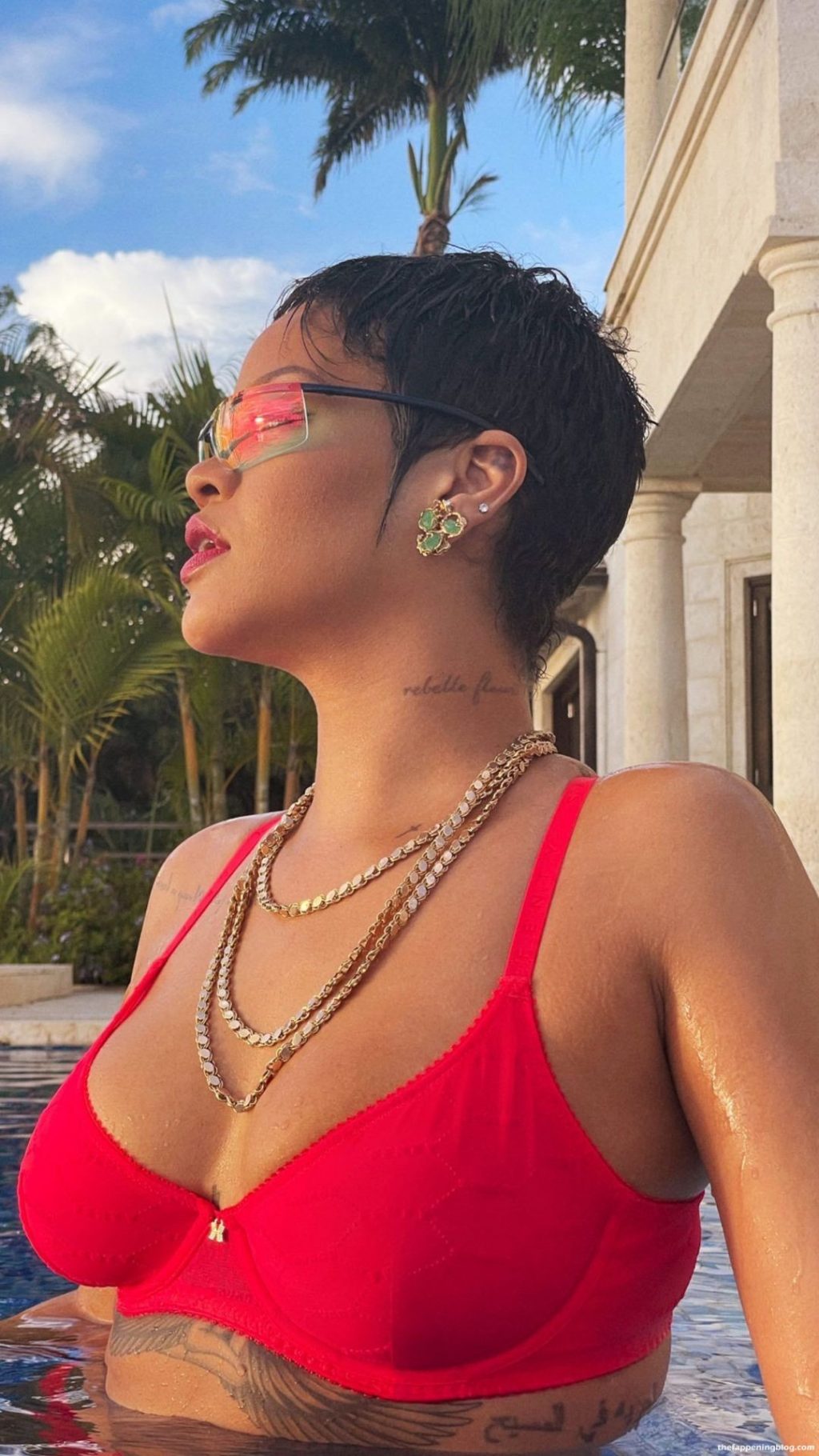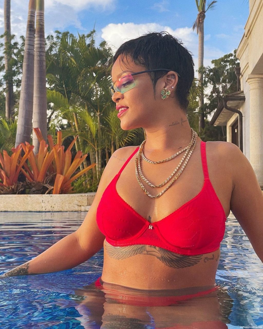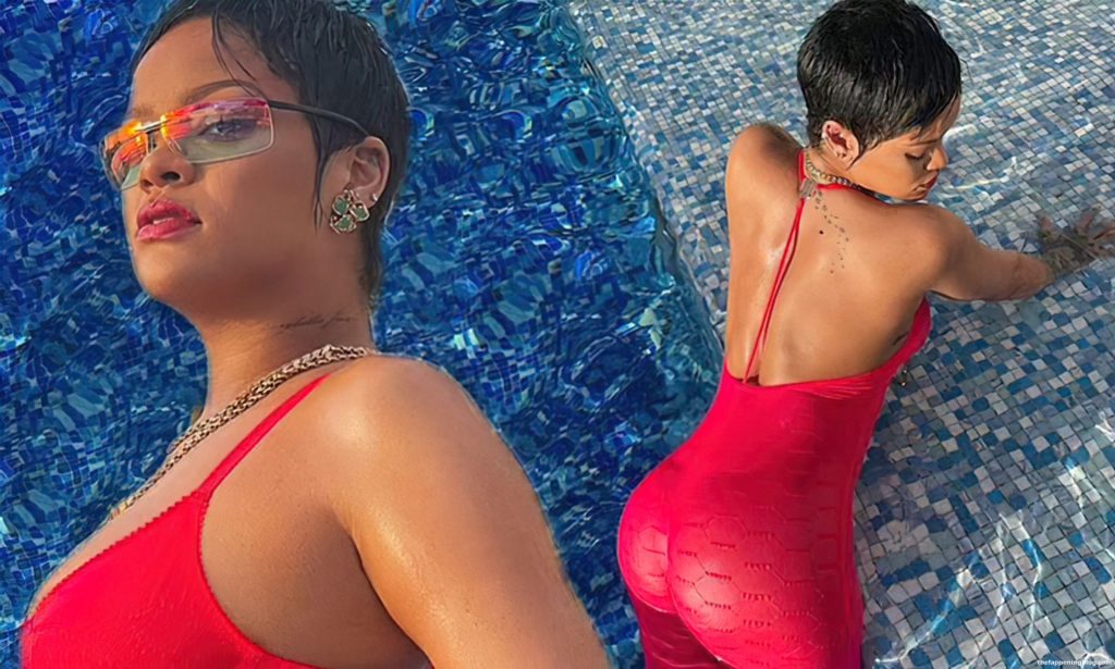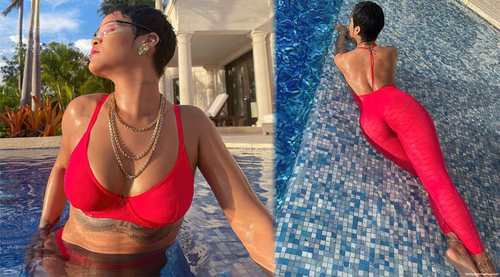 Rihanna est photographiée en train de poser avec un soutien-gorge rouge et des sous-vêtements dans la piscine (août 2021). Elle fait sensation dans un body rouge vif Savage X Fenty tout en se rafraîchissant avec une baignade dans la piscine.