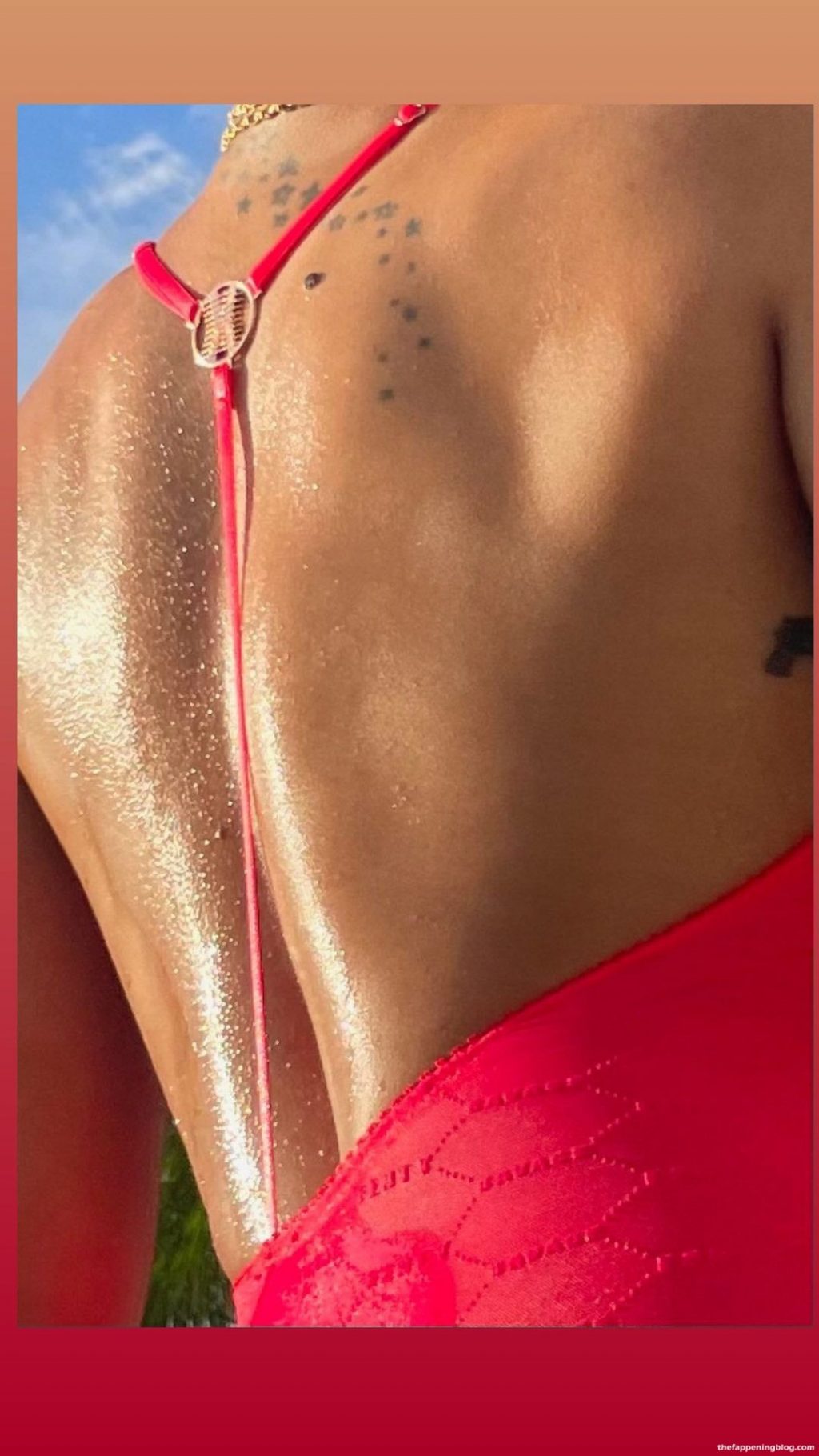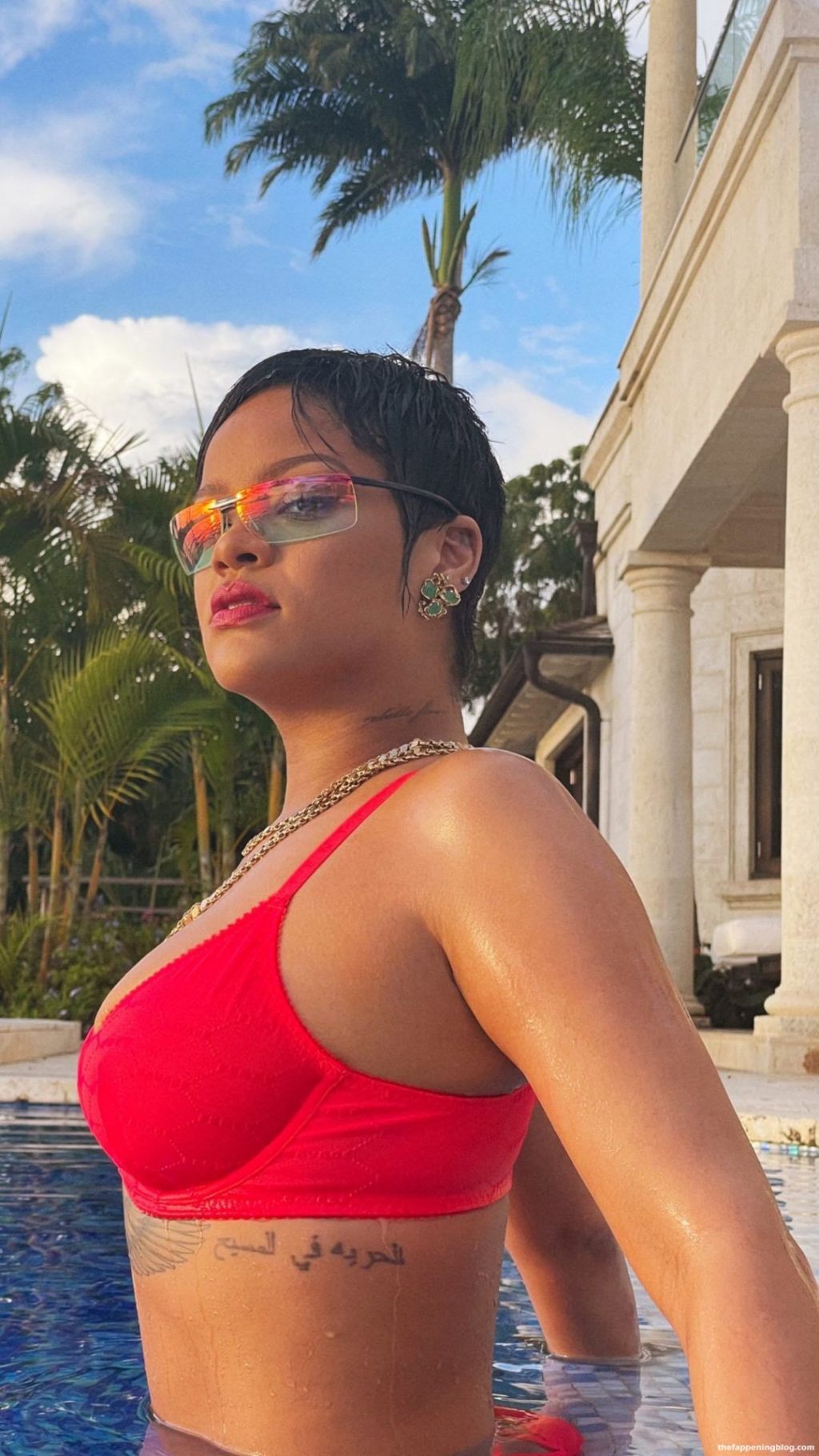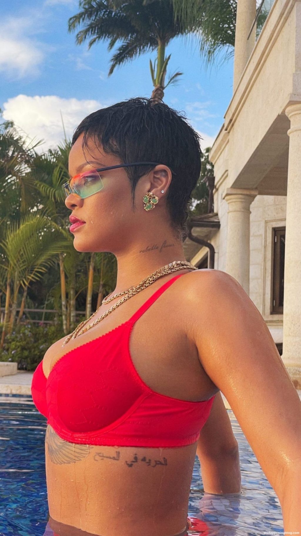 Rihanna est photographiée en train de poser avec un soutien-gorge rouge et des sous-vêtements dans la piscine (août 2021). Elle fait sensation dans un body rouge vif Savage X Fenty tout en se rafraîchissant avec une baignade dans la piscine.