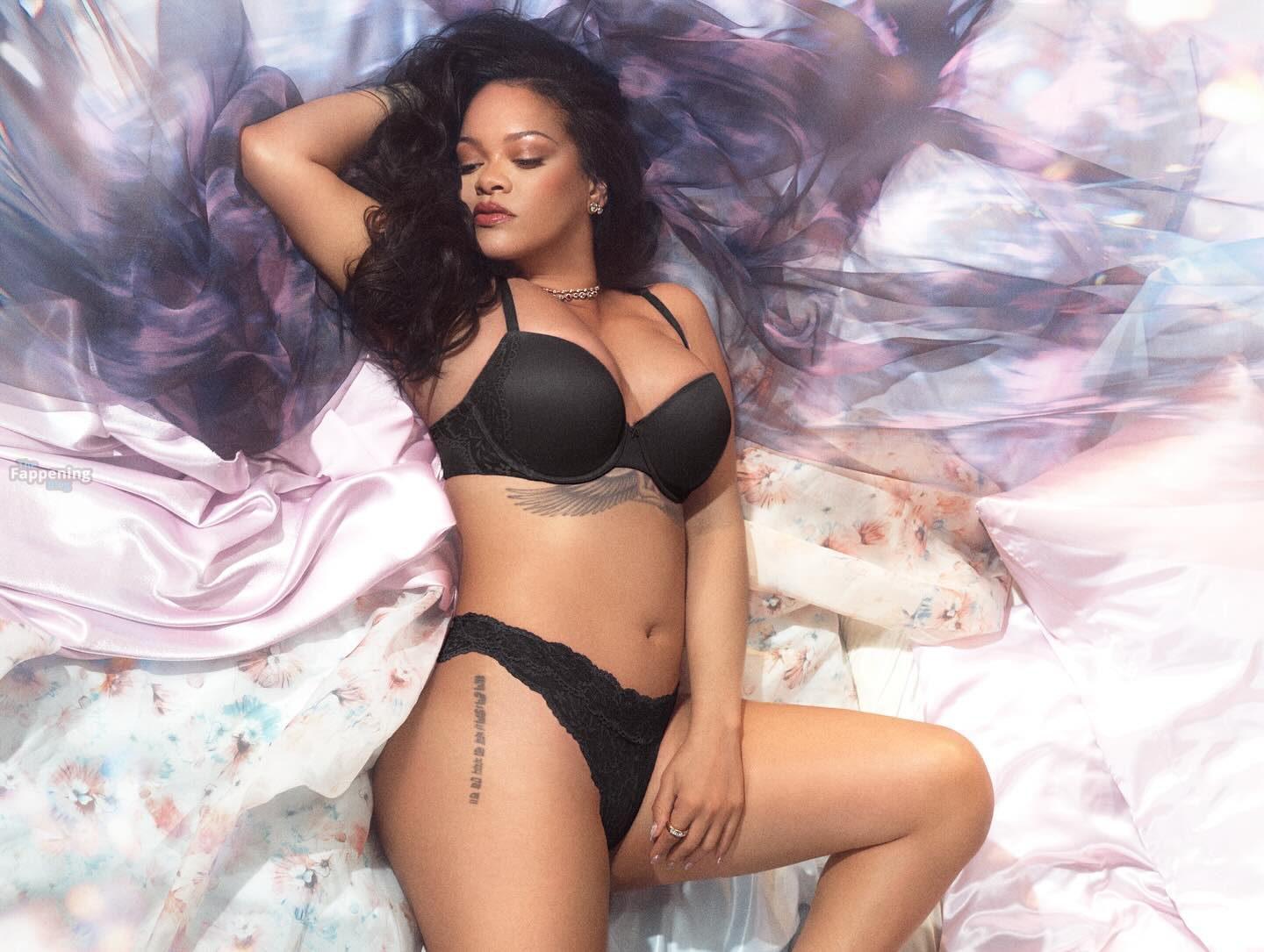 Rihanna pose en lingerie Soft n’ Savage de Savage x Fenty, exhibant sa généreuse poitrine et ses jambes sexy.