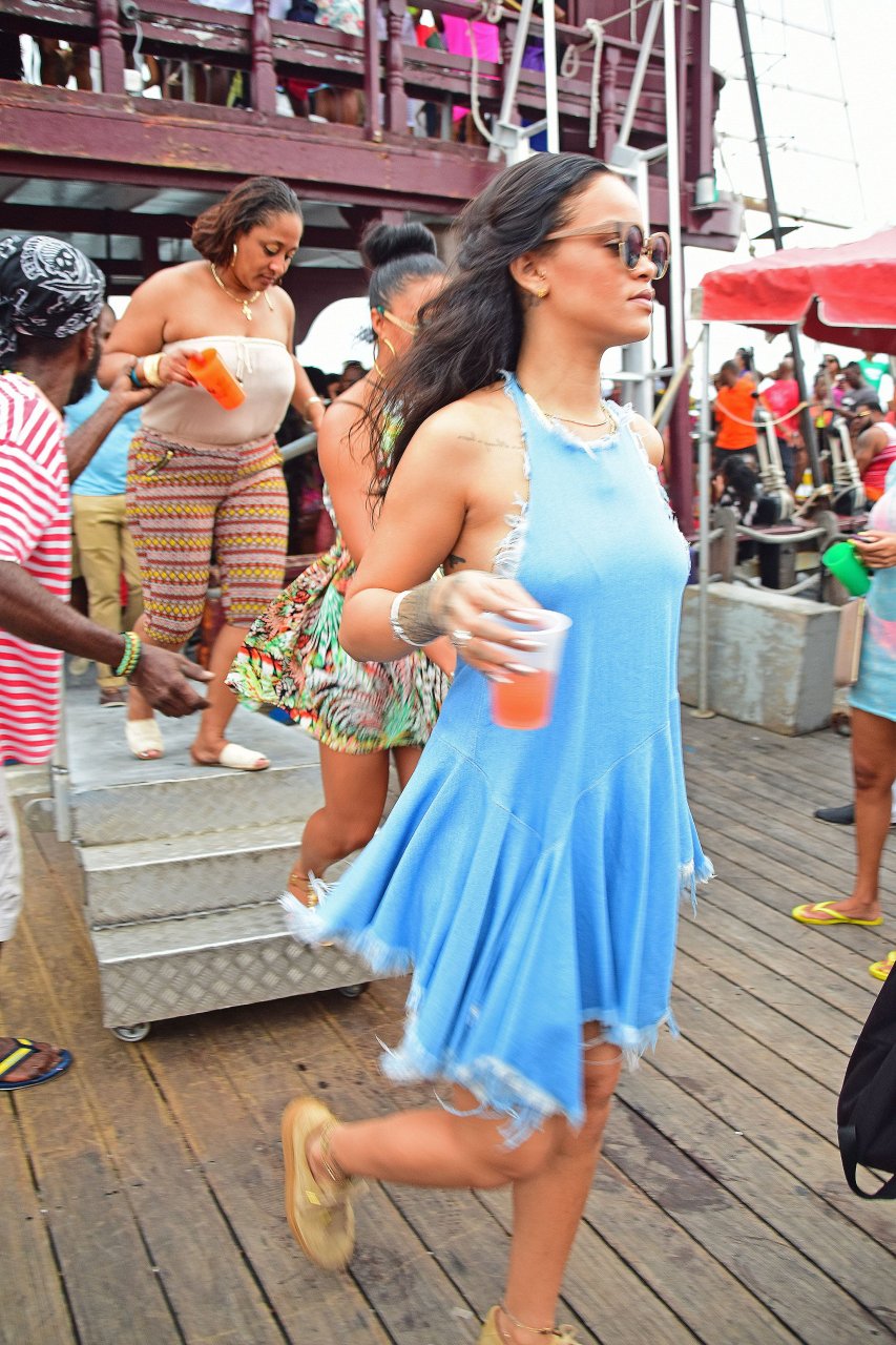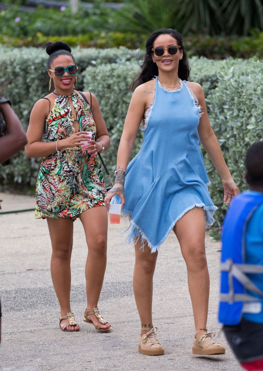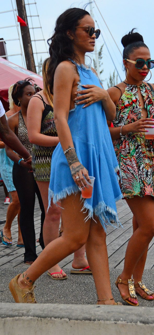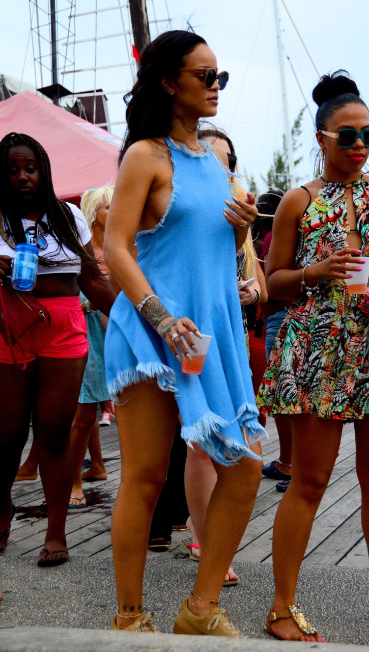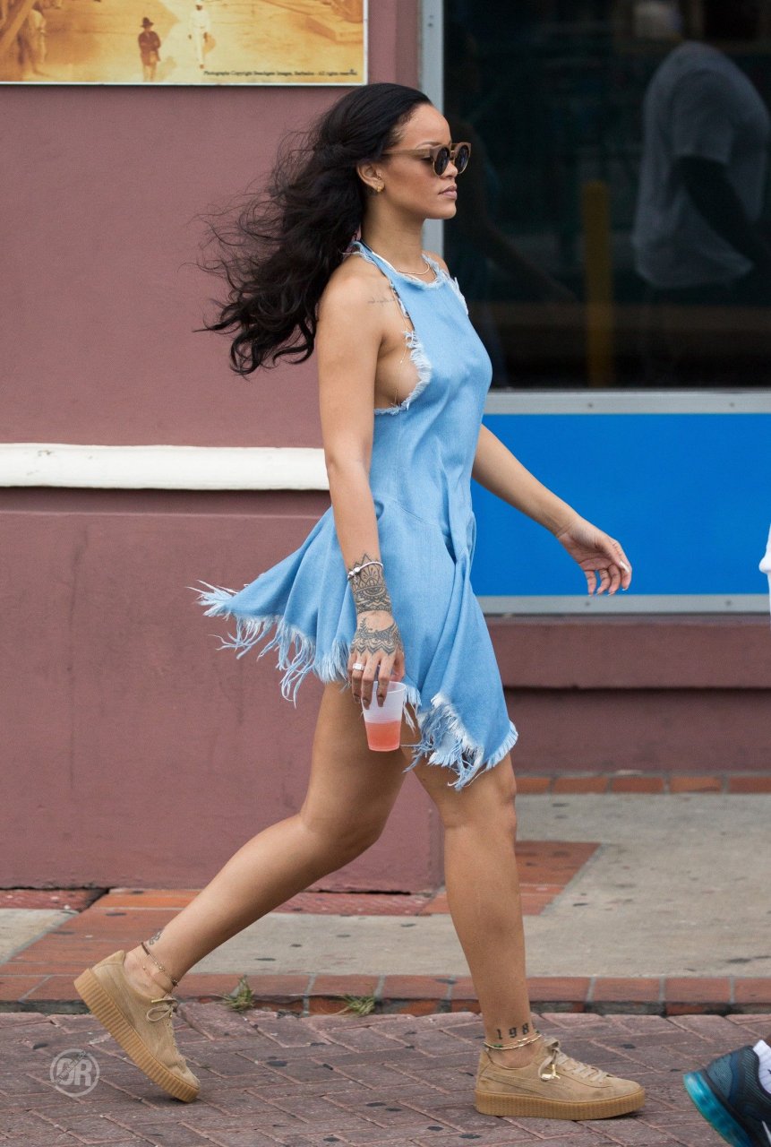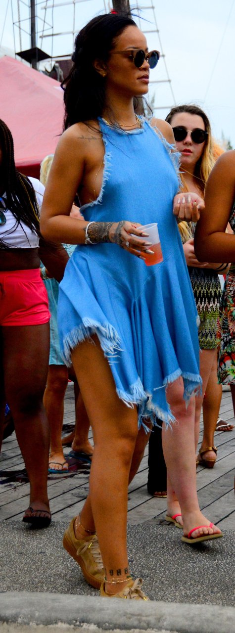 Nouvelles photos paparazzi de Rihanna sans soutien-gorge dans une robe bleue à la Barbade, 27/12/15. Douces petites poitrines ! Rihanna est une chanteuse et créatrice de mode américaine. Âge 27 ans (20 février 1988)