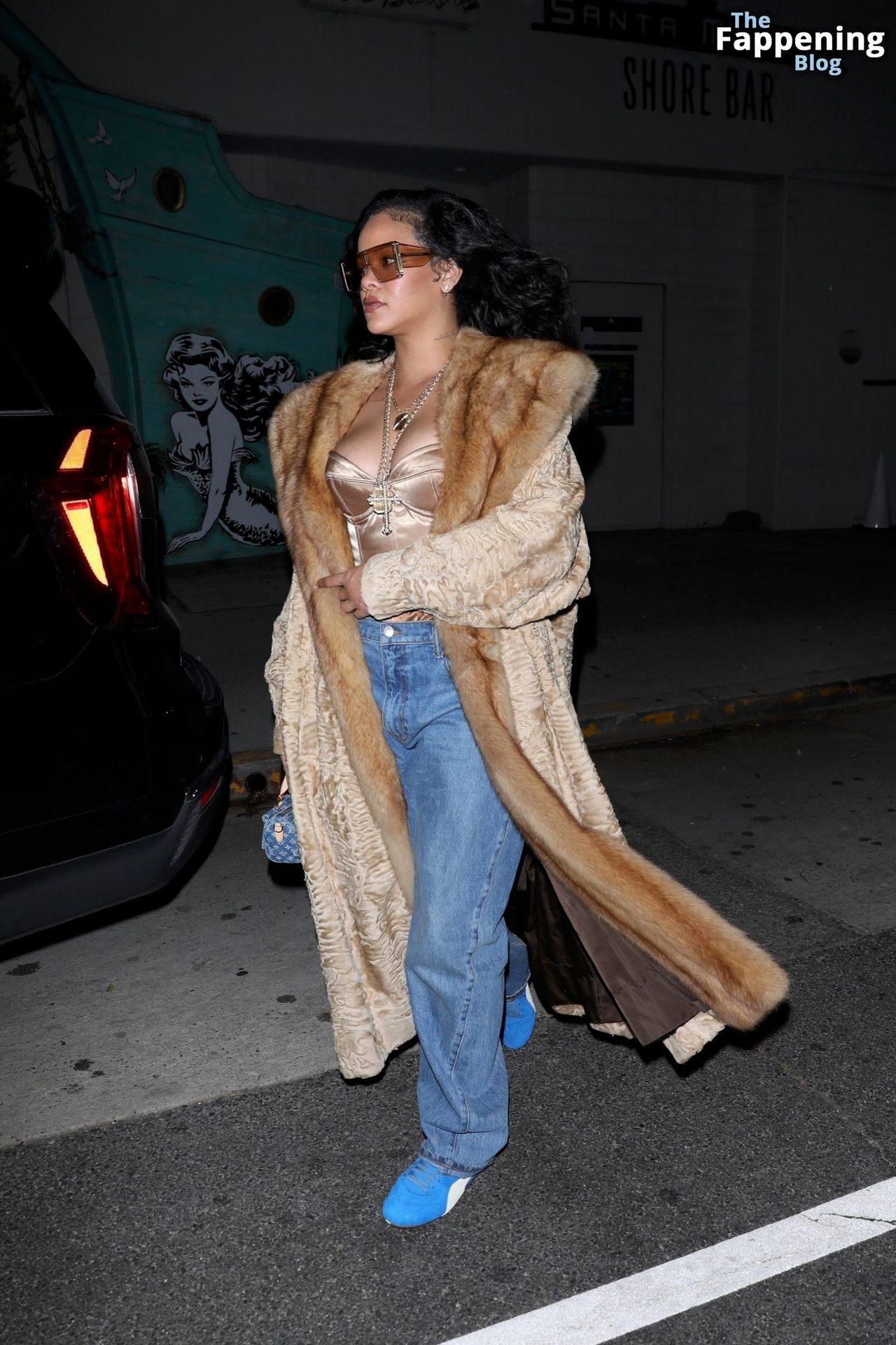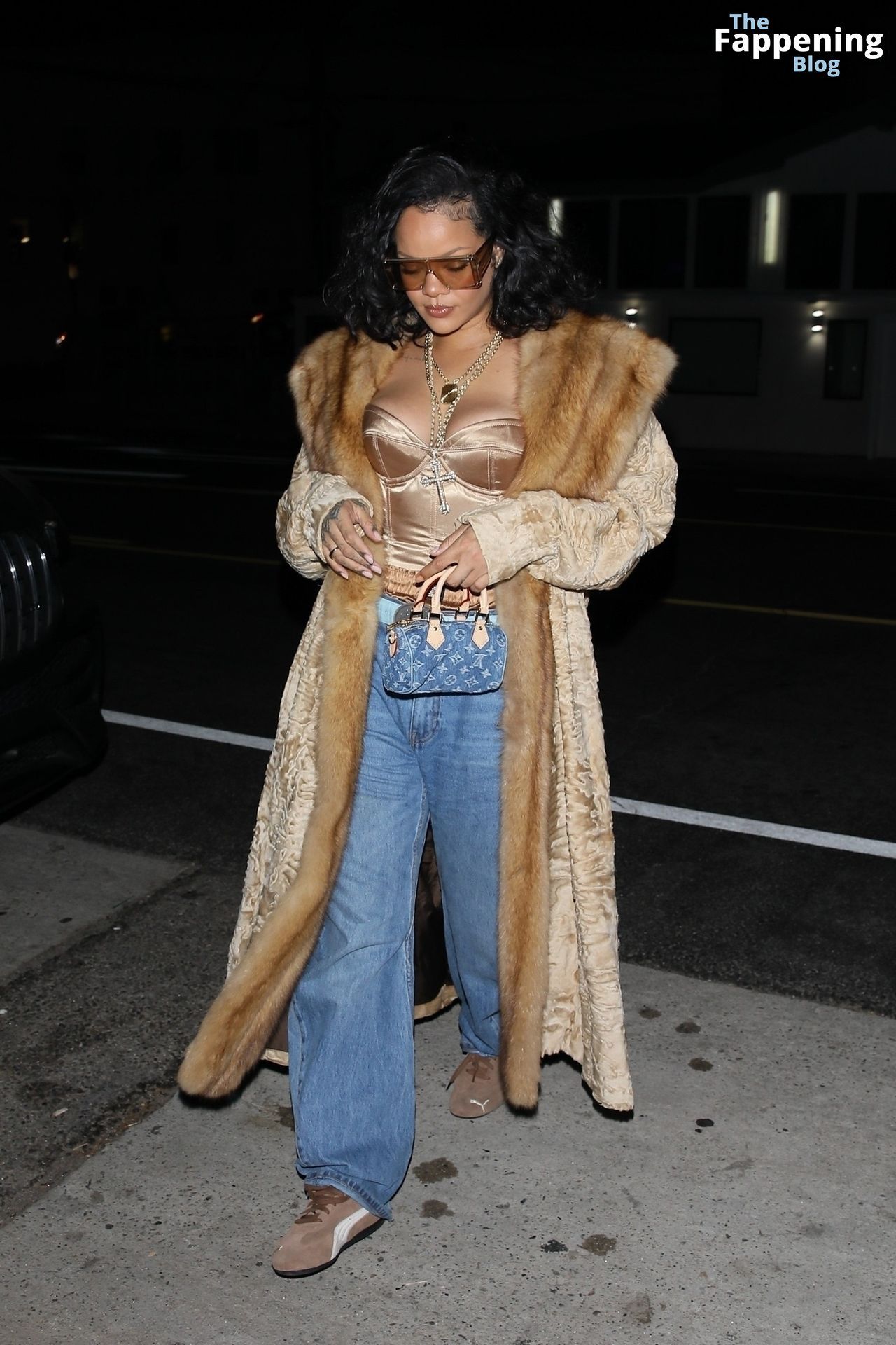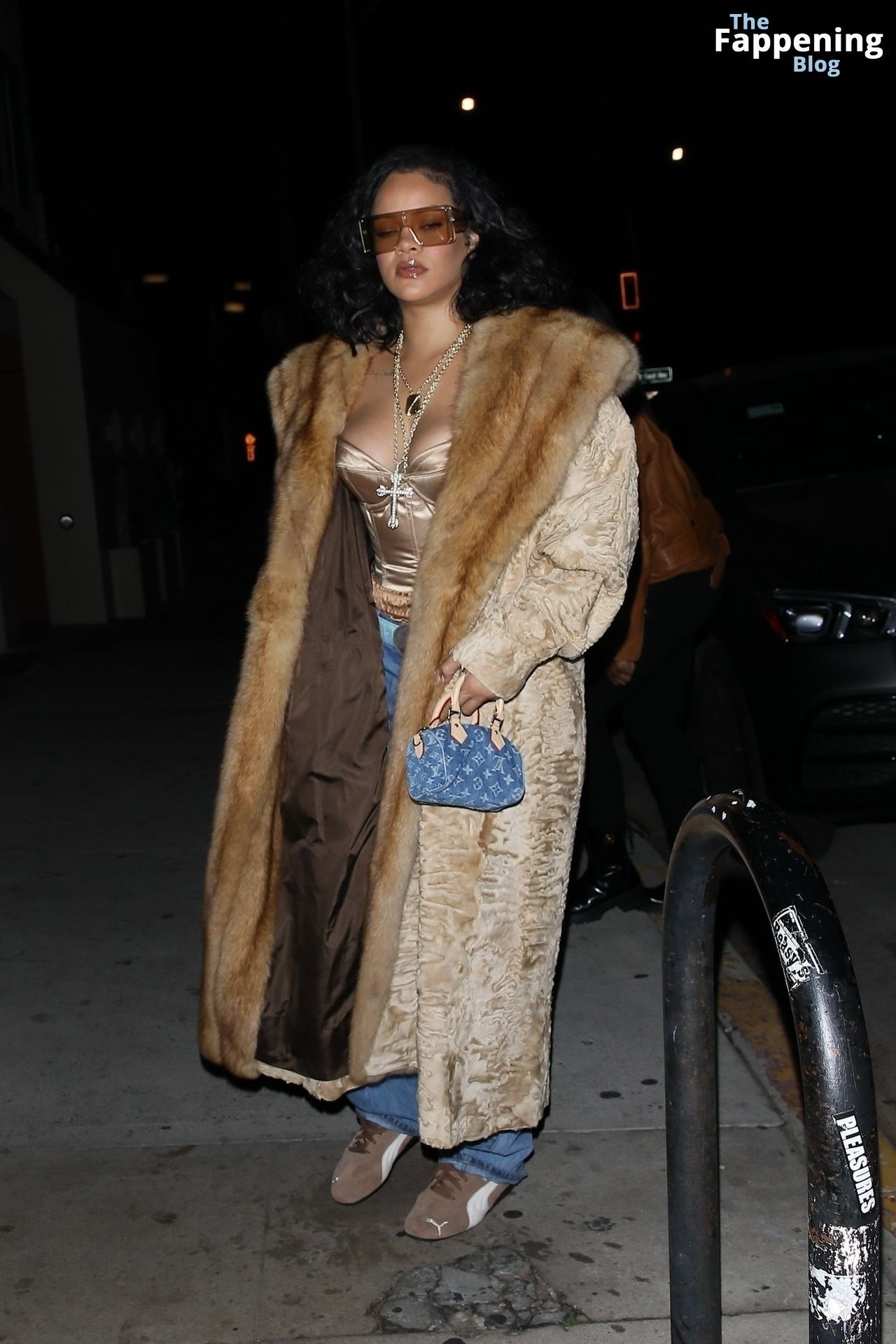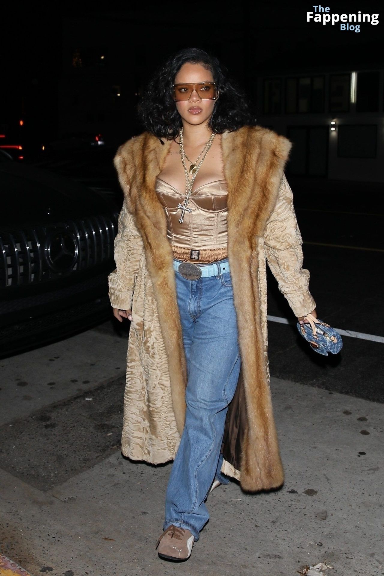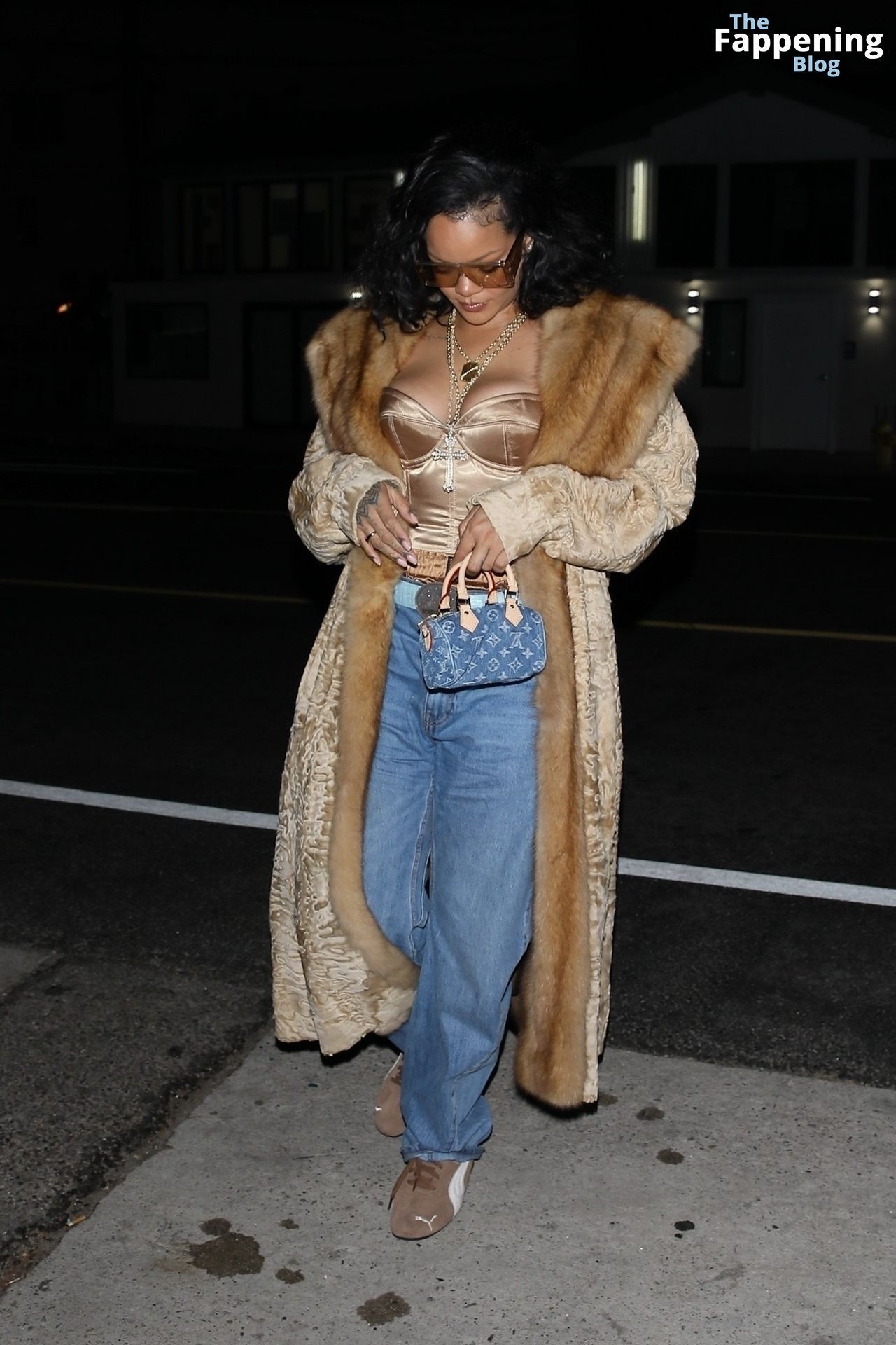 Rihanna éblouit chez Giorgio Baldi à Santa Monica, arrivant dans un look chic et superposé avec un somptueux manteau de fourrure posé sur un corset en satin ajusté et un jean taille haute au style décontracté.
