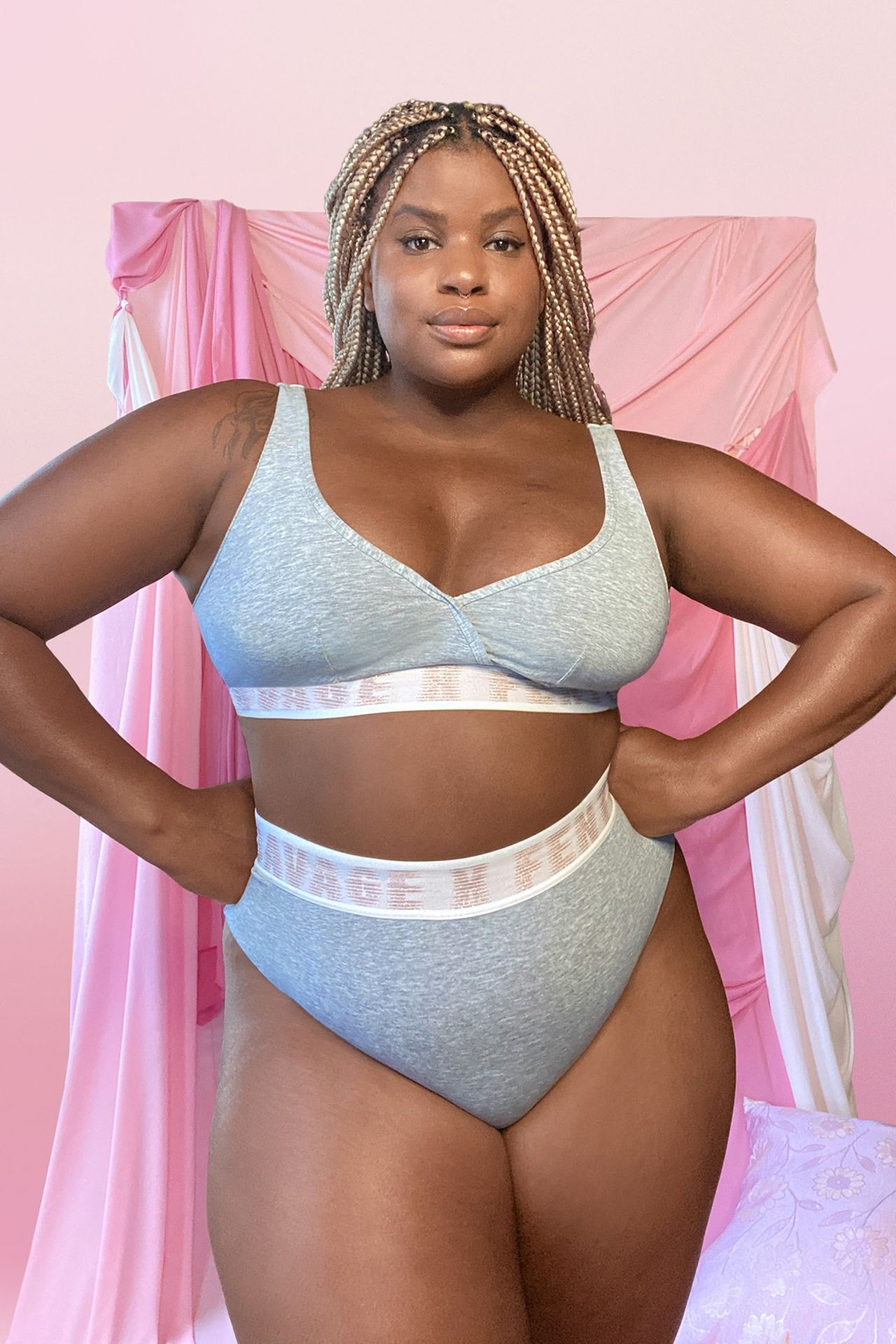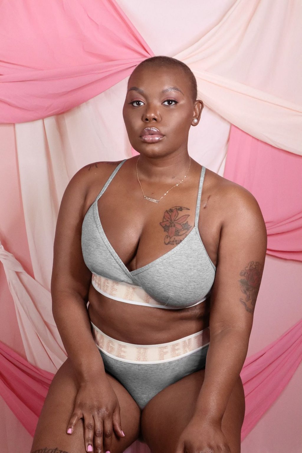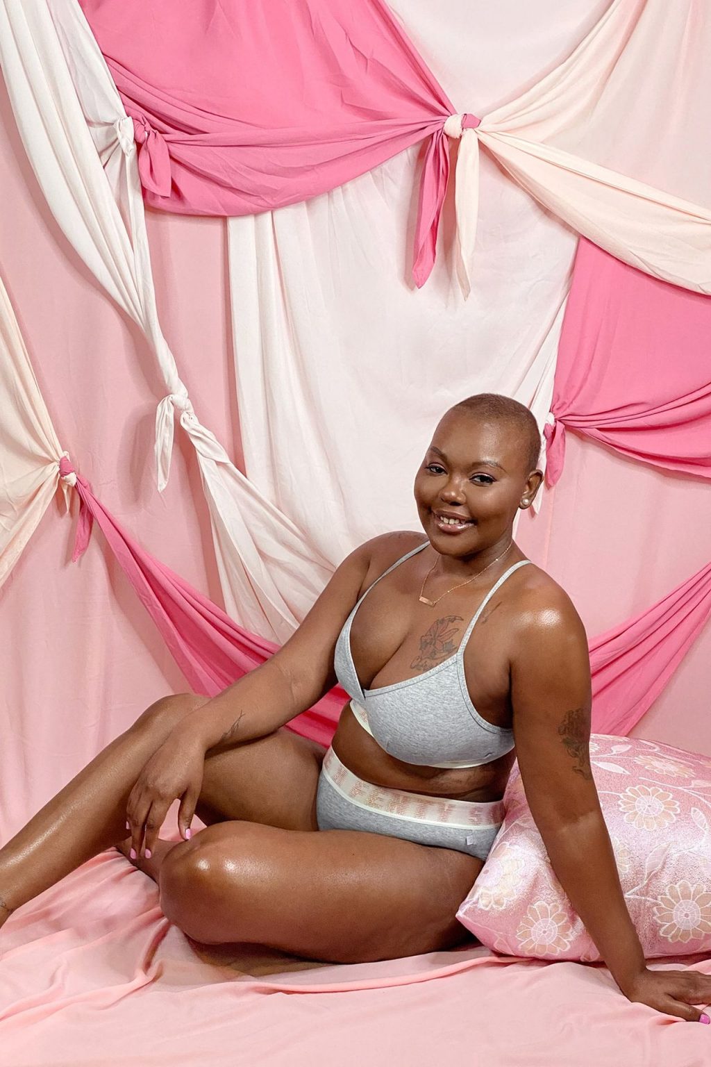 Cayatanita, diagnostiquée d’un cancer du sein à l’âge de 32 ans, porte le nouveau ensemble soutien-gorge et culotte rose blush. Ericka, une survivante queer femme des cancers du sein HER-2 positif et triple négatif, arbore un soutien-gorge gris à bonnet souple et une culotte taille haute.