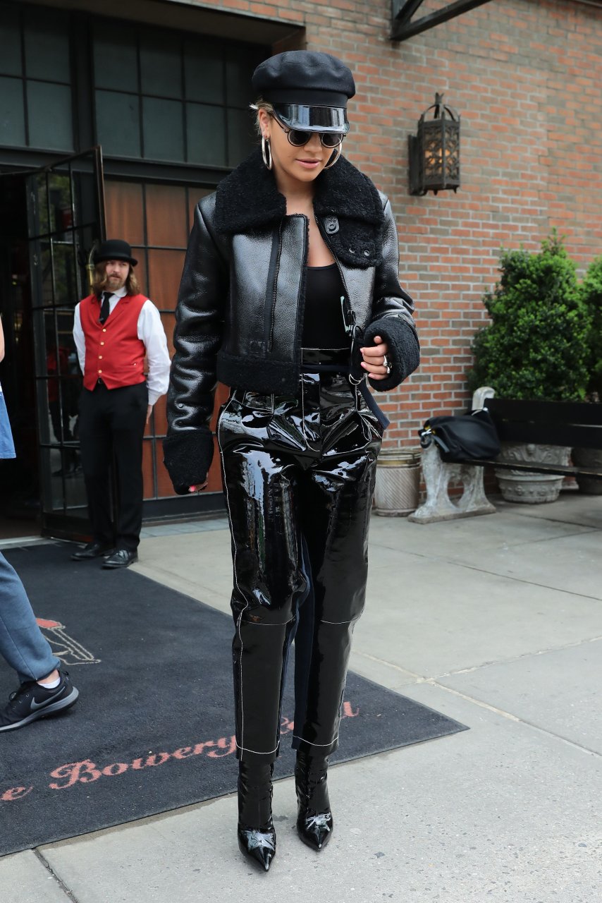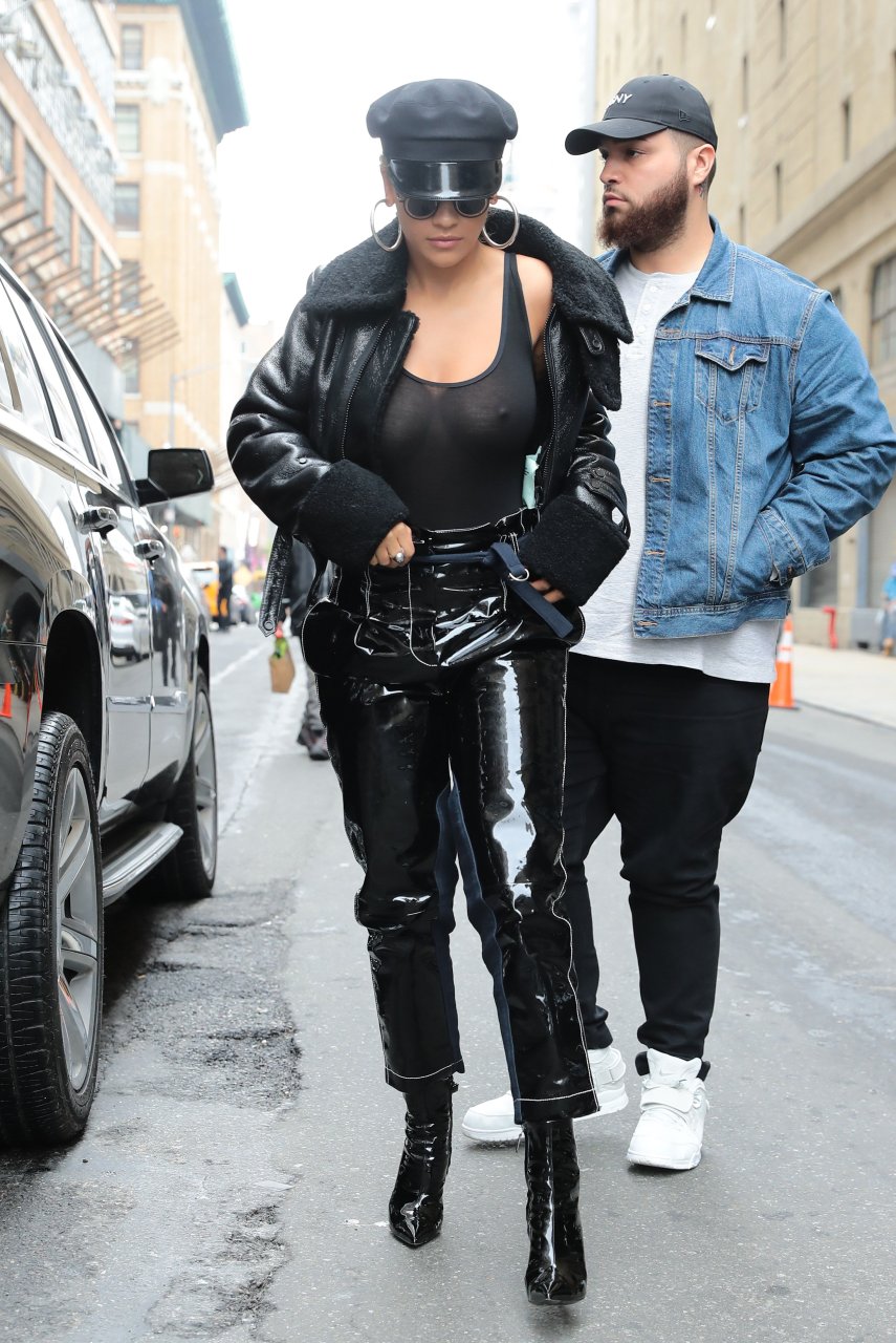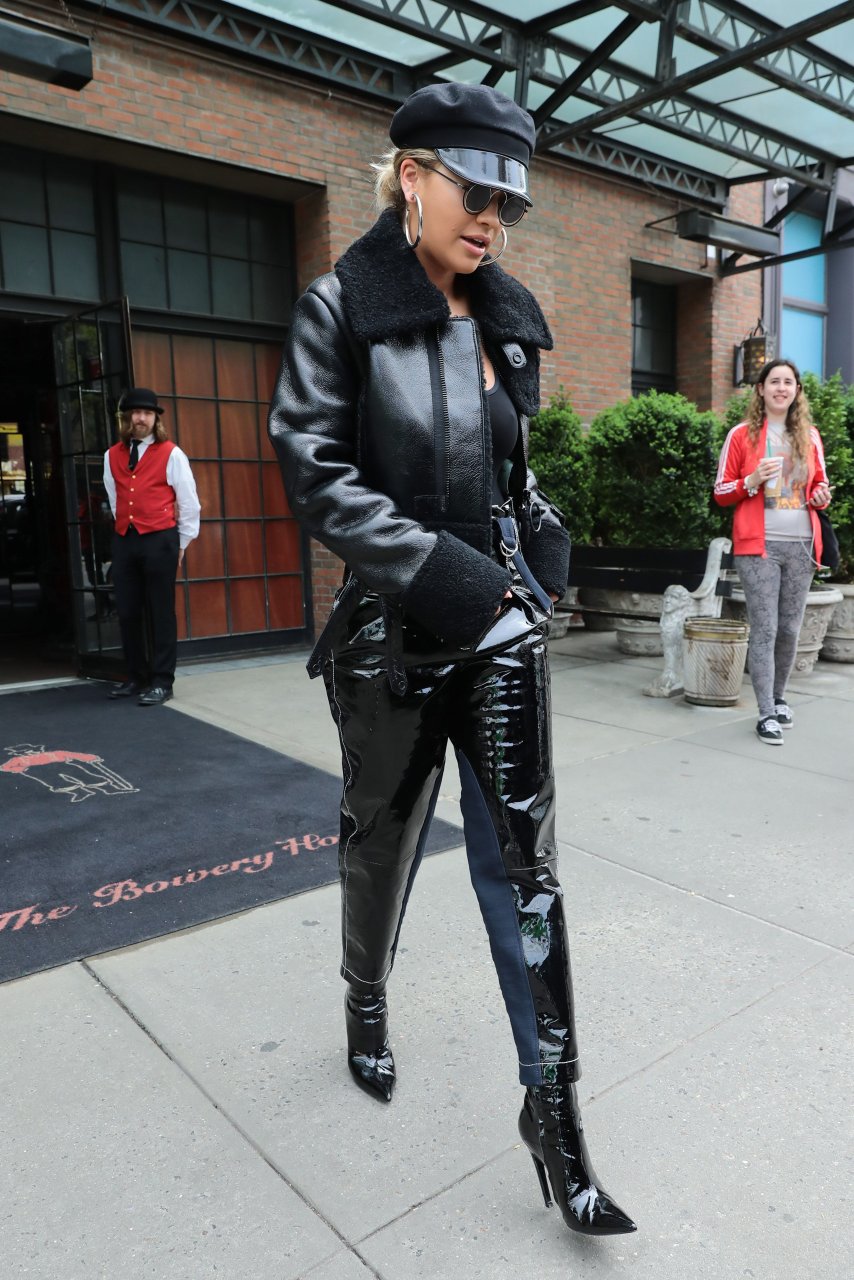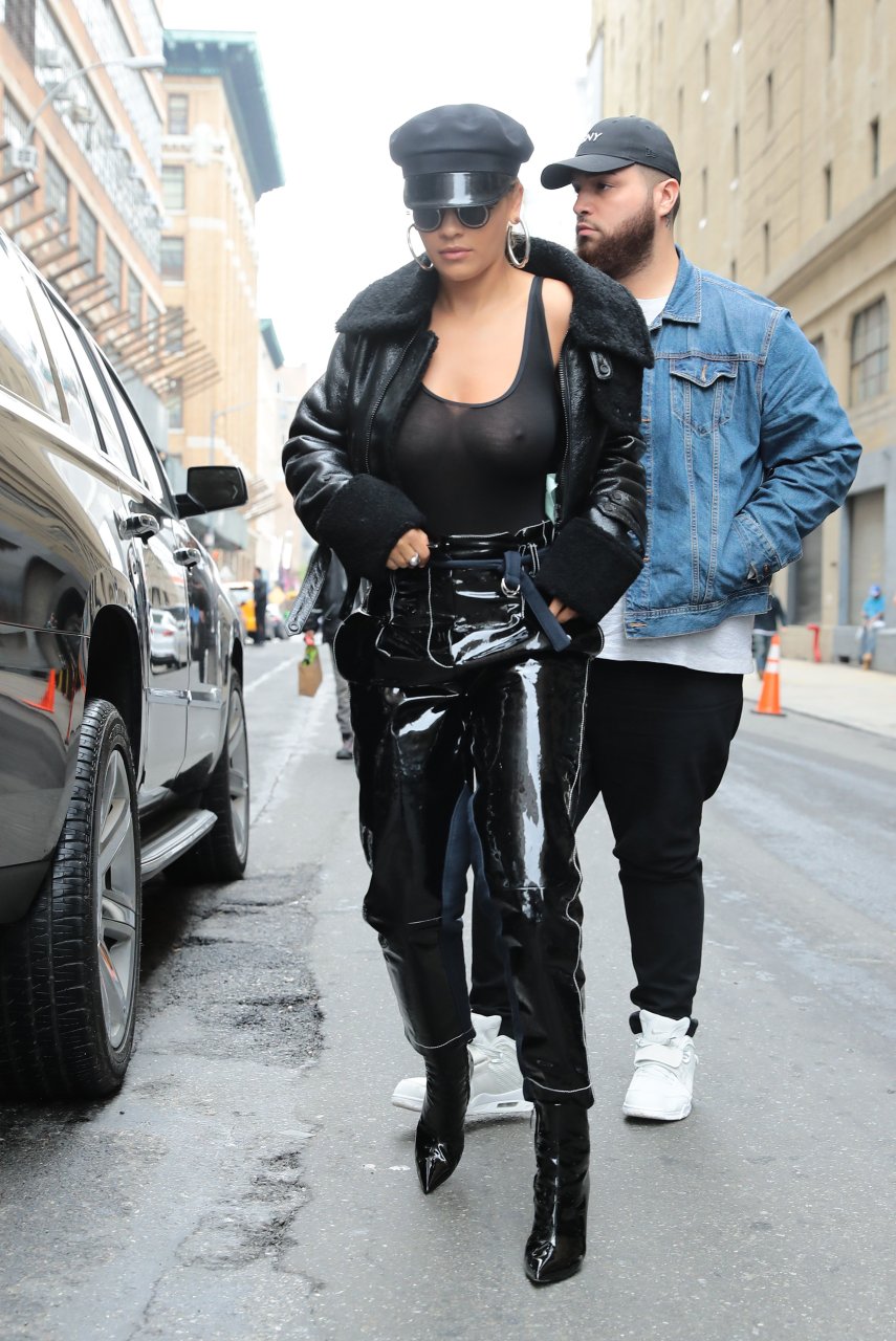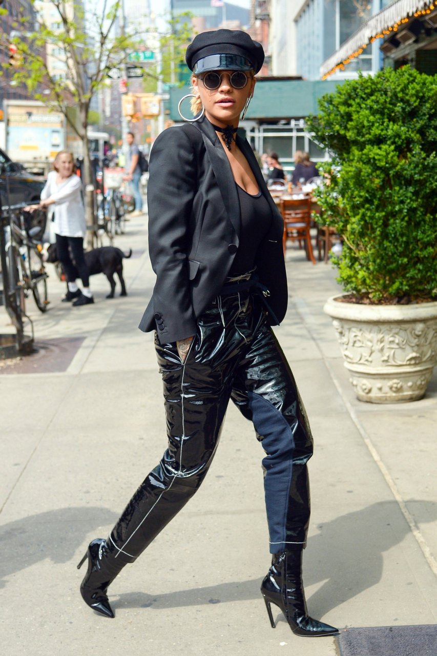 Rita Ora sans soutien-gorge porte un haut noir transparent à New York, 27/04/2017. Rita Ora est une chanteuse et actrice britannique (Cinquante nuances plus claires, 2018). Âge – 26 ans.
