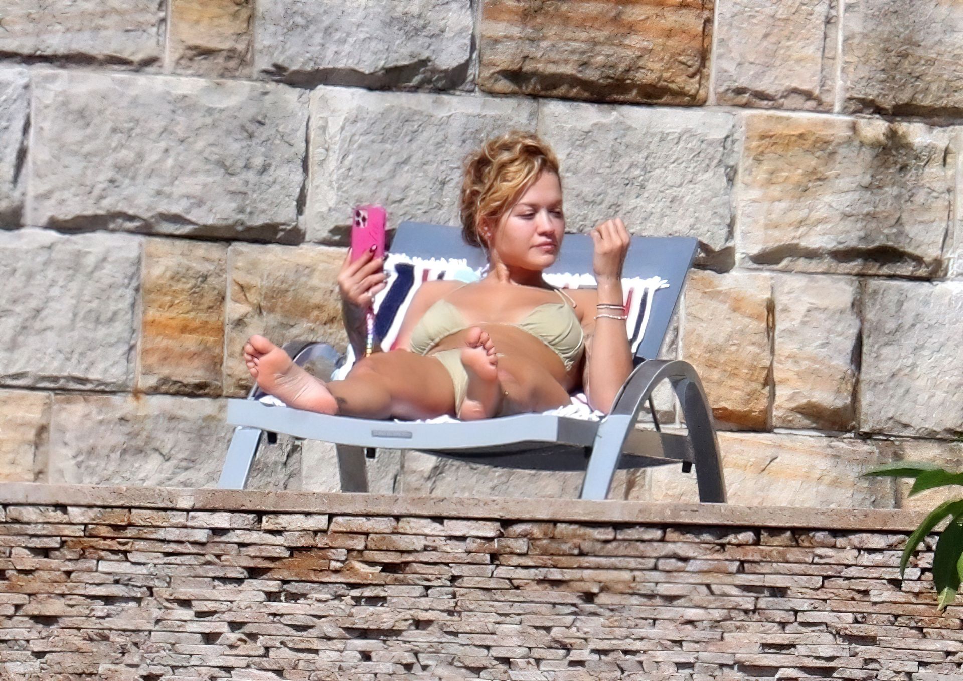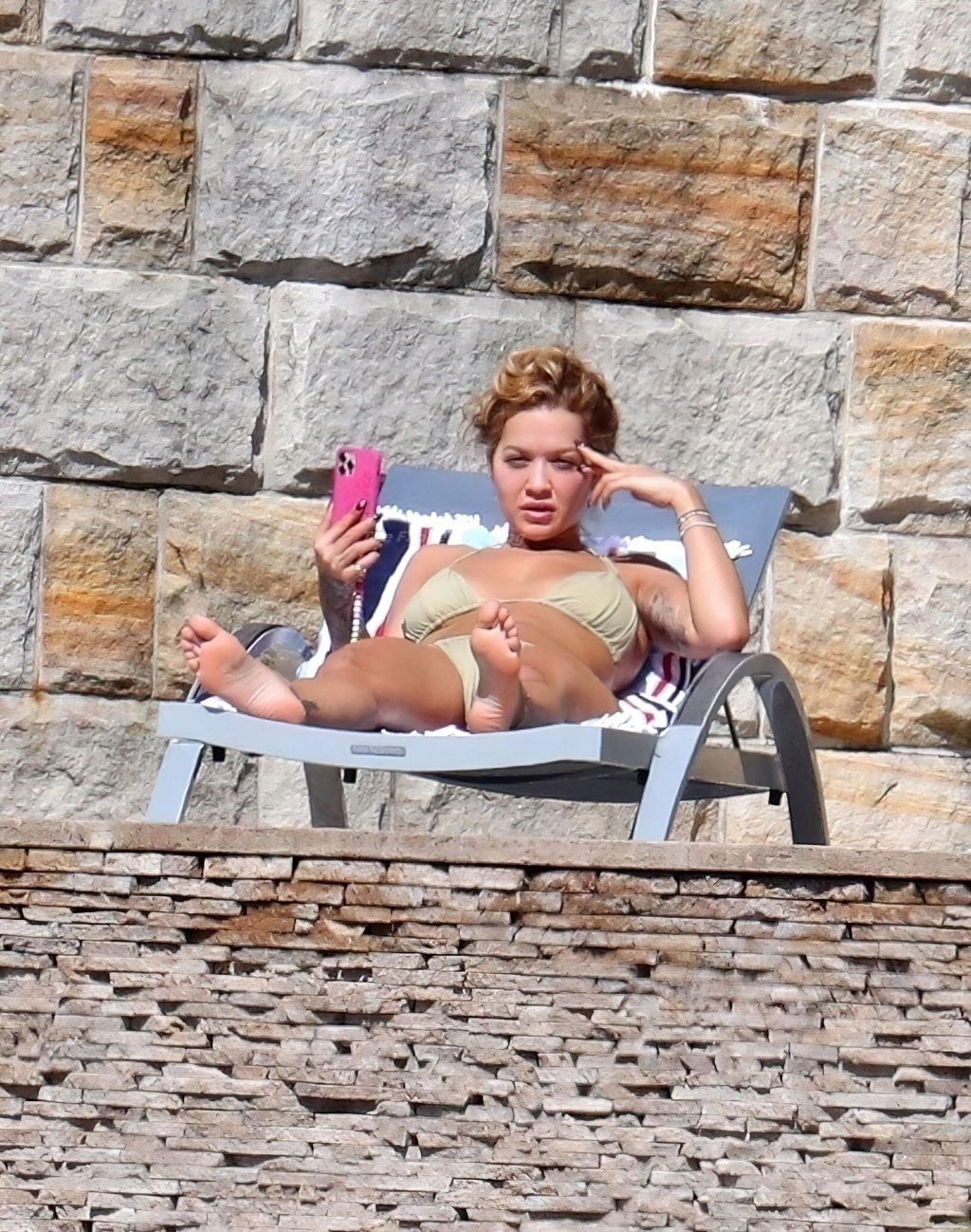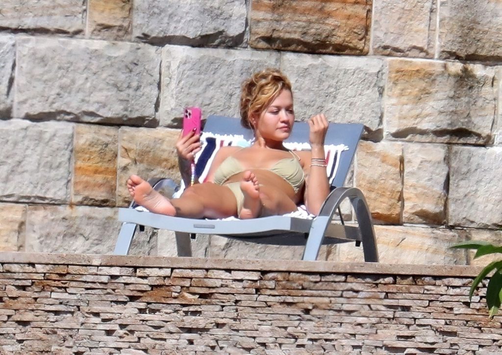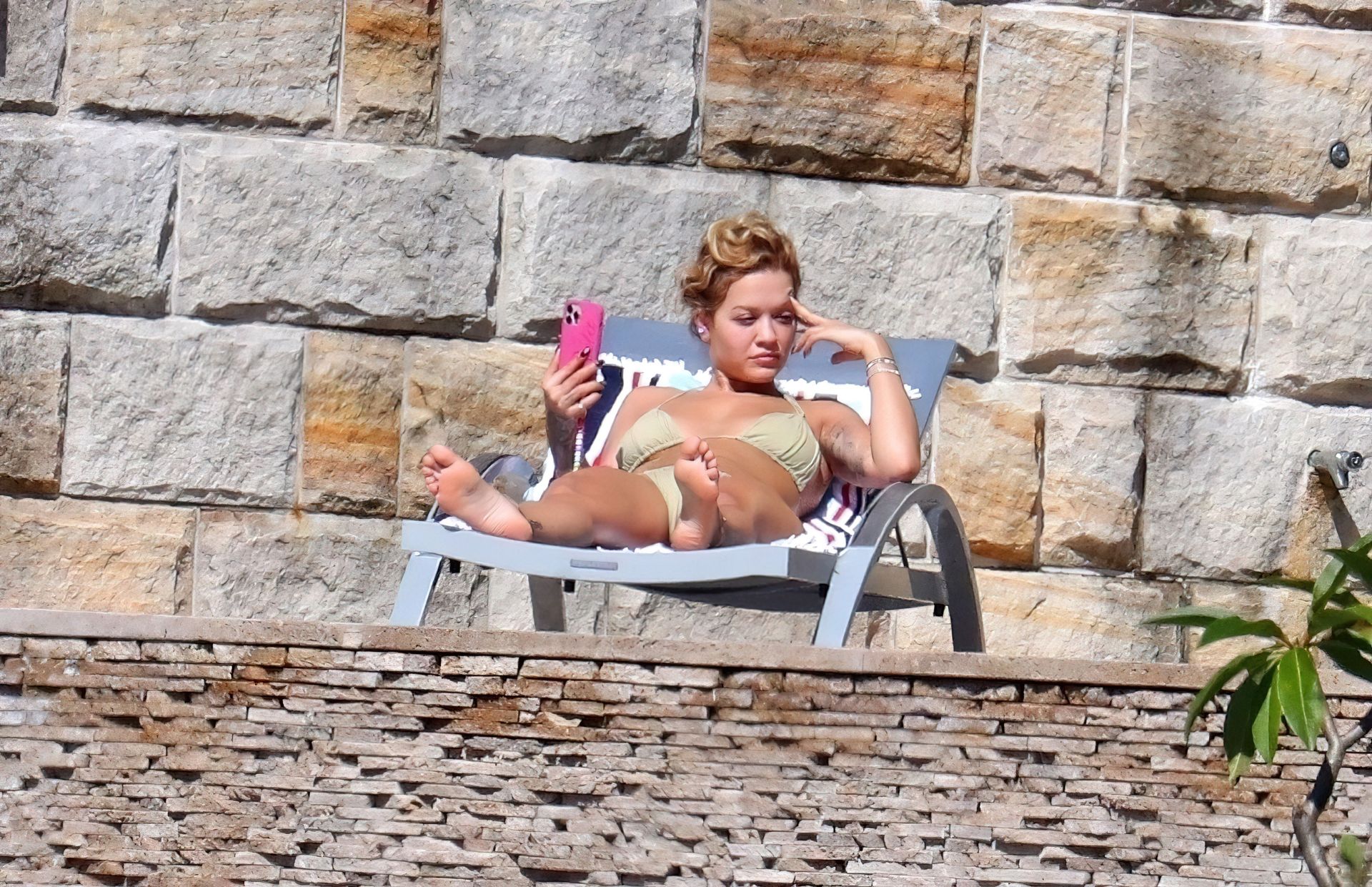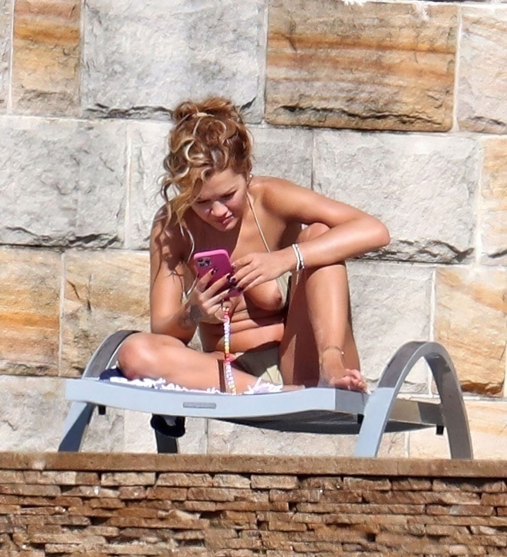 Chanteuse Rita Ora a l’air ‘Hot Right Now’ alors qu’elle se détend au bord de la piscine portant un bikini vert et montrant ses seins nus pour nous – Sydney, 31/03/2021.