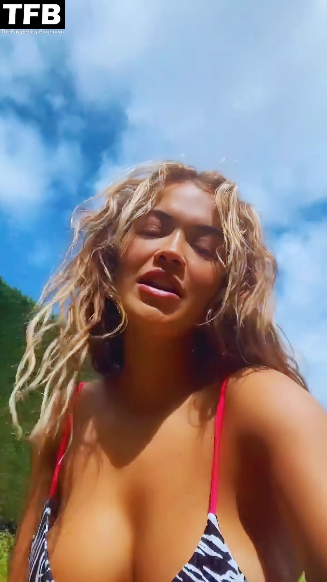 La chanteuse Rita Ora nous taquine avec de magnifiques seins naturels, montrant son aréole, posant dans un minuscule bikini dans la nouvelle vidéo Instagram ci-dessous (2021).
