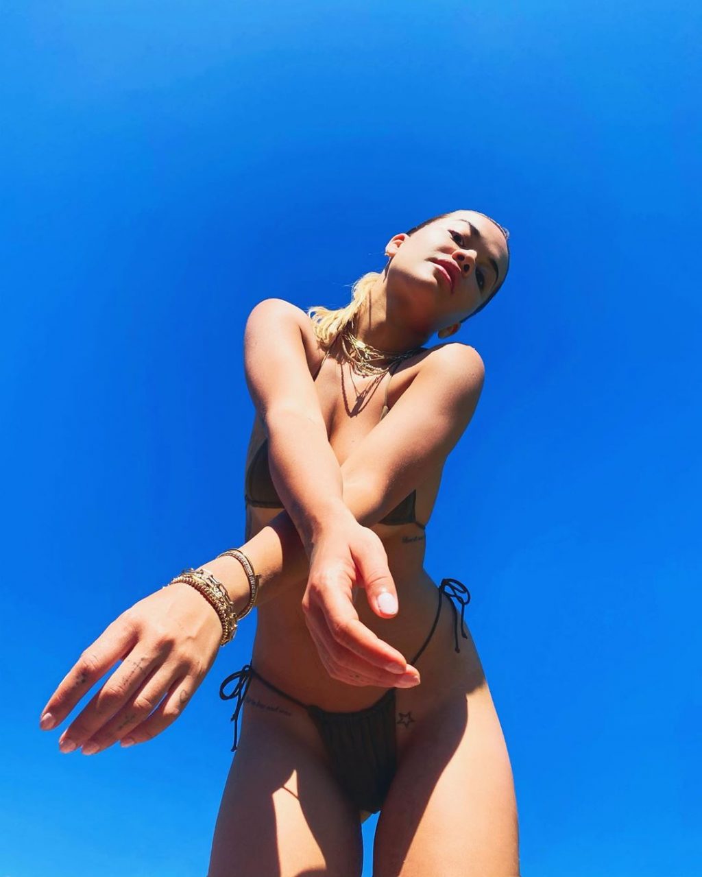 La chanteuse Rita Ora montre ses seins en posant dans un tout petit bikini Inamorata pour ses 16,2 millions d’abonnés Instagram, 19/05/2020.