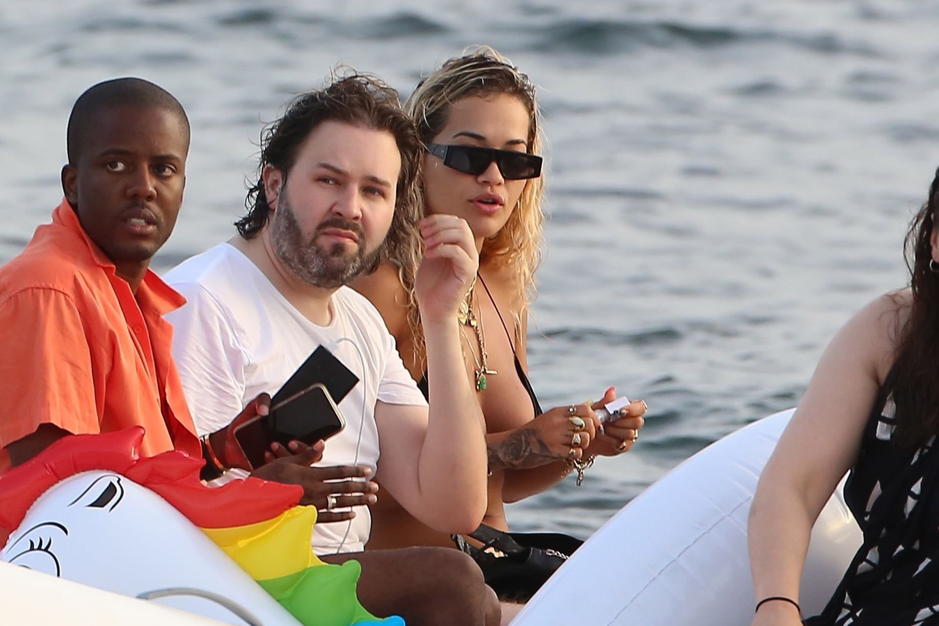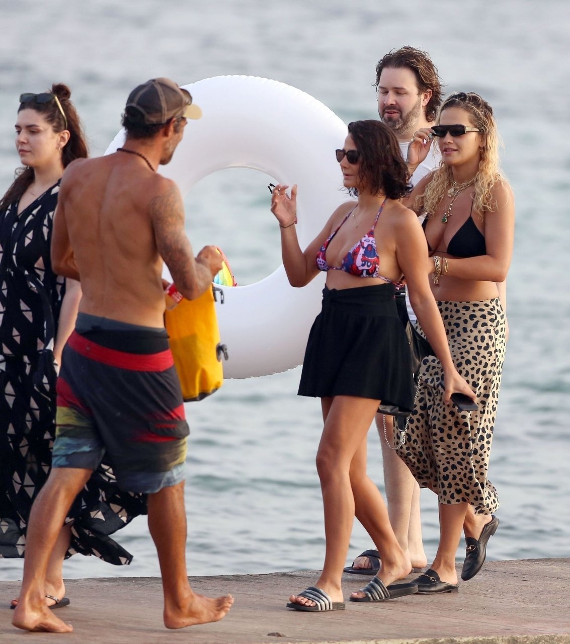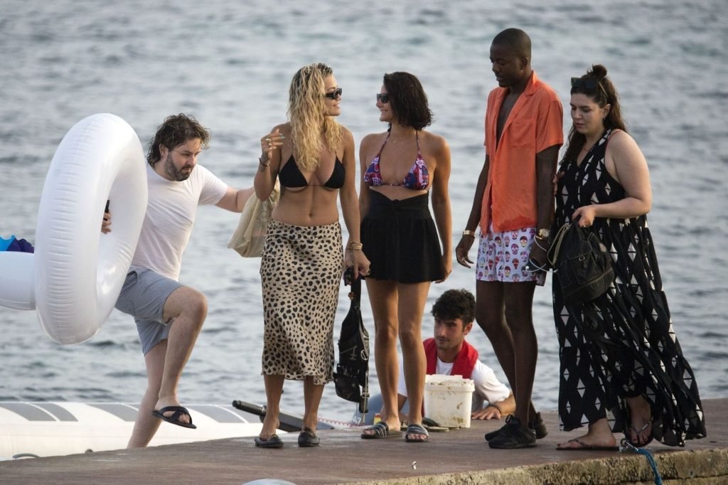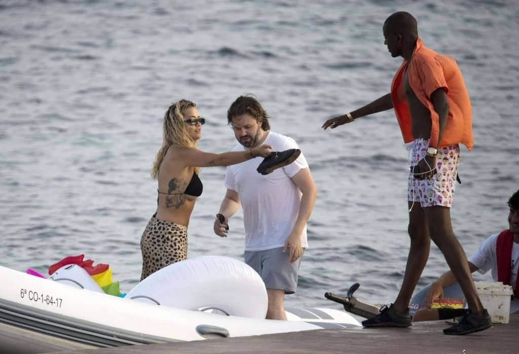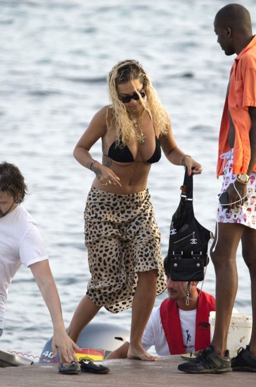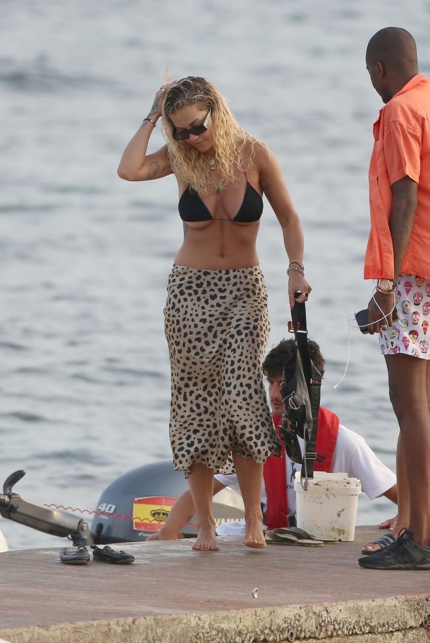 Rita Ora montre un sous-sein en descendant d’un bateau à Ibiza, 08/05/2019. La chanteuse-compositrice anglaise portait un bikini noir avec une jupe midi imprimée léopard et des mocassins Gucci noirs. Elle accessoirisait avec plusieurs colliers en or et des lunettes de soleil noires.