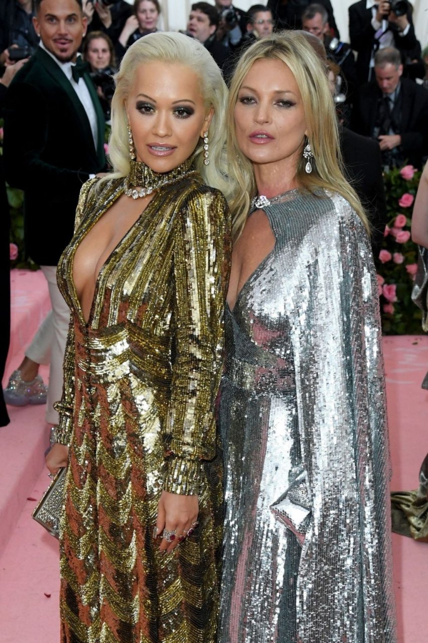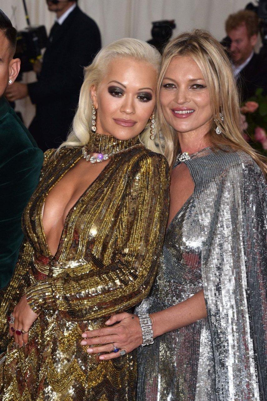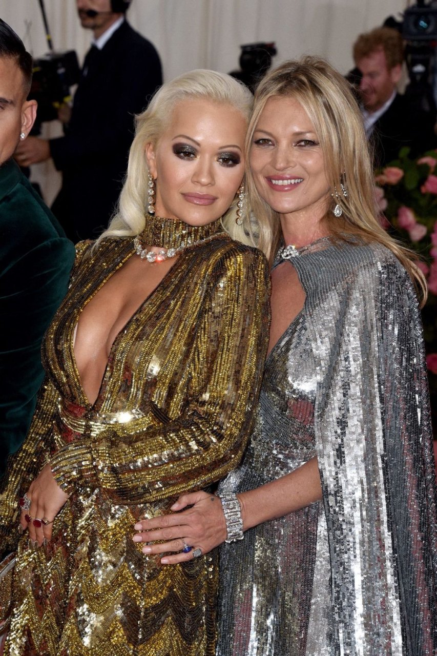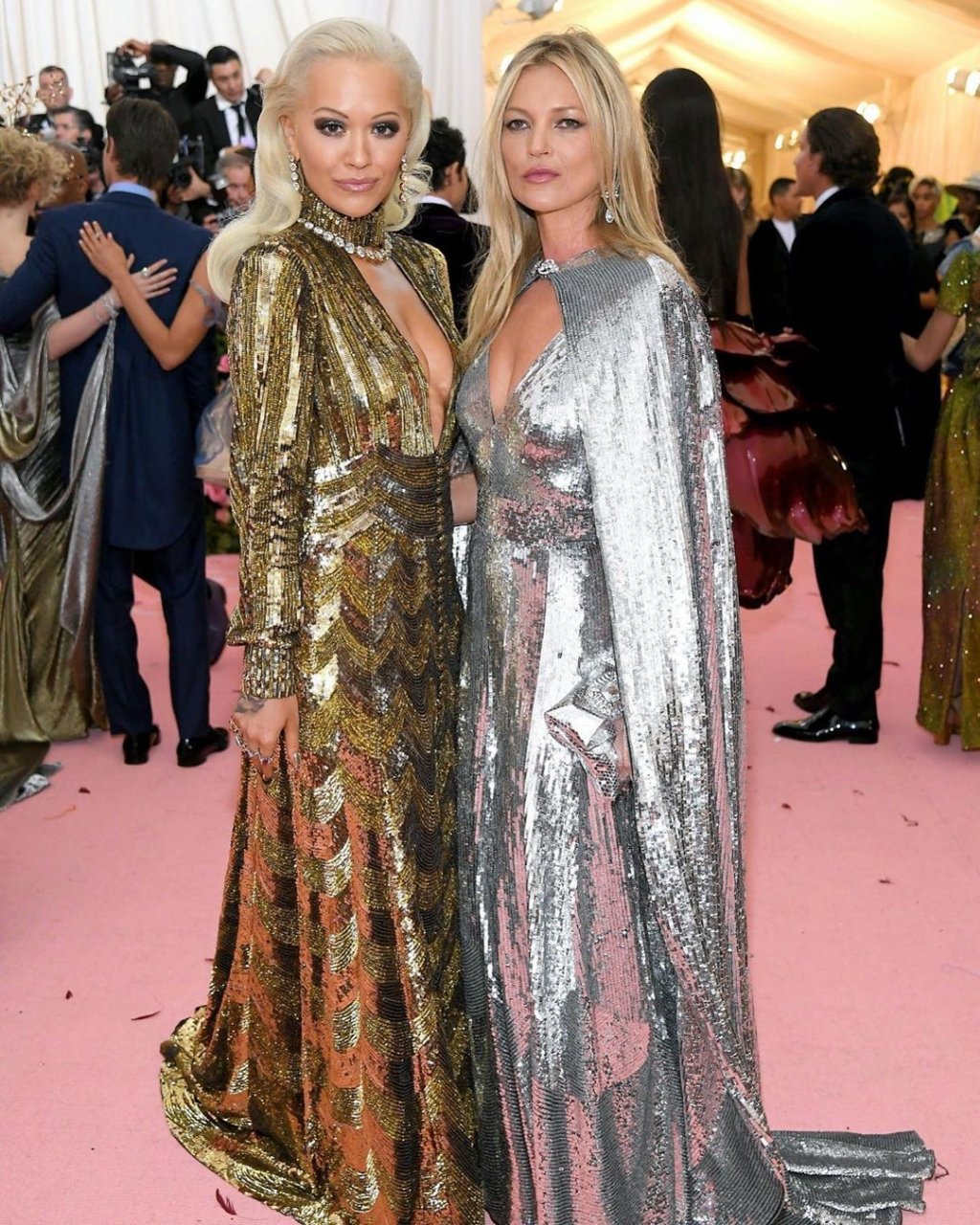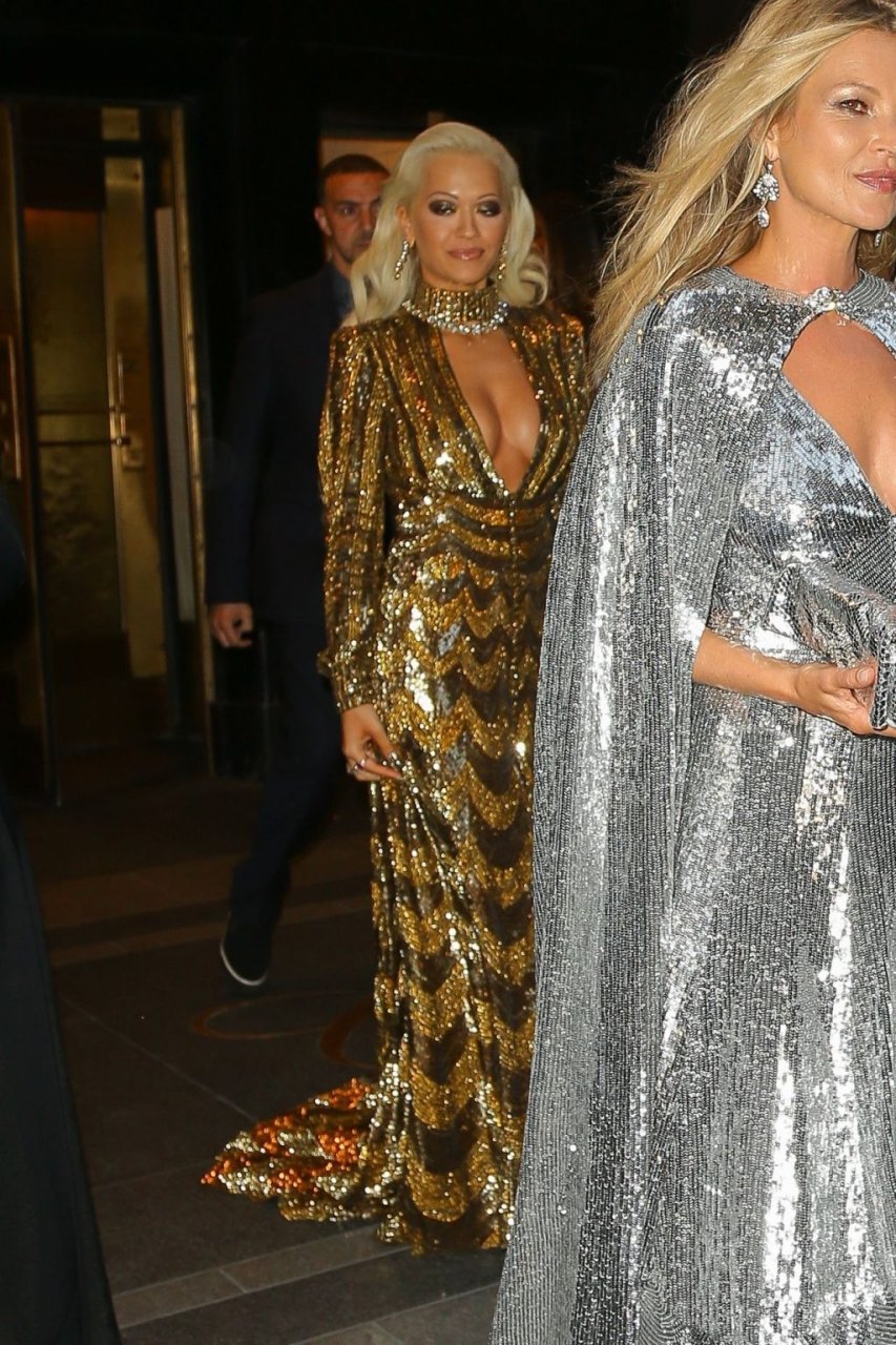 La chanteuse Rita Ora et le mannequin Kate Moss quittent l’hôtel Carlyle pour le Met Gala 2019 à New York, le 06/05/2019. Lors de l’événement, les stars sont apparues ensemble dans des robes dorées et argentées.