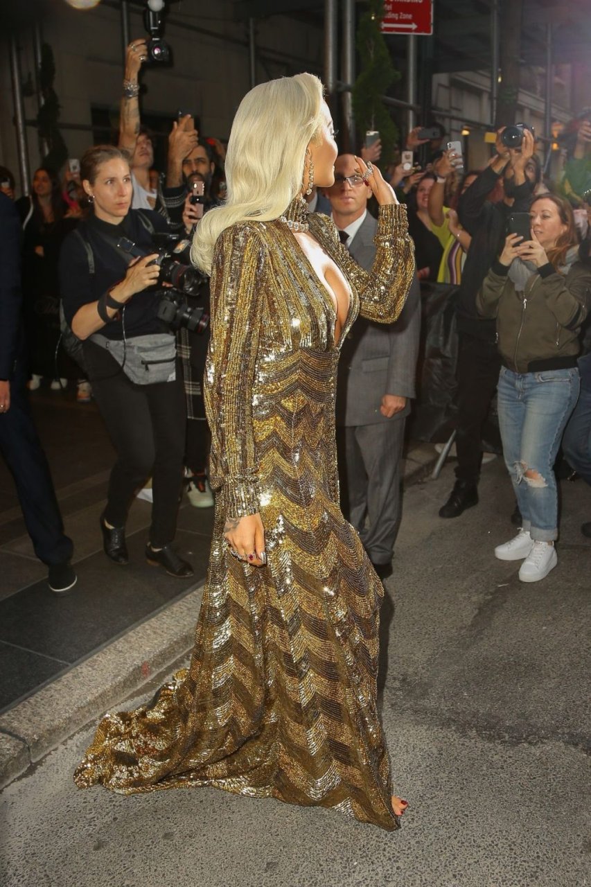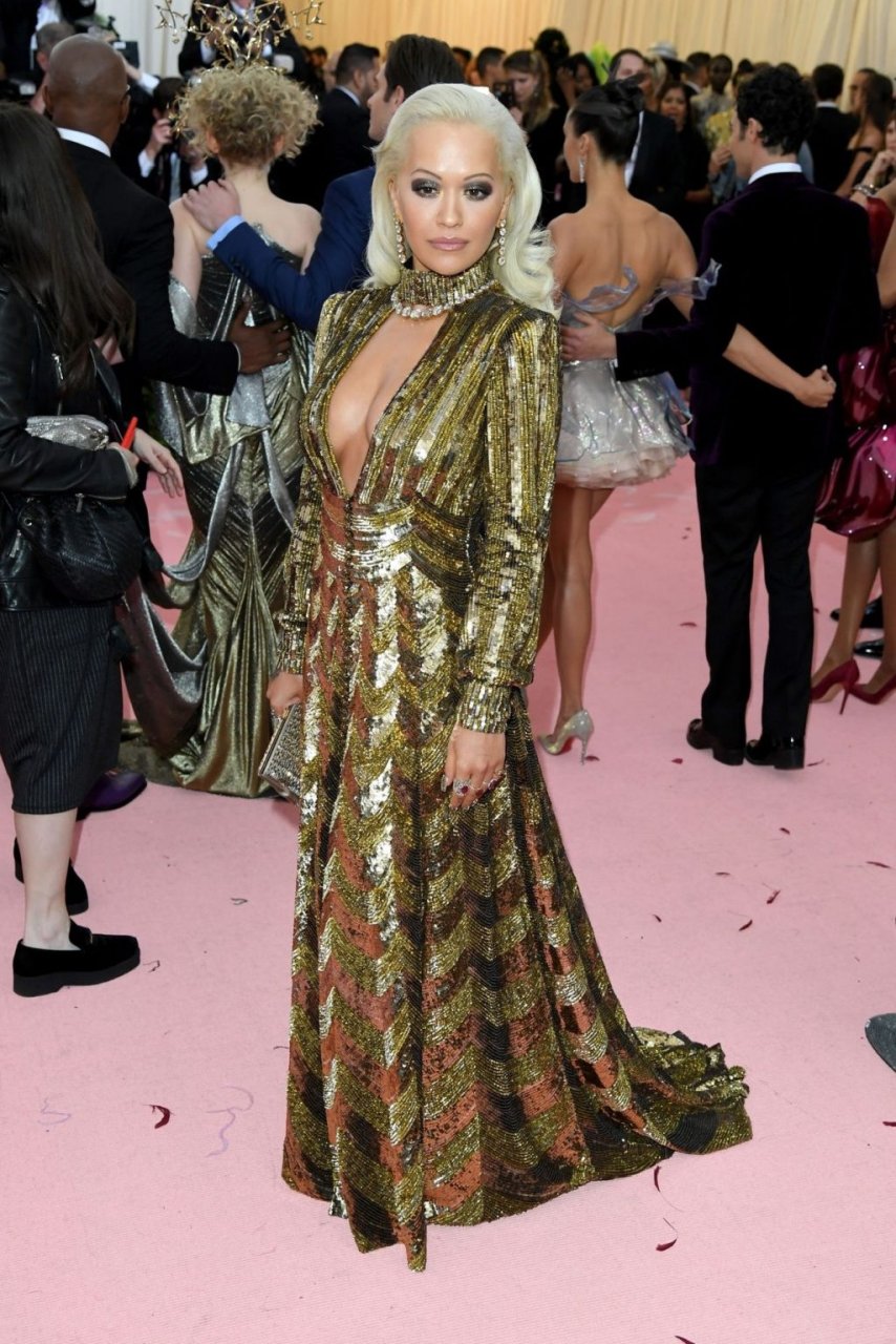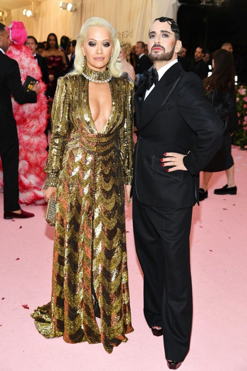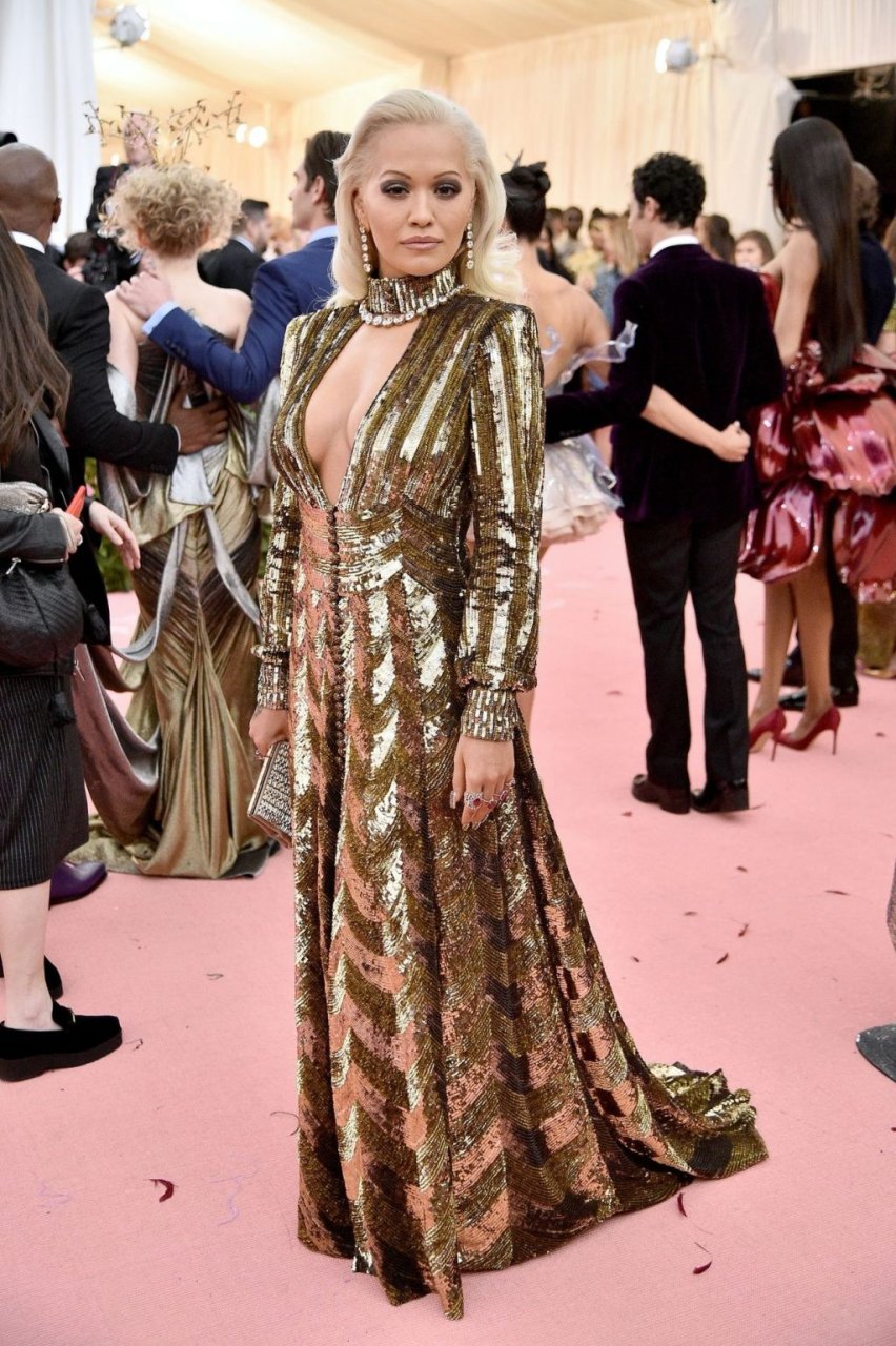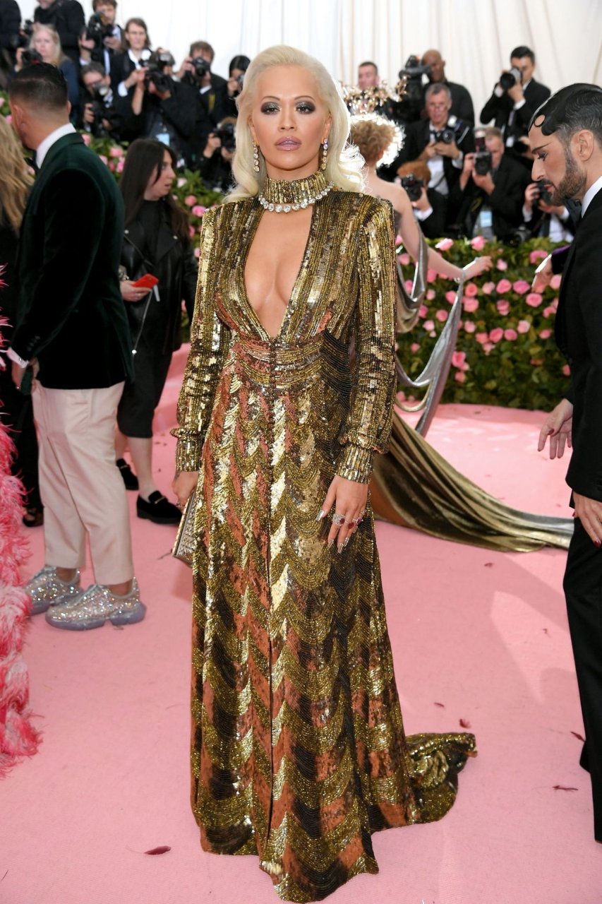 La chanteuse Rita Ora et le mannequin Kate Moss quittent l’hôtel Carlyle pour le Met Gala 2019 à New York, le 06/05/2019. Lors de l’événement, les stars sont apparues ensemble dans des robes dorées et argentées.