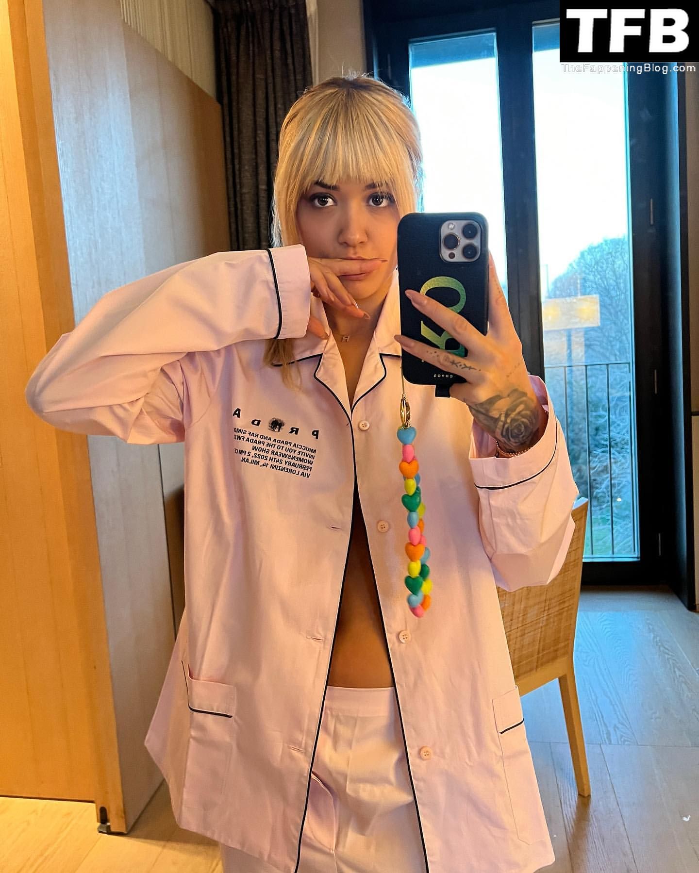 La chanteuse Rita Ora partage quelques photos sexy alors qu’elle pose sans soutien-gorge en Prada pour ses abonnés – Instagram, 24/02/2022.