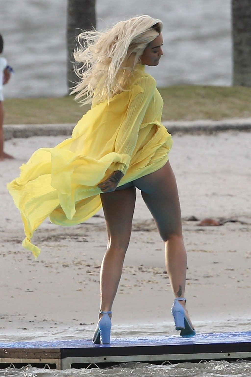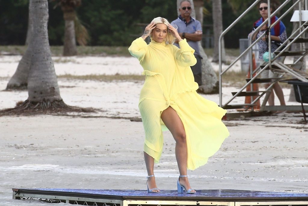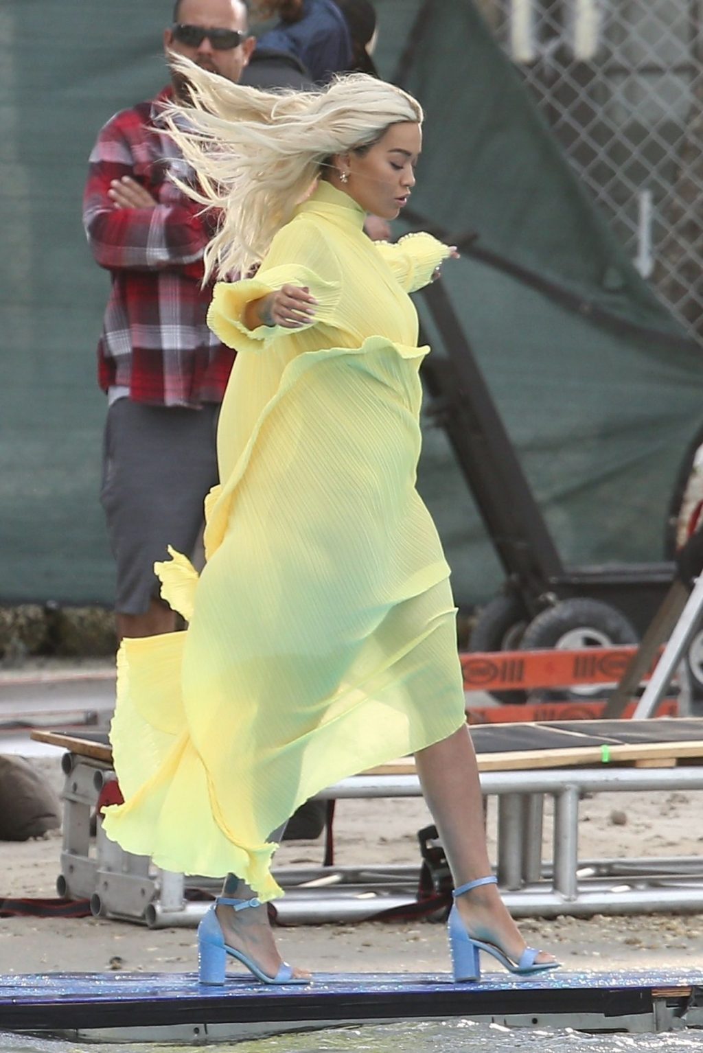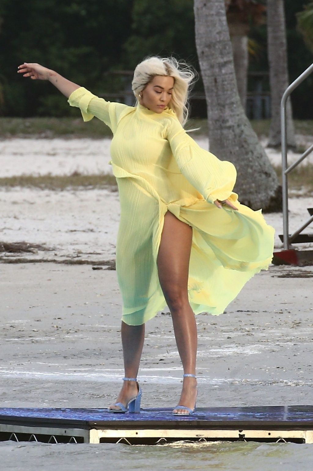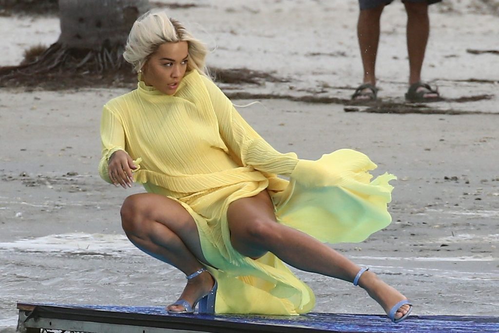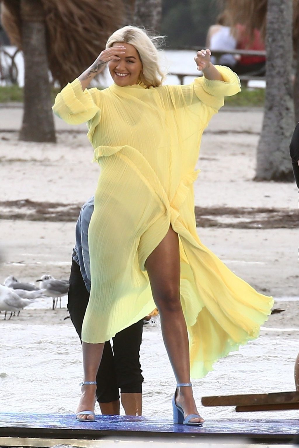 La chanteuse Rita Ora est à Miami pour tourner un clip vidéo et les conditions venteuses ont peut-être révélé plus que ce que la chanteuse avait prévu, 01/10/2020.