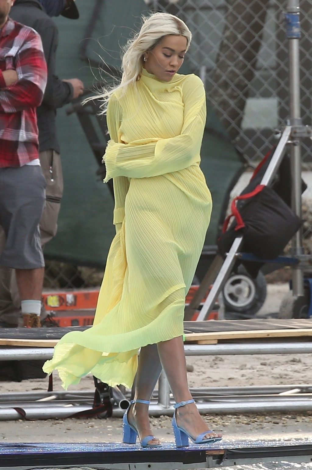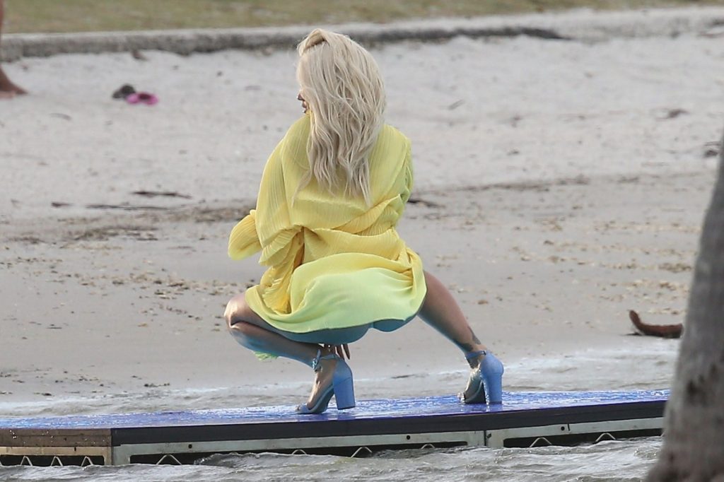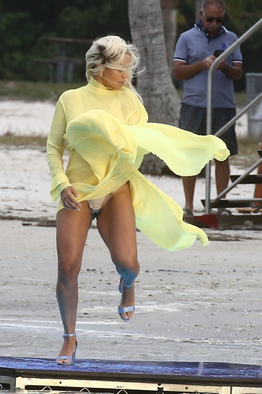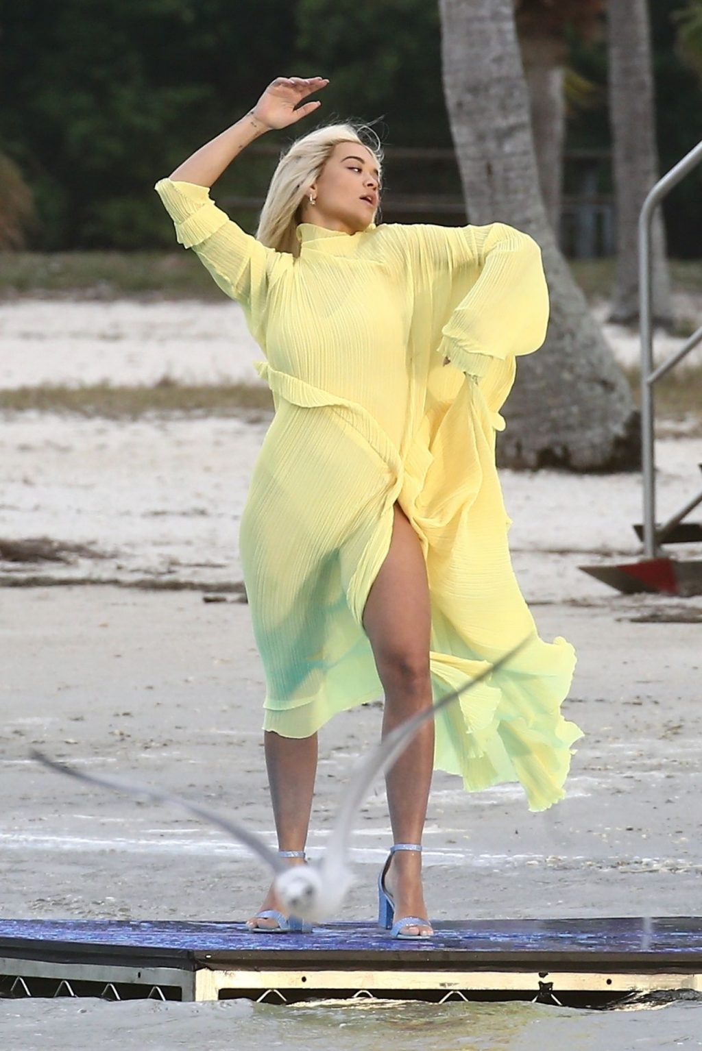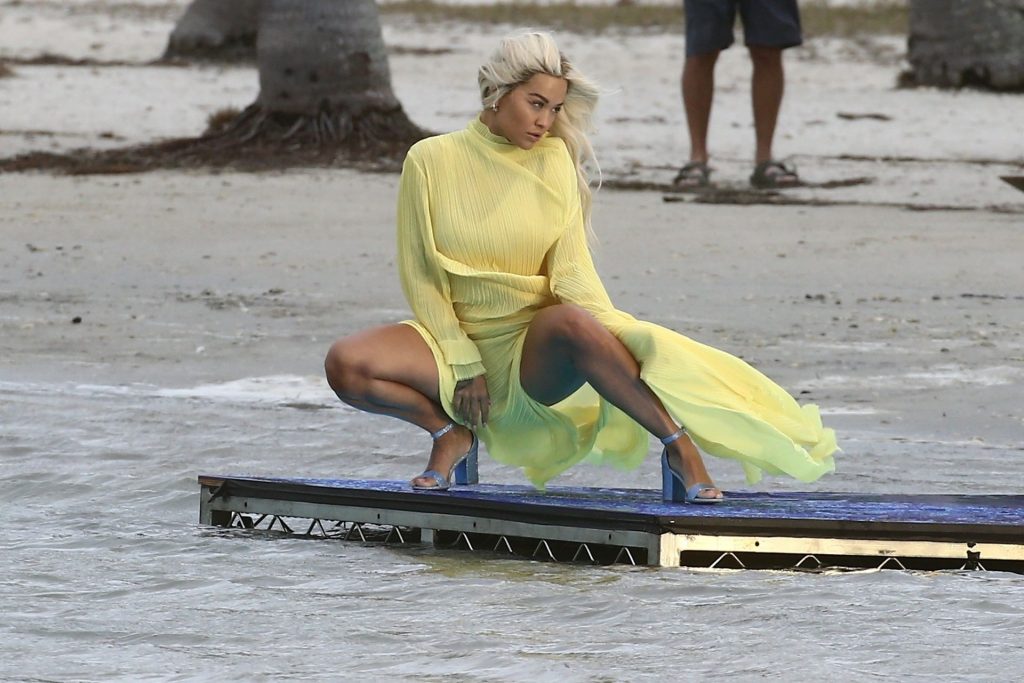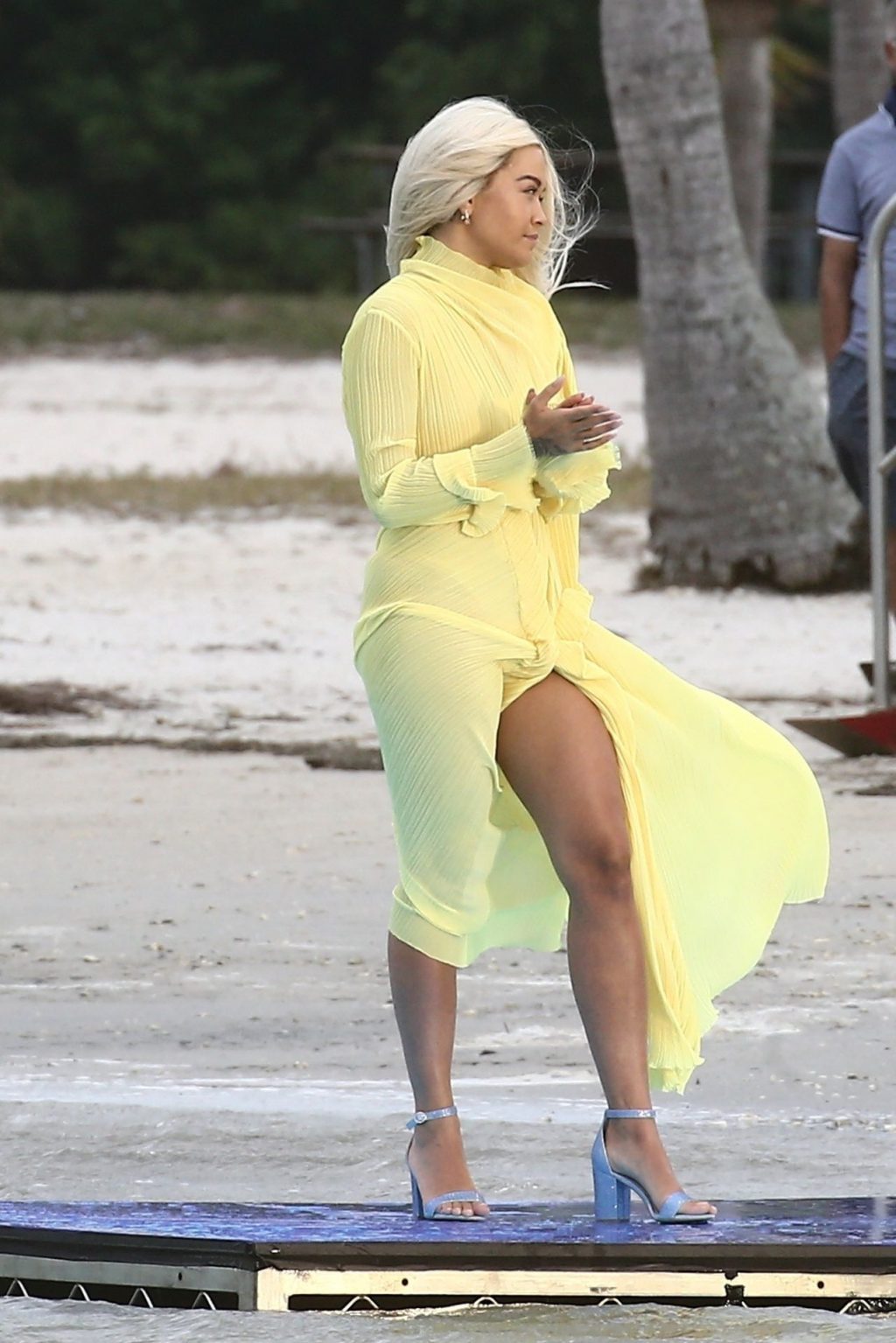 La chanteuse Rita Ora est à Miami pour tourner un clip vidéo et les conditions venteuses ont peut-être révélé plus que ce que la chanteuse avait prévu, 01/10/2020.