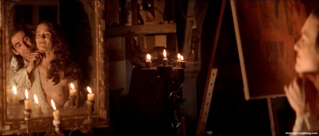Robin Wright is reclined as she poses for an artist, her right breast in view as she is only partially wrapped in some fabric. She eats from a bowl of cherries while talking to a guy.