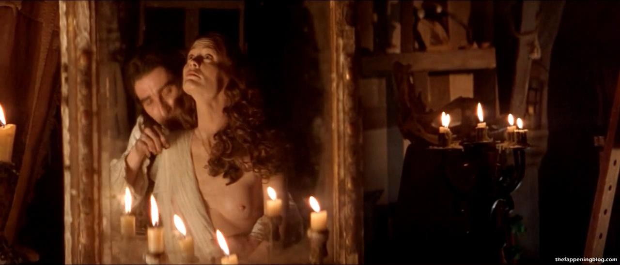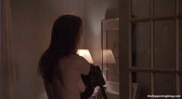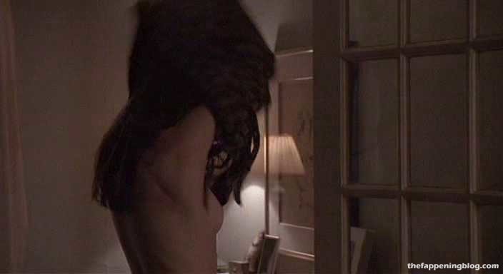 Robin is topless as a guy watches her pull on a sweater and her right breast comes just about completely into view, though her nipple remains just hidden.