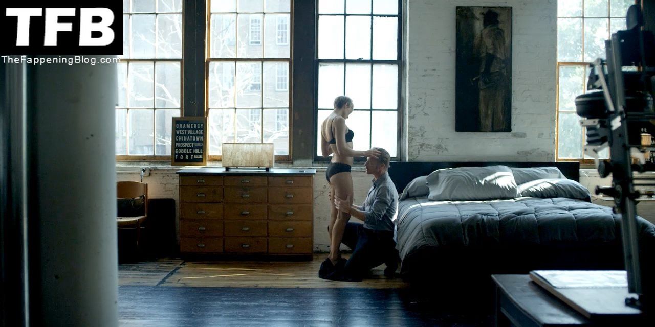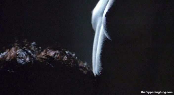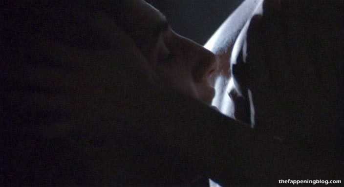 Wright is sitting in front of a mirror with her left breast in view as a guy sits behind her. We then see more of her left breast and her pregnant belly while she reclines on her side, and finally lies on her back next to the guy in bed.