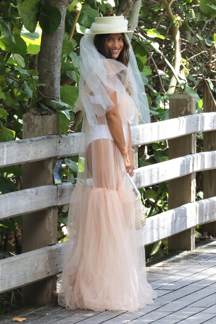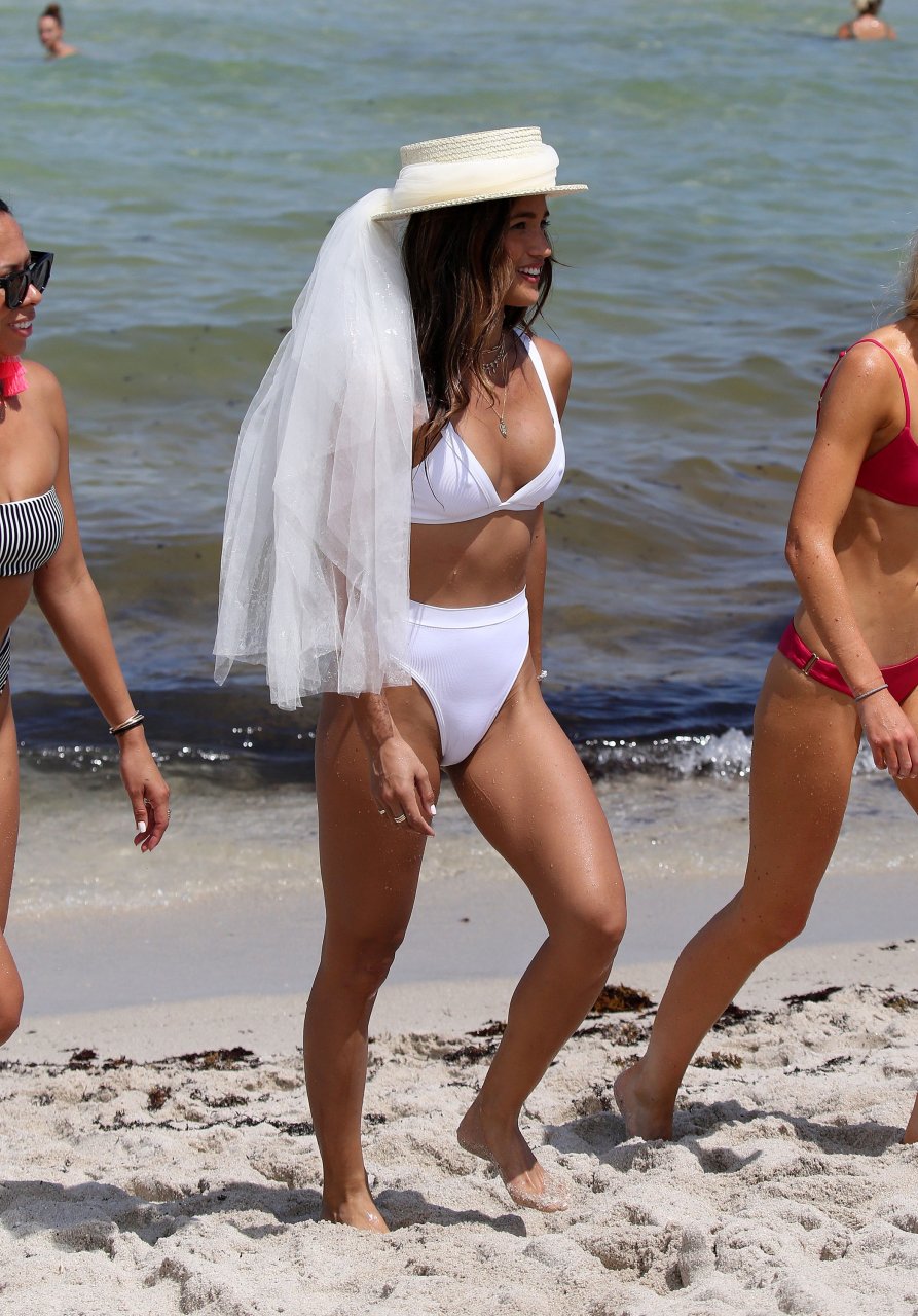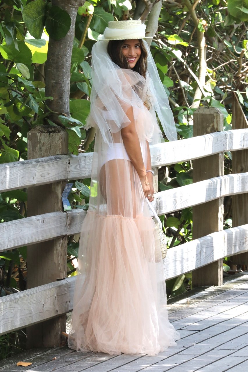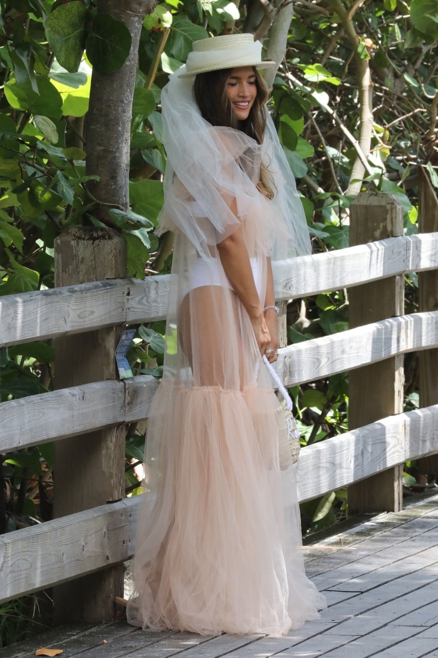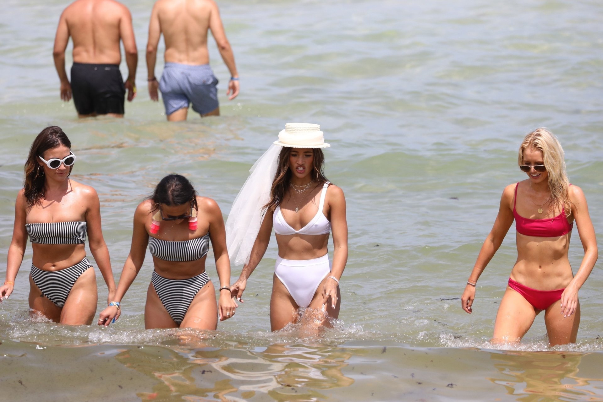 Rocky Barnes réalise une séance photo sur la plage avant son mariage à Miami Beach, le 11/08/2018. Rocky est vue avec ses amies alors qu’elles sautent dans les eaux de Floride en bikini tandis que Rocky porte un voile pour la séance. Rachel (Rocky) Barnes est un mannequin et blogueuse américaine. Née le 12 novembre 1985.